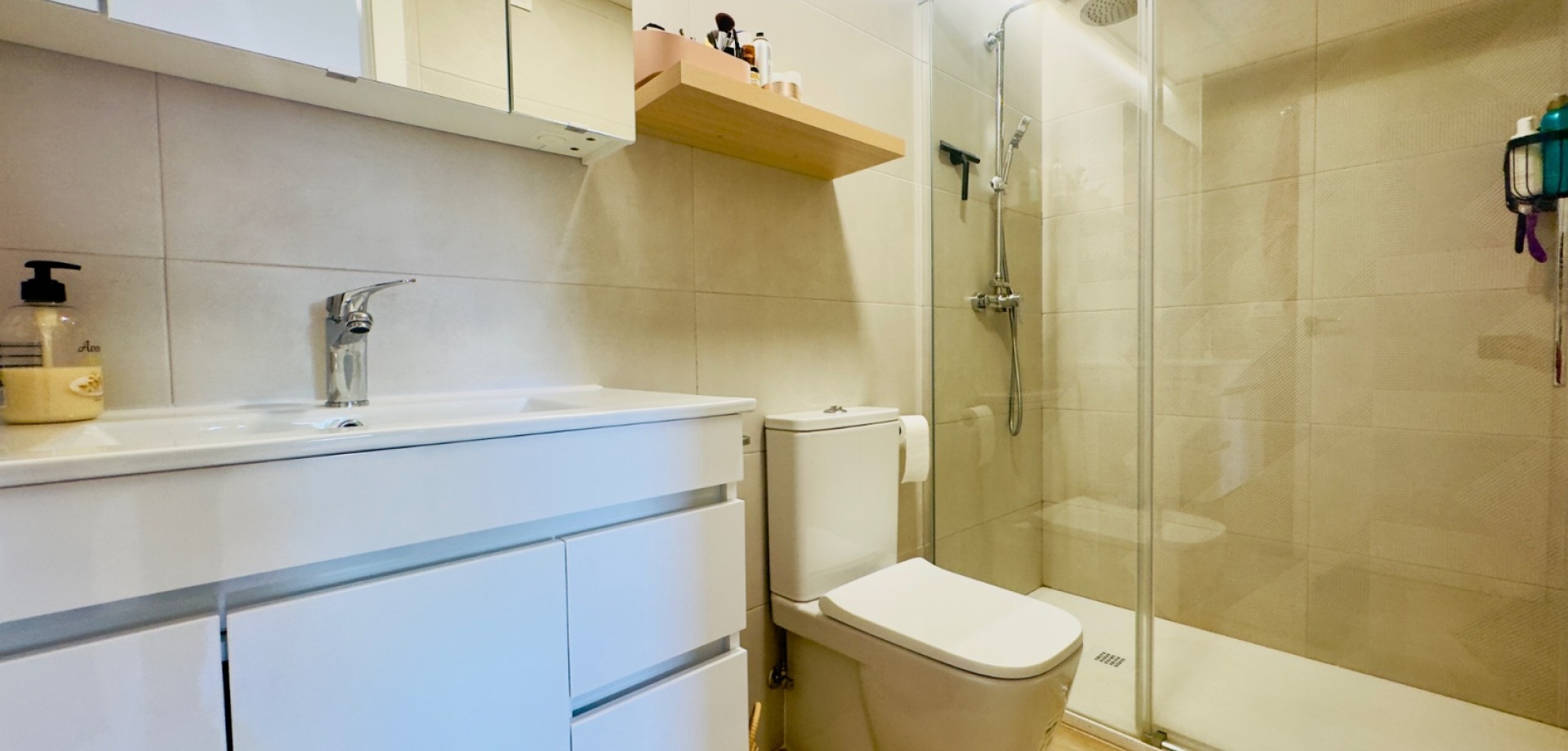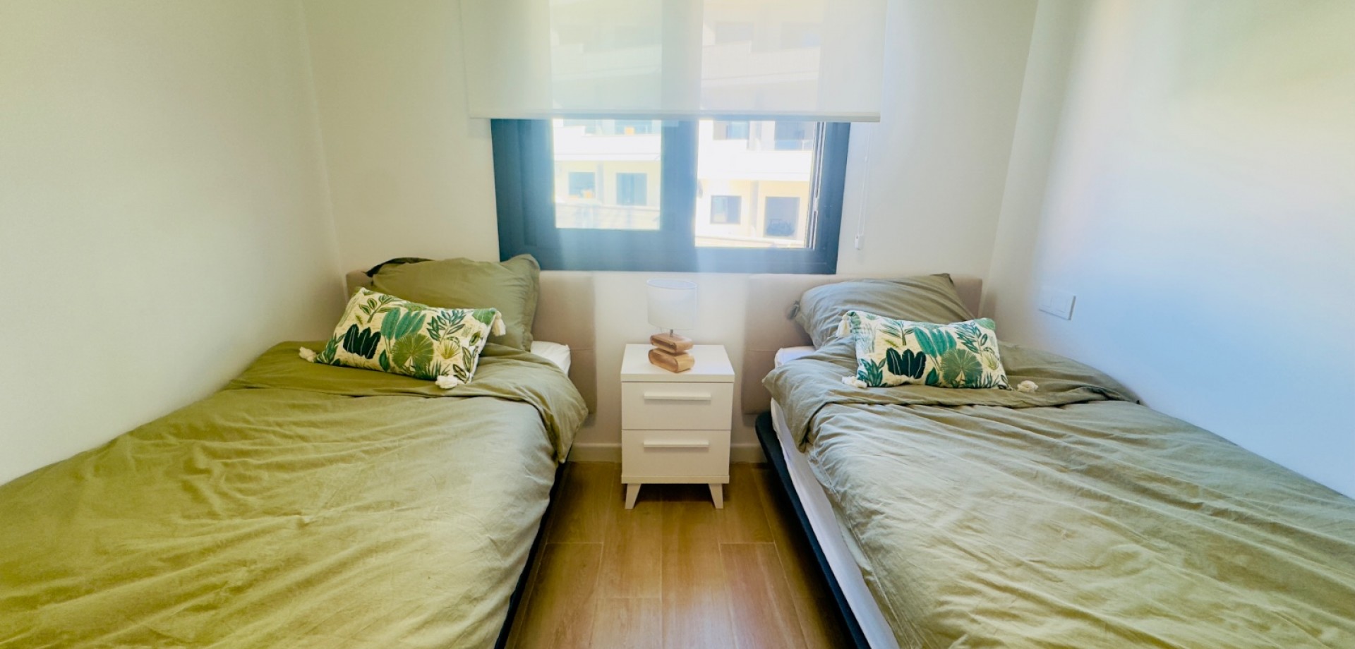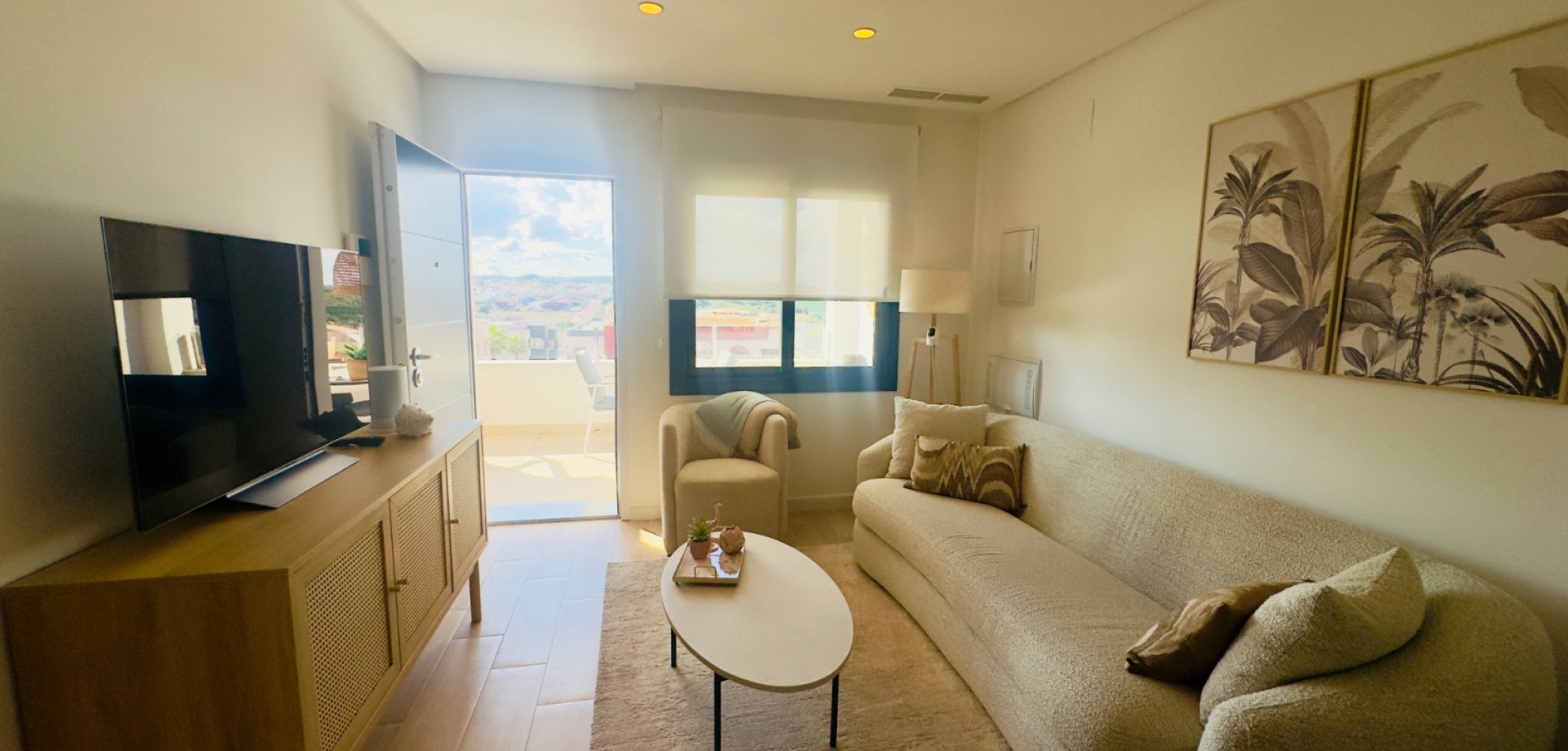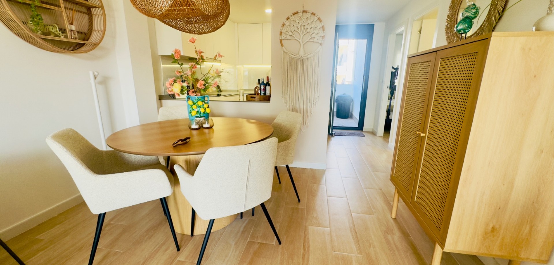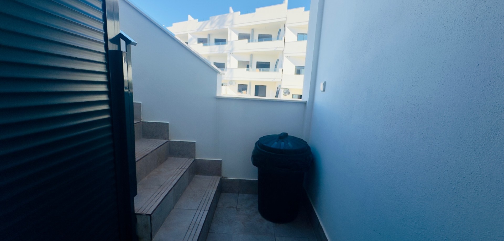 This appealing penthouse offers a perfect combination of modern design, comfort, and a privileged location in the sought-after area of Orihuela Costa. Situated in a well-maintained and secure community, this property presents an excellent option as a permanent residence, holiday home, or investment for vacation rentals. With a built area of 78 m², the apartment features two spacious bedrooms and two full bathrooms, one of which is en suite in the master bedroom. All spaces are carefully furnished and decorated in a contemporary, cozy style, ready to move in from day one. The open-plan layout of the living room, dining area, and kitchen creates a wide and bright environment, ideal for relaxing or enjoying family moments. The kitchen is fully equipped and integrates perfectly with the social area of the home. Comfort is guaranteed year-round thanks to air conditioning installed in every room. In addition, the west-facing orientation allows for spectacular sunsets from the private terraces. One of the major attractions of this home is its impressive private solarium of 78 m², an ideal space to enjoy the Mediterranean climate. This outdoor area has an exterior shower, storage space, and plenty of room to create a relaxation area, outdoor dining, or even a chill-out corner. The property also includes a private parking space within the community grounds. Among the communal areas, you can enjoy a large community pool surrounded by green areas, a well-equipped gym, a shared working space, and even a ping-pong table for leisure moments. The location is unbeatable: just a few minutes’ walk from bars, cafés and restaurants; only 5 minutes on foot from the Aldi supermarket; and 3 minutes by car from the beaches of Punta Prima. Everything you need is within reach, without giving up the tranquility and privacy this home offers. A unique property that combines style, functionality, and location. Perfect for those seeking quality of life on the Costa Blanca.