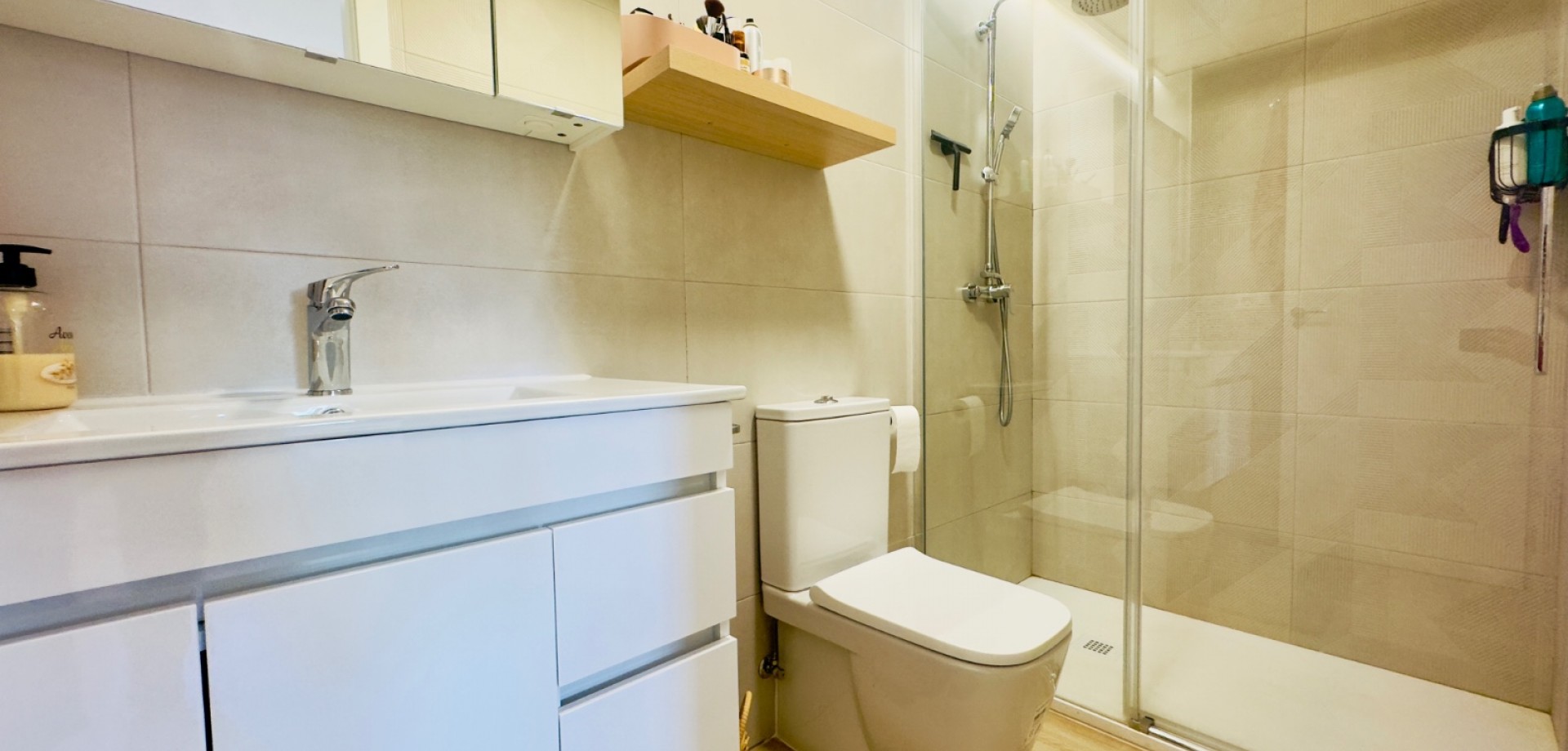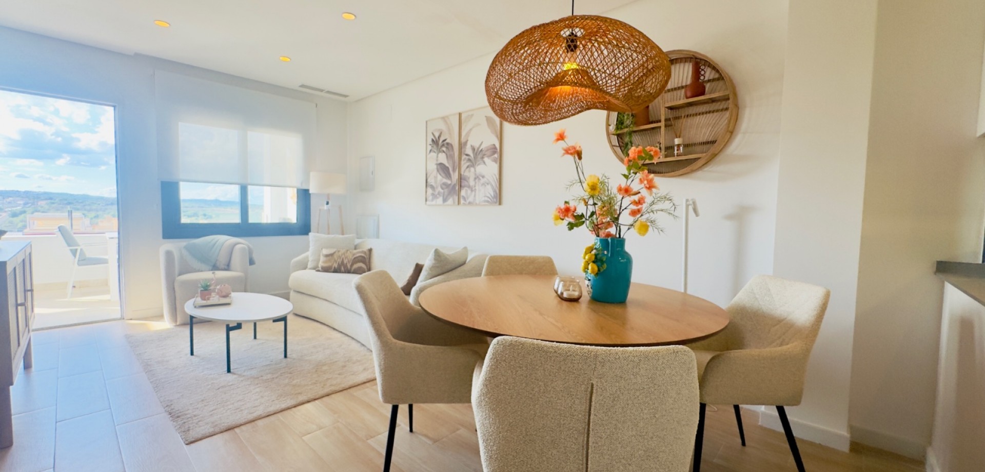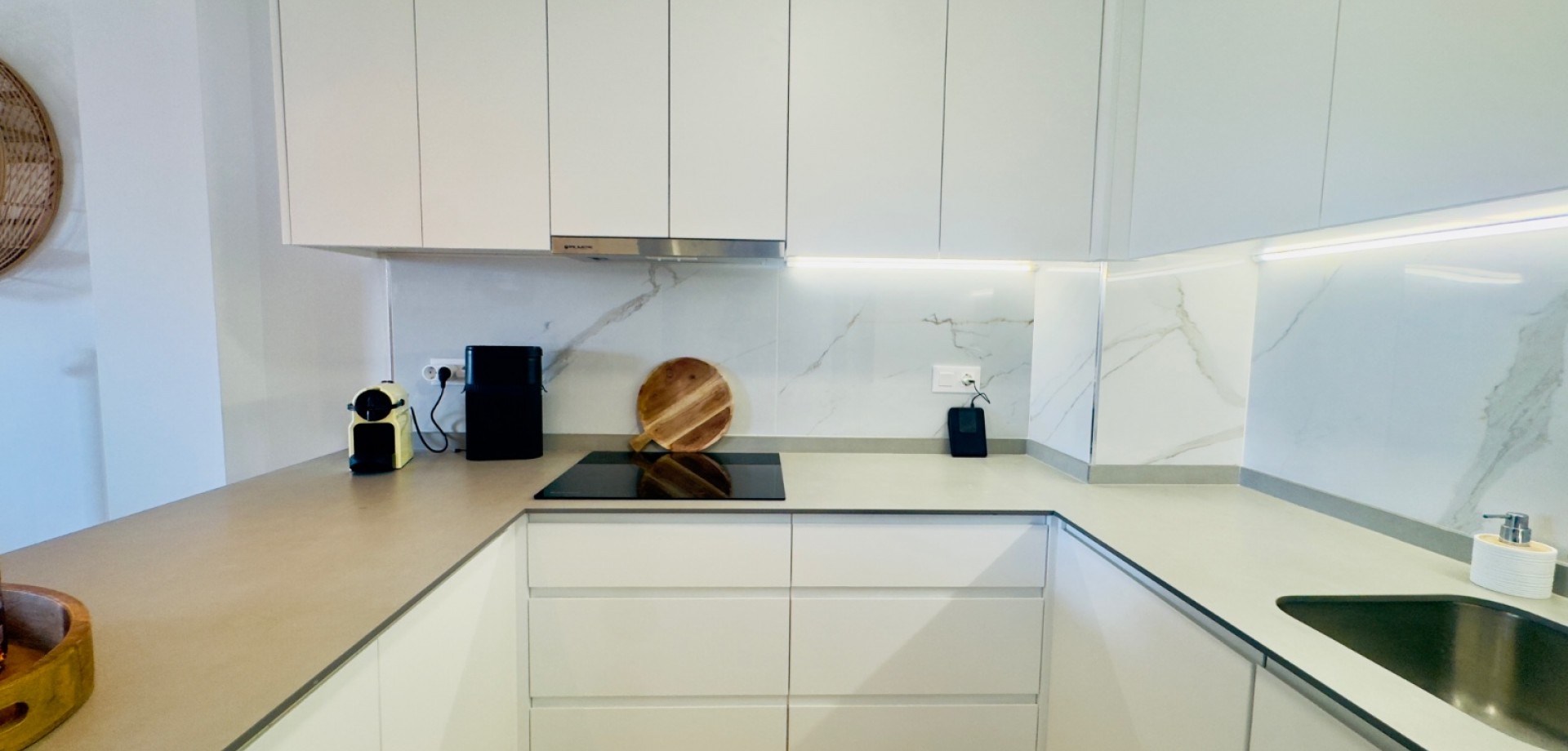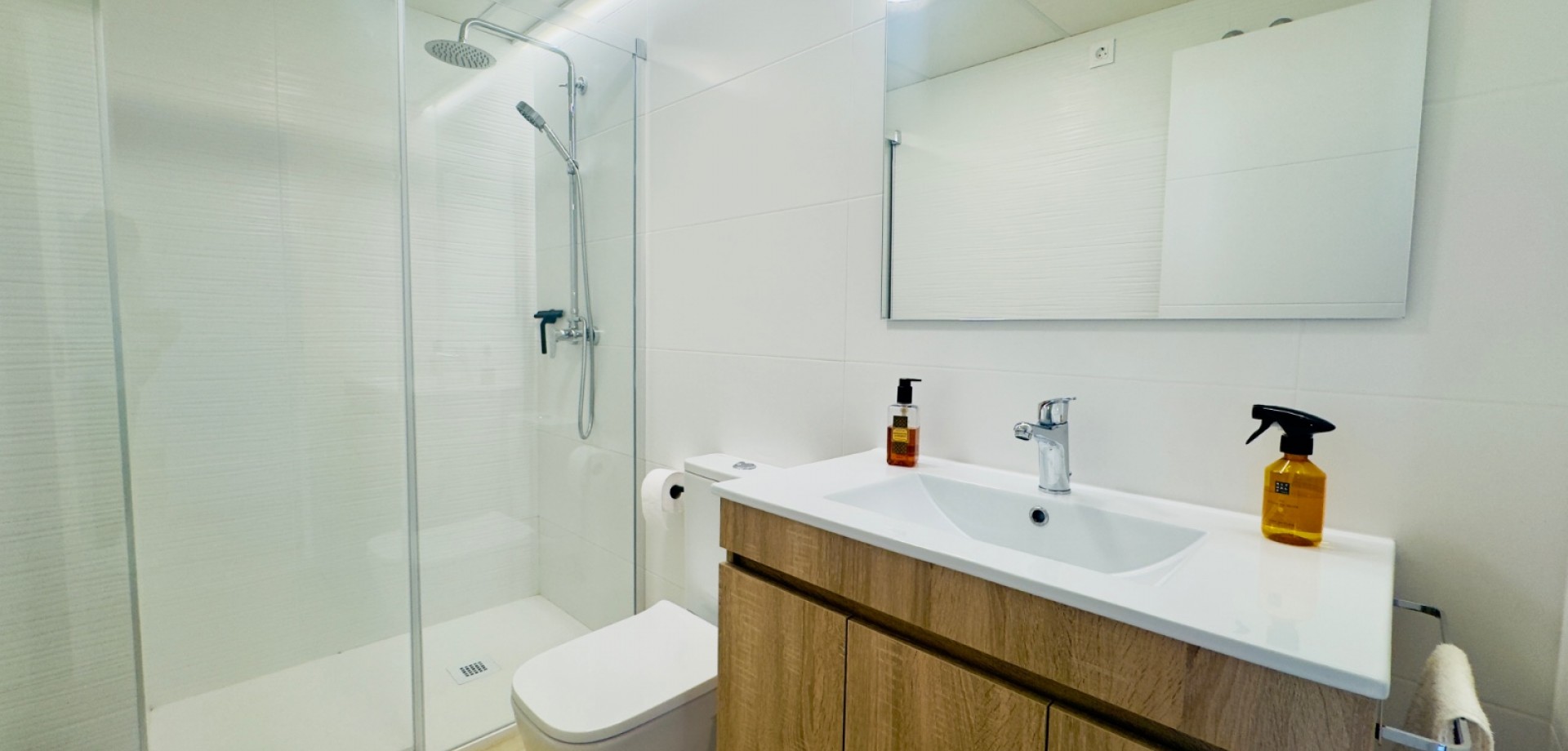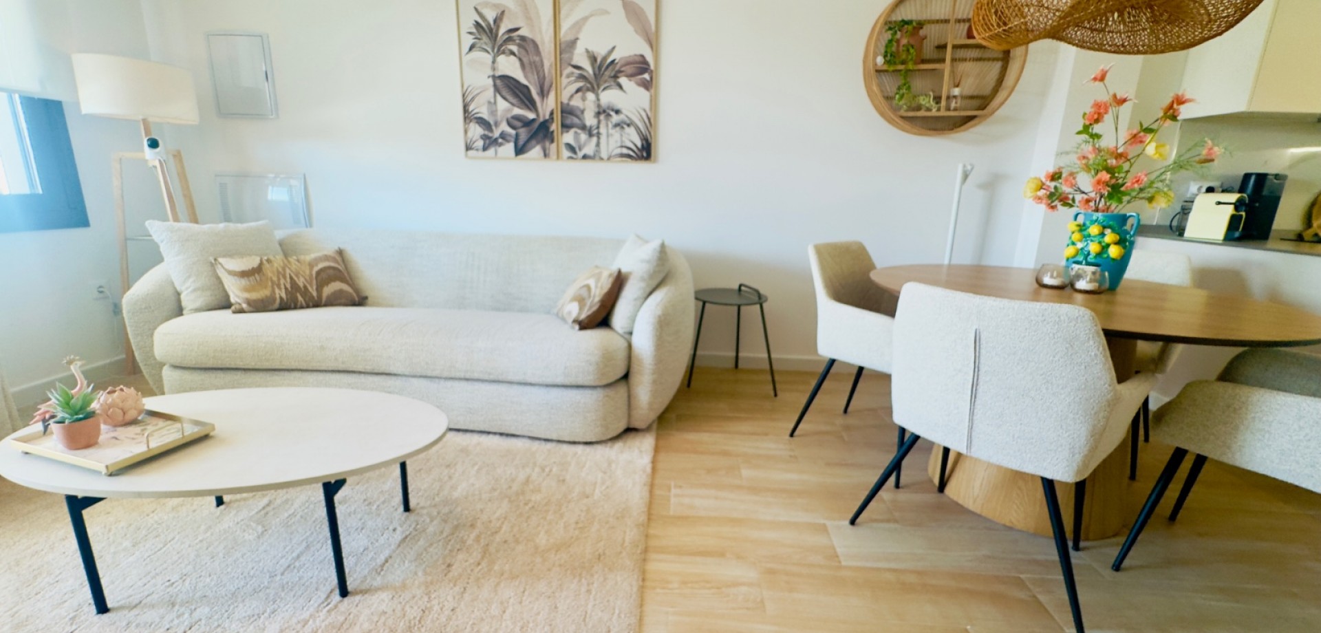 This appealing penthouse offers a perfect combination of modern design, comfort, and a privileged location in the sought-after area of Orihuela Costa. Situated in a well-maintained and secure community, this property presents an excellent option as a permanent residence, holiday home, or investment for vacation rentals. With a built area of 78 m², the apartment features two spacious bedrooms and two full bathrooms, one of which is en suite in the master bedroom. All spaces are carefully furnished and decorated in a contemporary, cozy style, ready to move in from day one. The open-plan layout of the living room, dining area, and kitchen creates a wide and bright environment, ideal for relaxing or enjoying family moments. The kitchen is fully equipped and integrates perfectly with the social area of the home. Comfort is guaranteed year-round thanks to air conditioning installed in every room. In addition, the west-facing orientation allows for spectacular sunsets from the private terraces. One of the major attractions of this home is its impressive private solarium of 78 m², an ideal space to enjoy the Mediterranean climate. This outdoor area has an exterior shower, storage space, and plenty of room to create a relaxation area, outdoor dining, or even a chill-out corner. The property also includes a private parking space within the community grounds. Among the communal areas, you can enjoy a large community pool surrounded by green areas, a well-equipped gym, a shared working space, and even a ping-pong table for leisure moments. The location is unbeatable: just a few minutes’ walk from bars, cafés and restaurants; only 5 minutes on foot from the Aldi supermarket; and 3 minutes by car from the beaches of Punta Prima. Everything you need is within reach, without giving up the tranquility and privacy this home offers. A unique property that combines style, functionality, and location. Perfect for those seeking quality of life on the Costa Blanca.