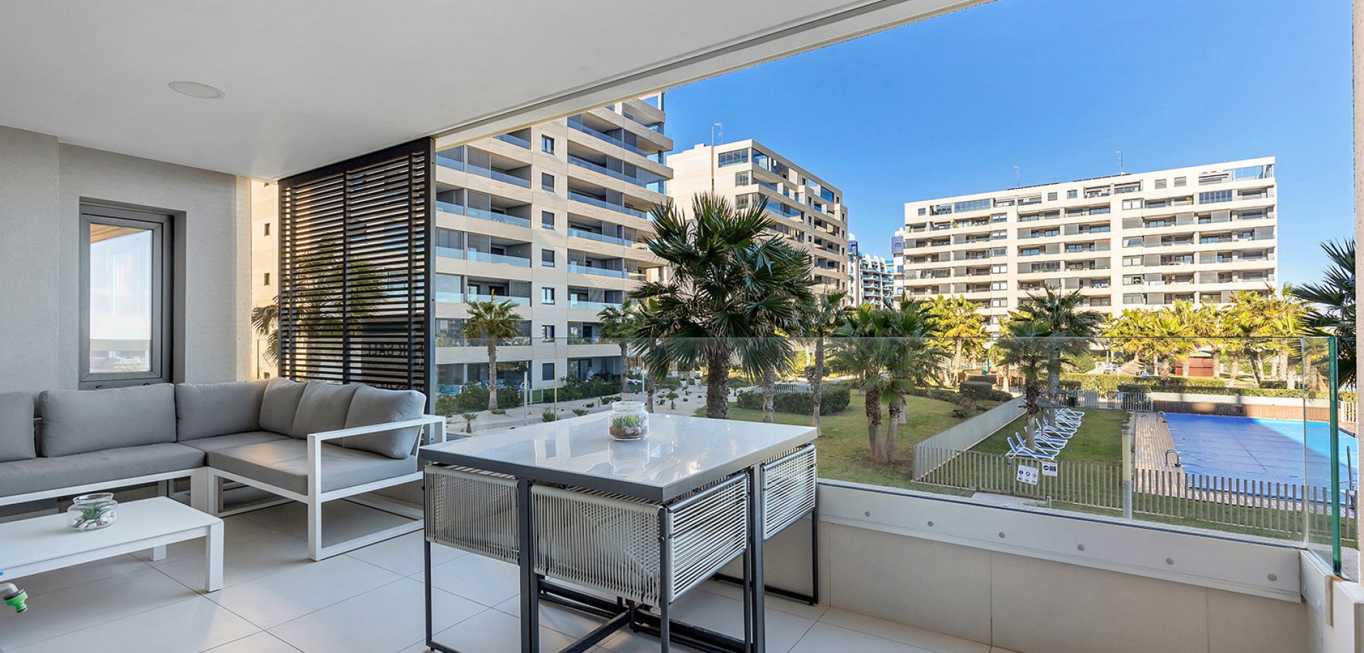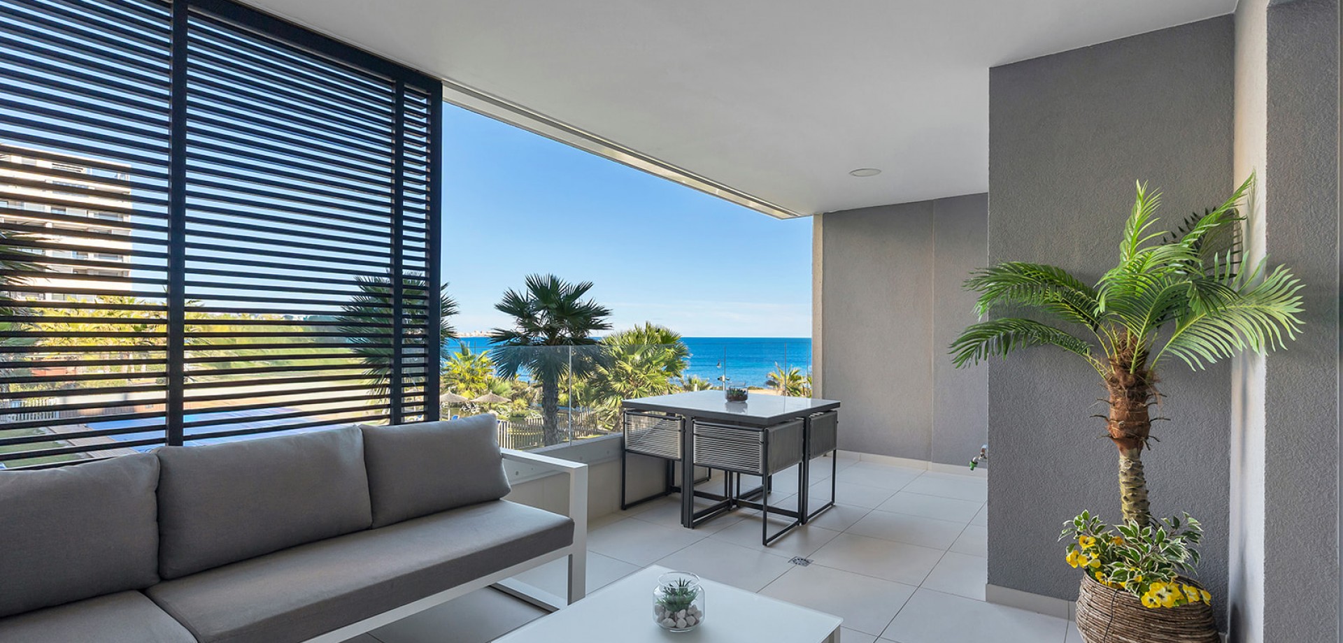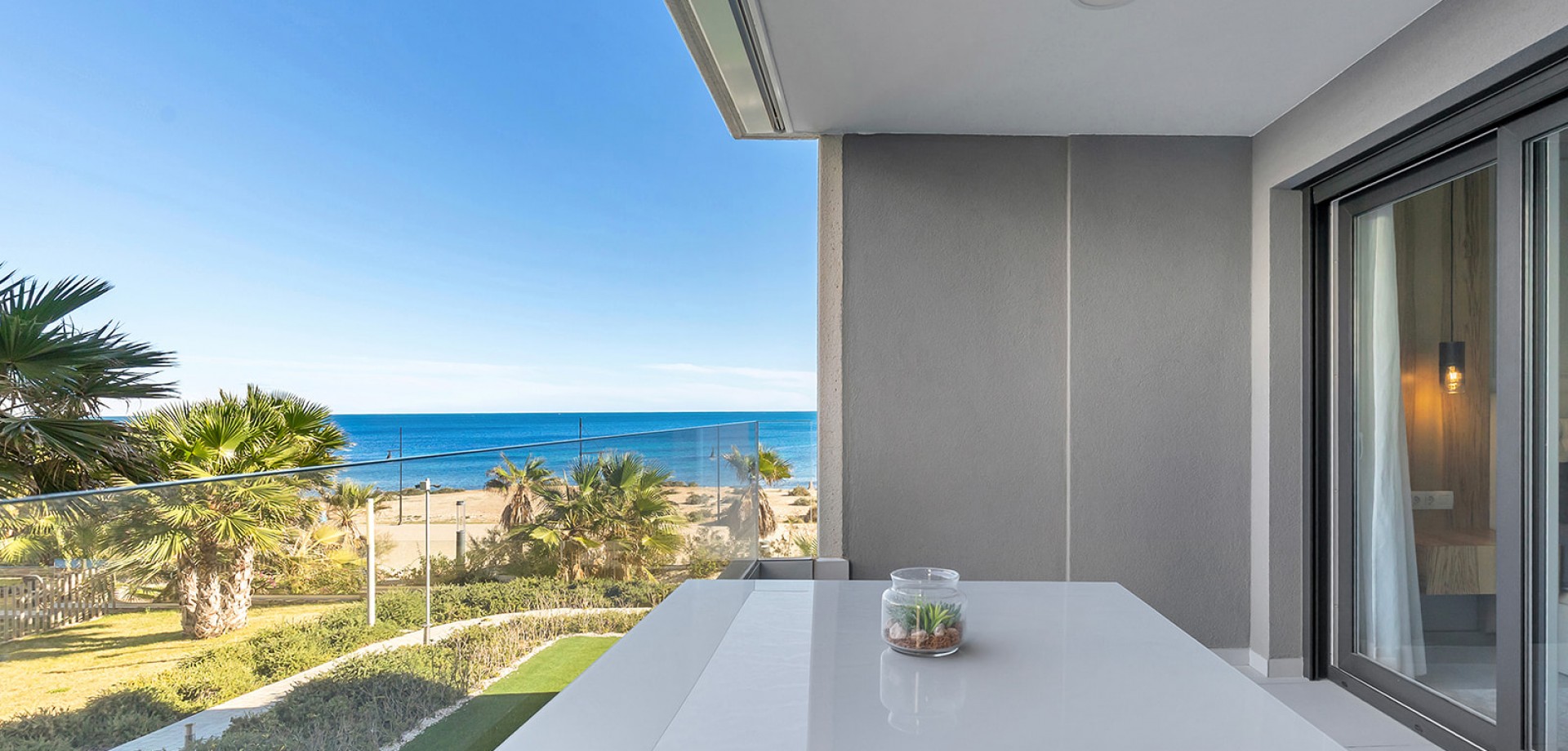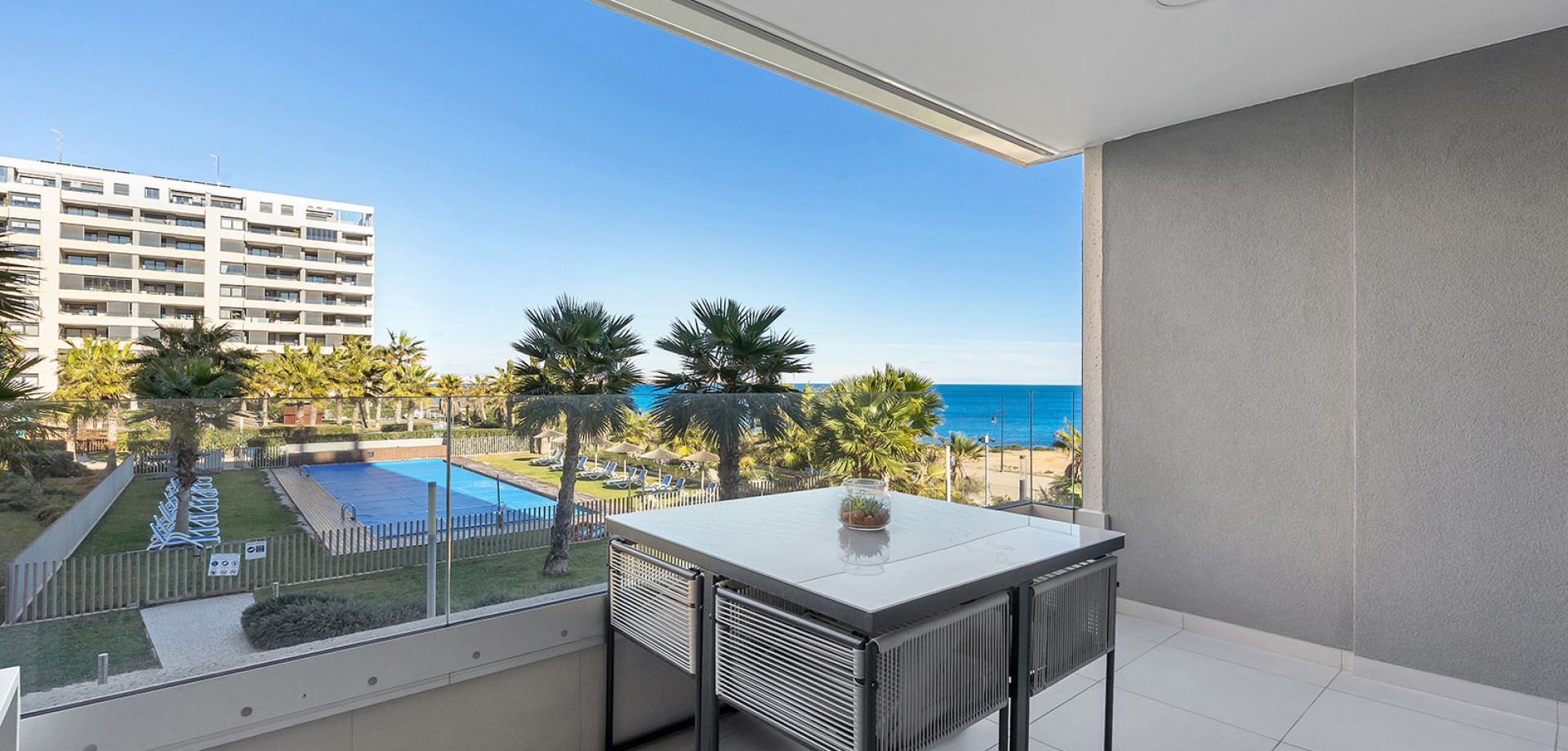 This elegant 2-bedroom, 2-bathroom apartment is located frontline, offering stunning open sea views. Its modern and bright design creates a cozy and relaxing atmosphere, ideal both for year-round living and for enjoying holiday stays. The apartment is sold fully furnished, equipped with high-quality furniture in harmonious tones and wooden details that add warmth and style. The layout is functional and comfortable, with spacious and well-utilized areas. In the area, you will find pools, including a heated pool, and a paddle tennis court, perfect for enjoying leisure time and sports activities without leaving the complex. This property also includes underground parking and a private storage room, providing additional practicality to your living experience. Located in Punta Prima, one of the most sought-after areas of the Costa Blanca, the apartment offers a peaceful and safe environment, close to the beach, with easy access to supermarkets, restaurants, bars, and local services. The area is ideal for sea and nature lovers and is a short drive from shopping centers, golf courses, and other Costa Blanca attractions.