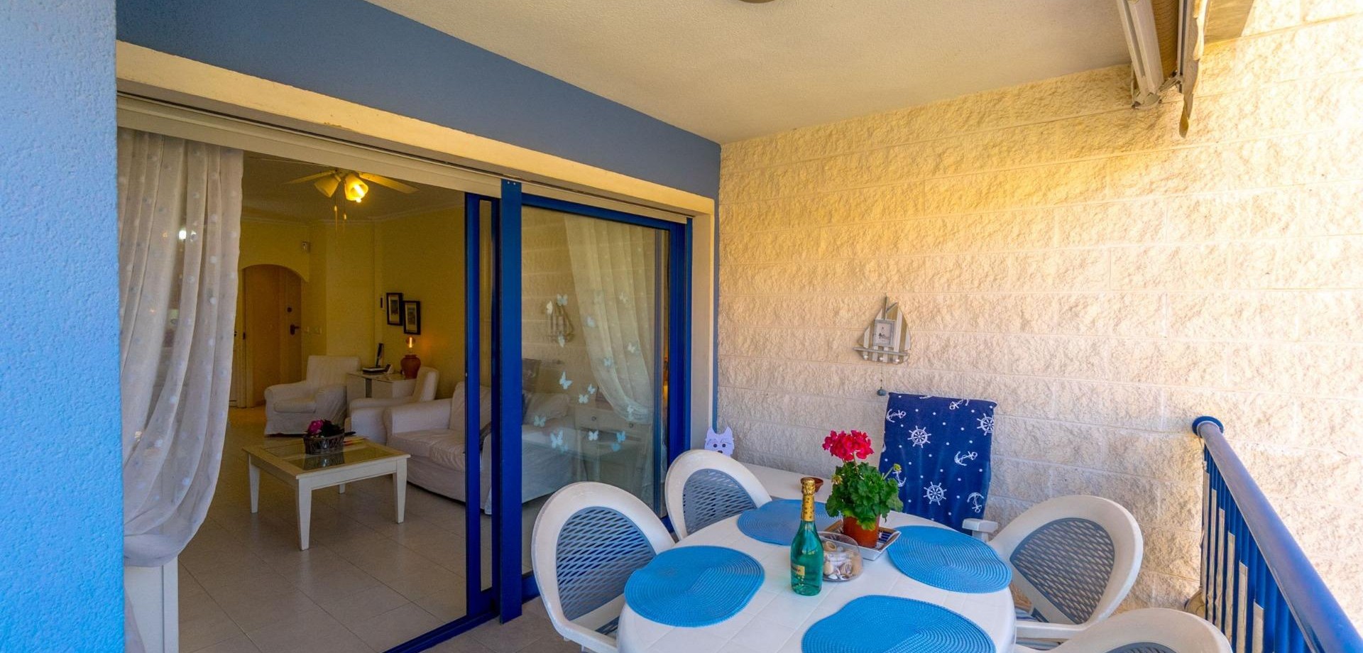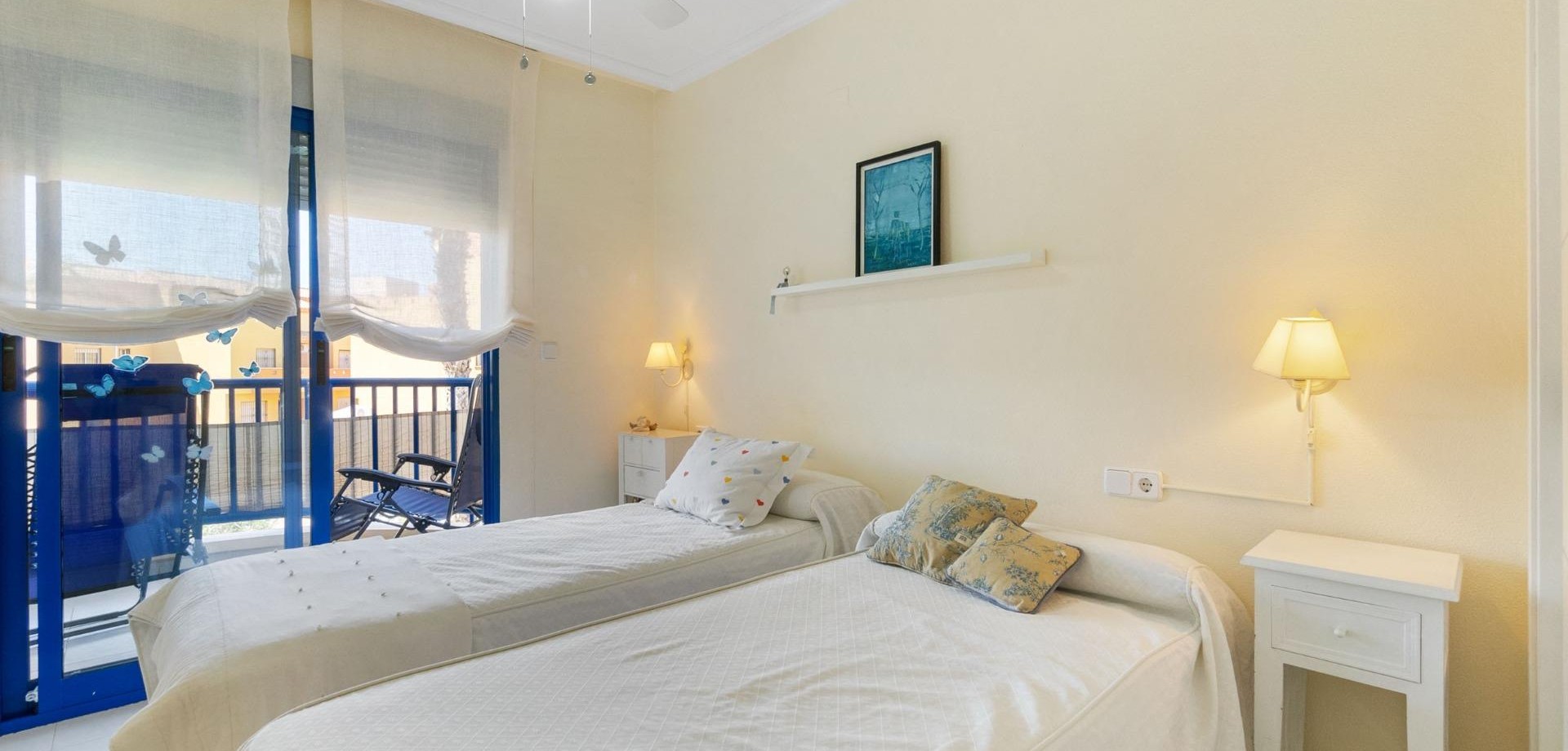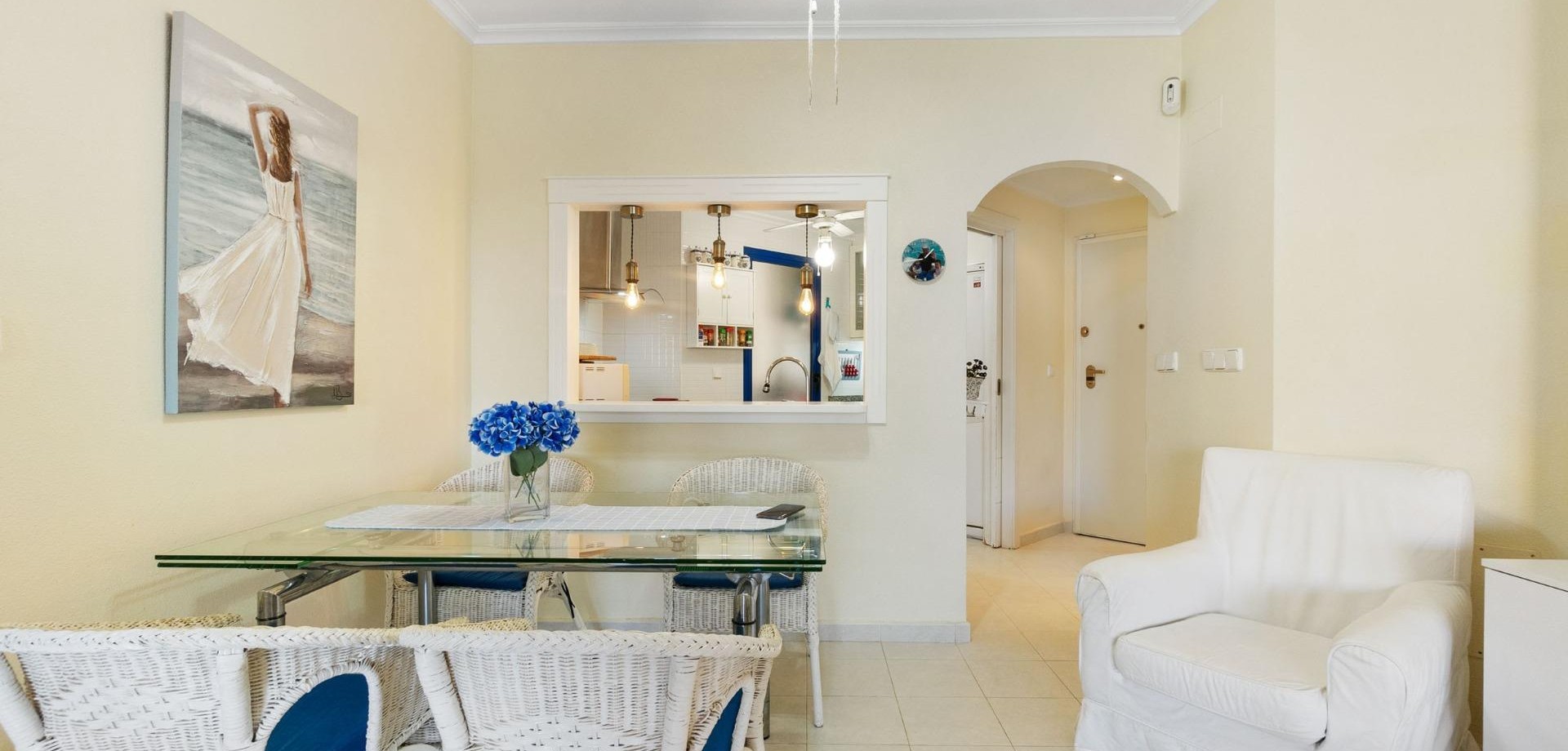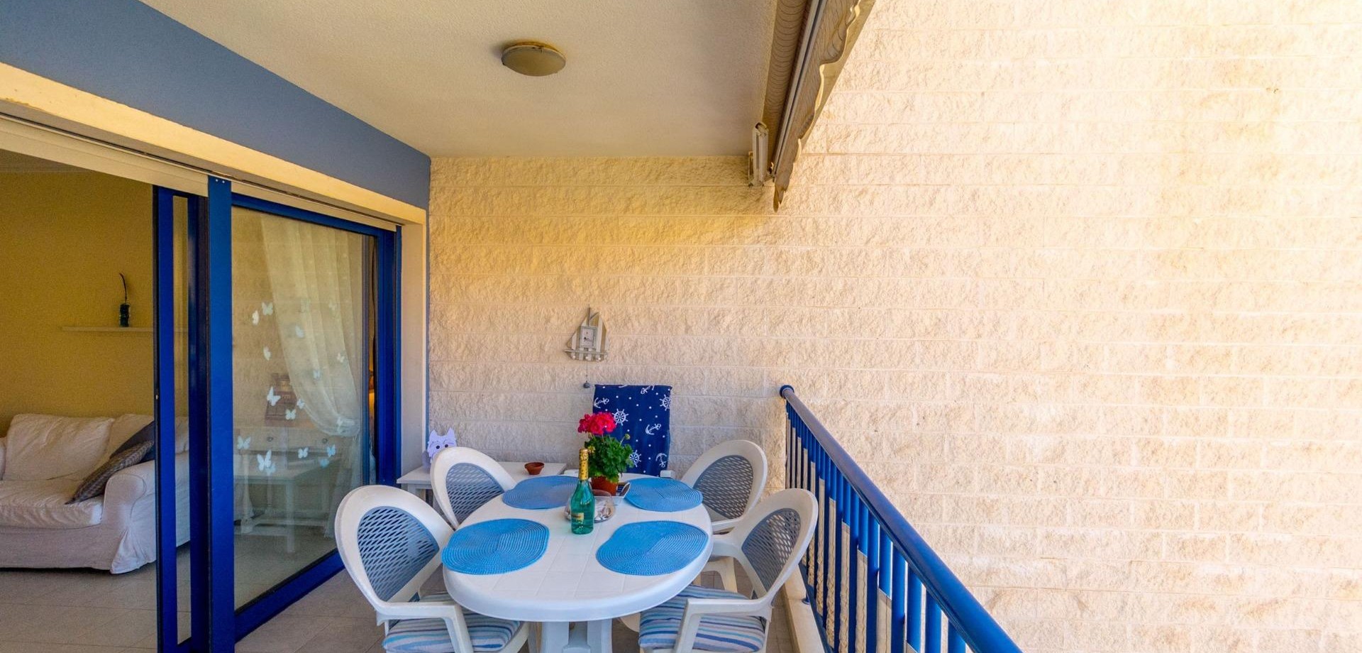 This spacious and bright apartment is located in the exclusive Aguamarina residential complex, Punta Glea, on the beachfront, with direct access to the seafront promenade. Located on the first floor, it faces southeast to enjoy the sun almost all day long. With a surface area of 78 m2, it has a very convenient layout, offering comfort and functionality.~The apartment has two large bedrooms, each with built-in wardrobes, providing plenty of storage space, and two full bathrooms.~The separate kitchen is fully equipped and includes a laundry room. A bright living-dining room and a large terrace, accessible from the living room and the master bedroom, are the perfect place to enjoy views of the complex's gardens and the sea. The apartment is sold partially furnished and has ducted air conditioning. The apartment also comes with a parking space in the underground garage.~The residential complex has a spectacular swimming pool, surrounded by gardens, ideal for enjoying sunny days and relaxing just steps from the sea. An unbeatable location, with the convenience of being right on the beach and with all amenities within walking distance.~