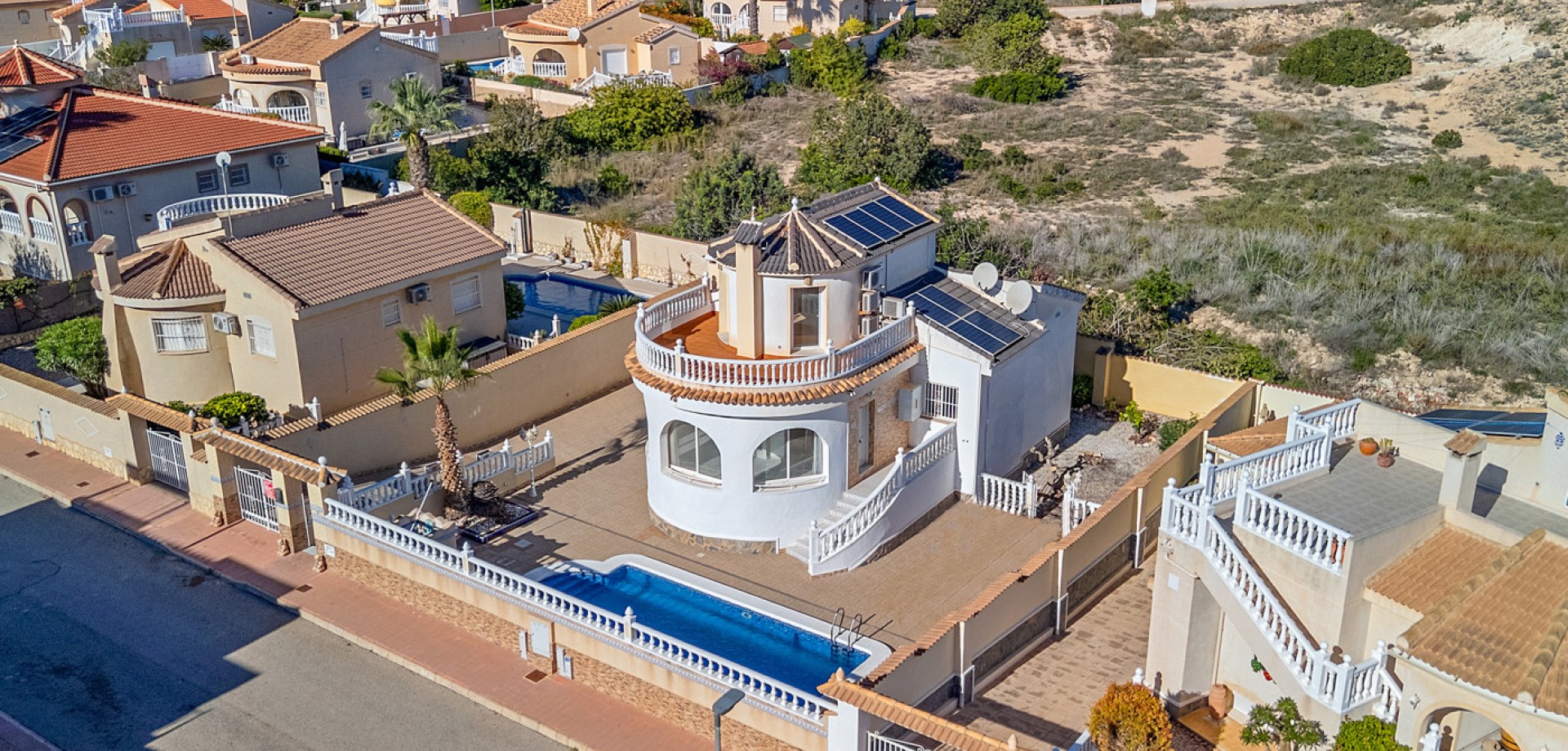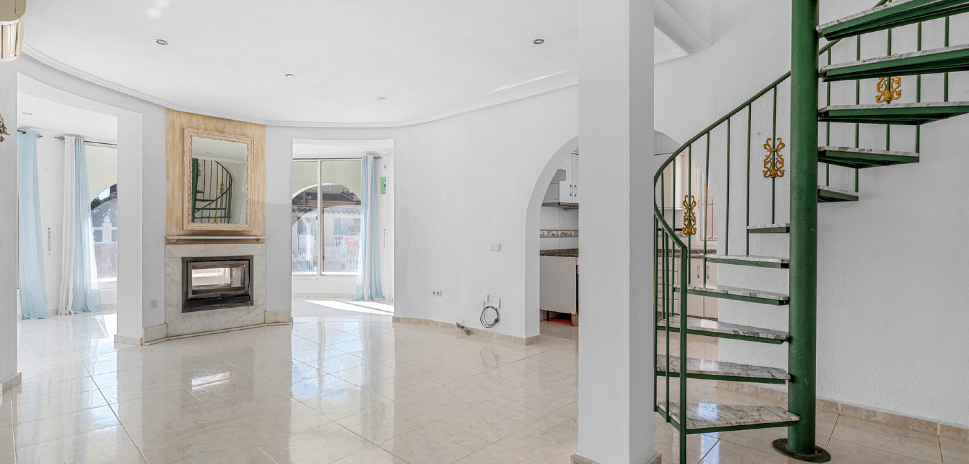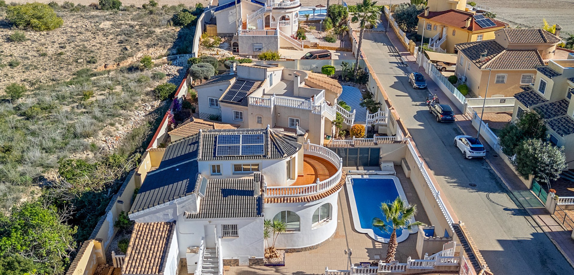 Please note: Photos with furniture are home-staged visualizations meant to show how the home could look when furnished, including a new kitchen and new bathrooms. The property is currently empty. ___________________________________________________________________________________________________________________________________ Dreaming of a villa with character, space, and one of the best locations in Rojales? This lovely resale villa offers a generous 160 m² distributed over 4 bright bedrooms and 2 well-designed bathrooms – perfect for family life, holidays, and relaxation. The house was built in 2002 and is sold unfurnished, giving you complete freedom to create the home you’ve always imagined. To help you get inspired, we have created renovation and interior design suggestions that show how the villa can be transformed into a modern and inviting home. If you would like assistance with the process, our service team is ready to offer professional guidance. The villa faces south, meaning plenty of sunlight and warmth throughout the day – both indoors and outdoors. Outside, a private swimming pool awaits, allowing you to enjoy the fantastic climate all year round. From both the house and the plot, you can enjoy impressive views of the mountains, landscape, lake, and sea, creating a peaceful and scenic setting for everyday living. The villa is equipped with solar panels for electricity, helping to keep your energy costs low. Rojales is known for its charming atmosphere with cosy cafés, local specialty shops, and beautiful natural surroundings. It offers an active and pleasant community where both families and lifestyle-seekers feel at home. La Marquesa Golf is located close by – a major plus for golf enthusiasts and those who appreciate green surroundings. Contact us today for more information or to arrange a viewing. This villa gives you the opportunity to live with views of it all – in bright, spacious, and comfortable surroundings, where the potential is just as impressive as the scenery.