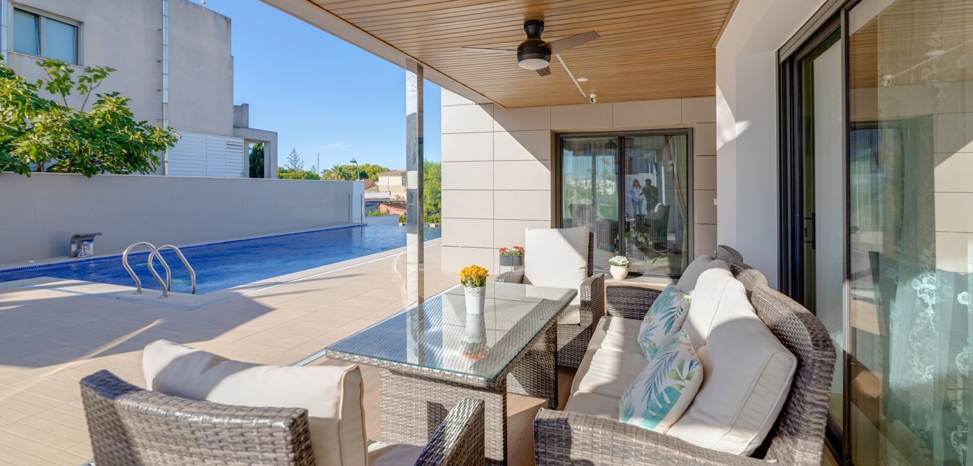 Inside, an elegant foyer opens to the villa’s main living areas. A spacious dining room with large floor-to-ceiling windows opens directly onto the pool terrace, creating an effortless indoor-outdoor flow.