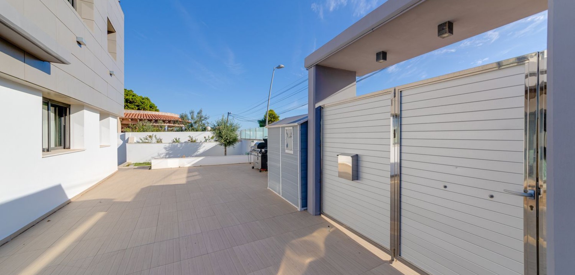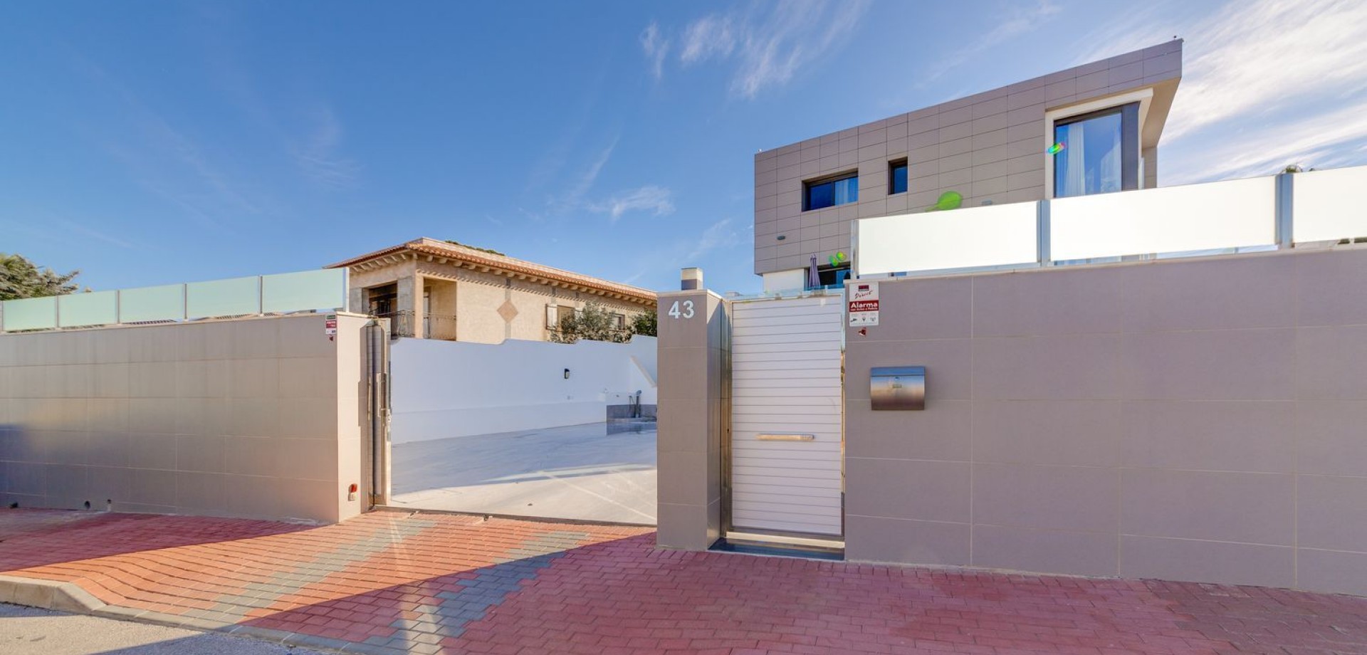The secondary entrance, located on the lower level, grants direct access to a spacious parking area with capacity for approximately five vehicles, plus a fully enclosed garage for one more. The parking entrance is designed to easily accommodate a caravan or large vehicle, showcasing the practicality behind the luxury.