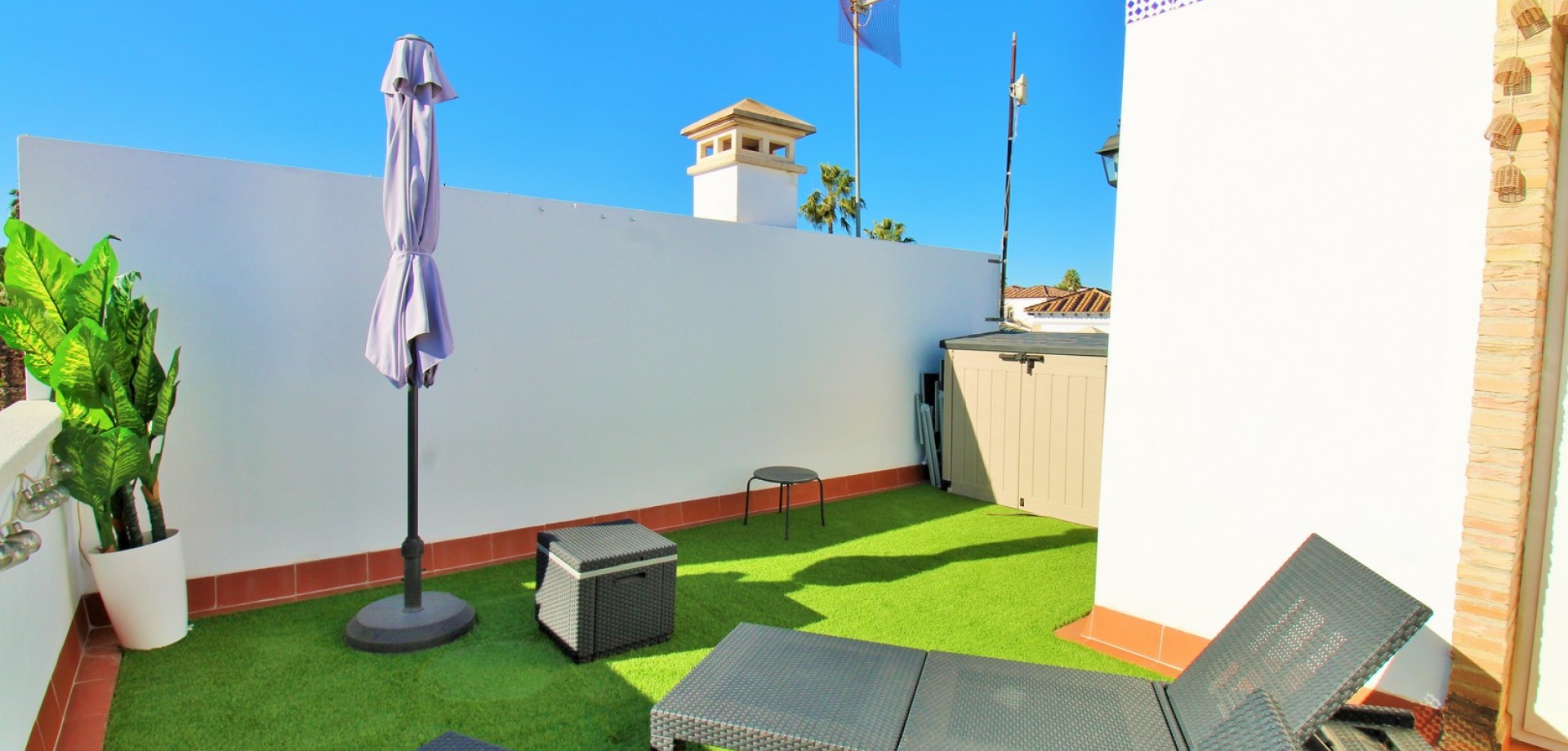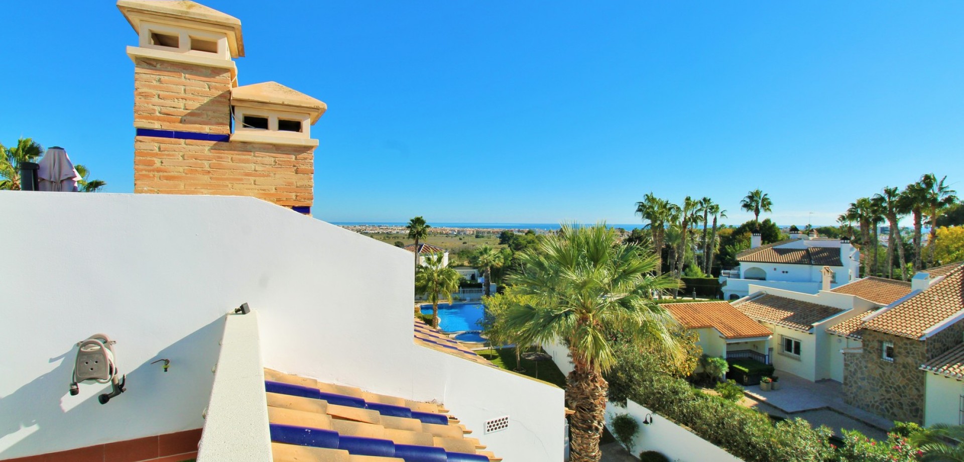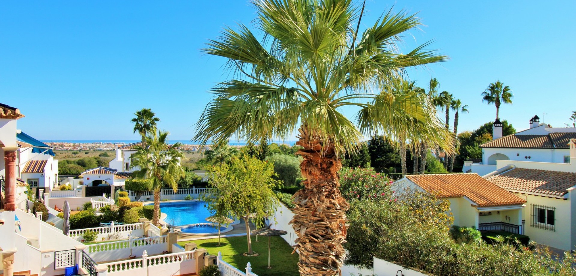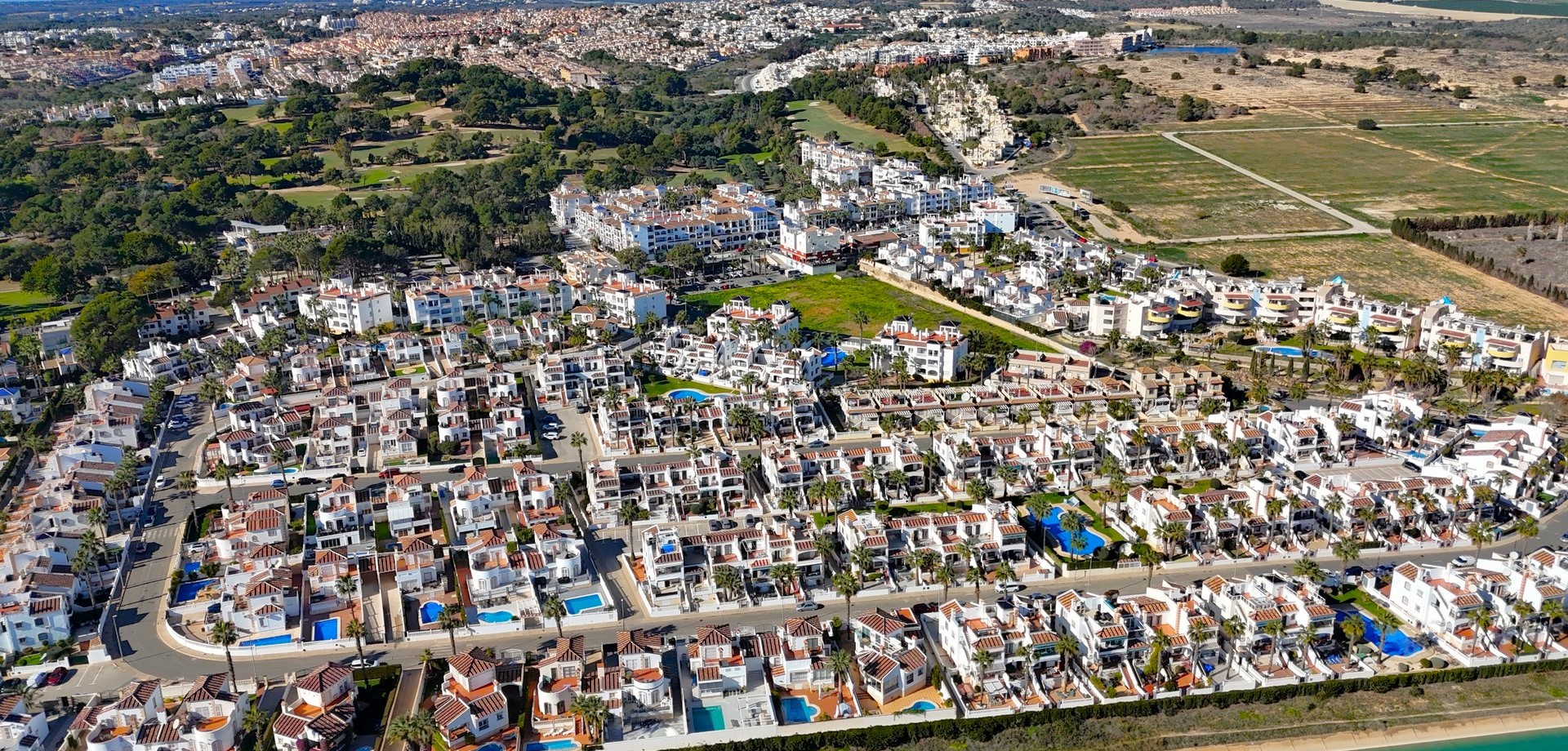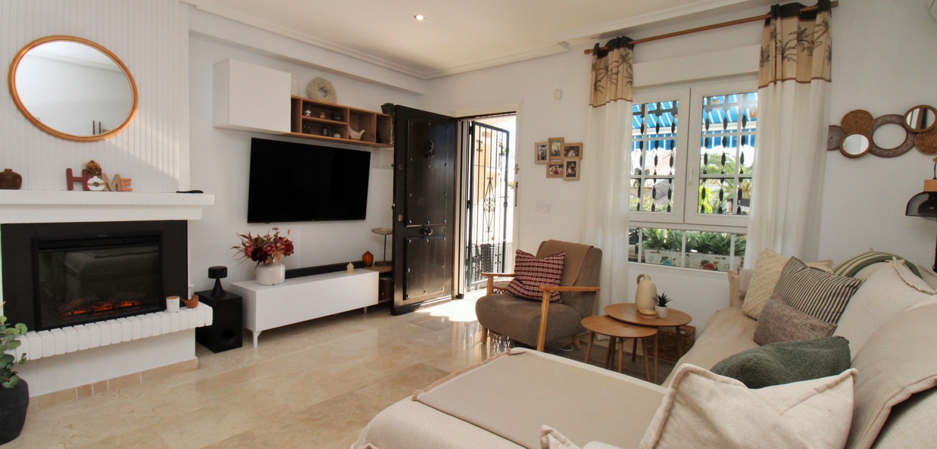 An exceptional South-facing Sofía-style townhouse with sea and pool views, perfectly positioned in the prestigious R1B gated community of Las Violetas, Villamartin. Over the past year the property has undergone extensive upgrades, including newly tiled gardens, refurbished terraces, a brand-new kitchen, retractable awnings, and high-quality furnishings and appliances. A superb opportunity in one of Villamartin’s most sought-after locations. Located just a five-minute walk from Villamartin Plaza and the golf course, this immaculate home offers the ideal blend of comfort, style, and convenience. The beautifully maintained community provides residents with a communal swimming pool and landscaped gardens. Inside, the ground floor features a bright and spacious lounge-dining area with a feature fireplace, a fully renovated modern kitchen with utility area, and a guest WC. Both the front and rear gardens have been newly retiled, and the elevated front terrace — complete with retractable sun awnings — overlooks the pool area. Upstairs are two double bedrooms with fitted wardrobes and a family bathroom. The main bedroom opens onto a private South-facing balcony with wonderful sea and pool views. Internal stairs lead up to a large private roof solarium offering panoramic Mediterranean views — perfect for relaxing or entertaining. The property is sold fully furnished, includes air-conditioning, and is presented in pristine condition throughout. Just a short stroll from a fantastic selection of restaurants, bars, shops, and the golf course, and only minutes by car to Zenia Boulevard and the Blue Flag beaches of the Orihuela Costa. Homes in Las Violetas are rarely available for long — early viewing recommended.