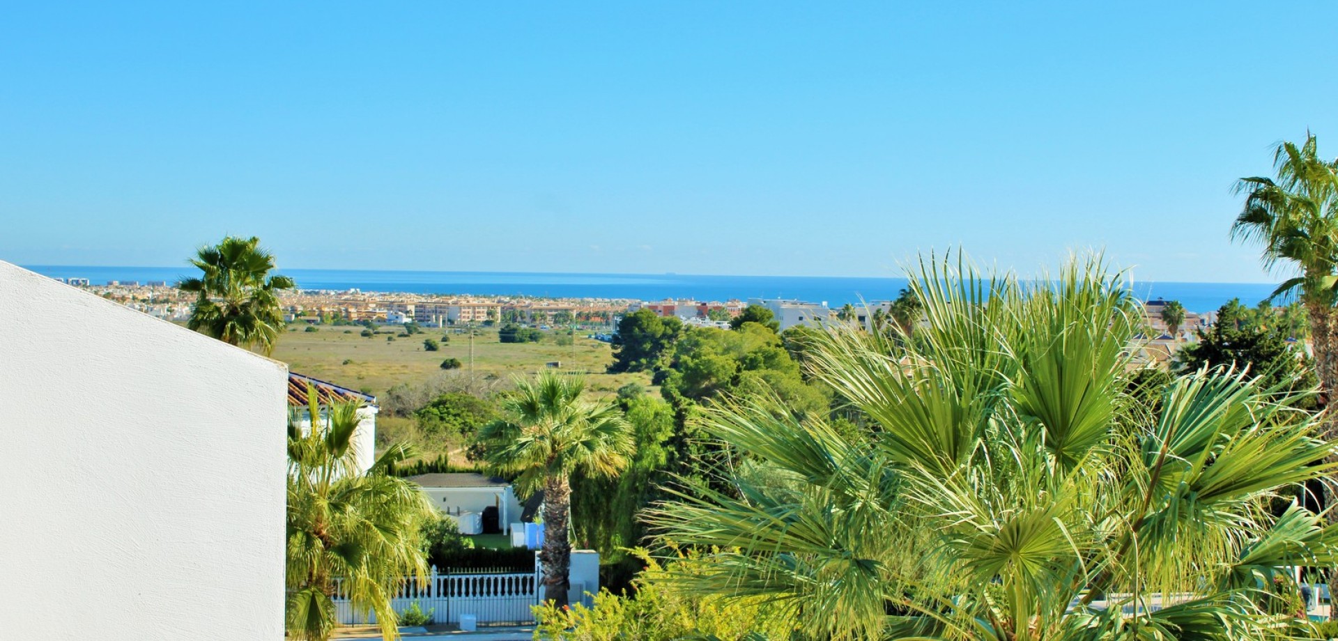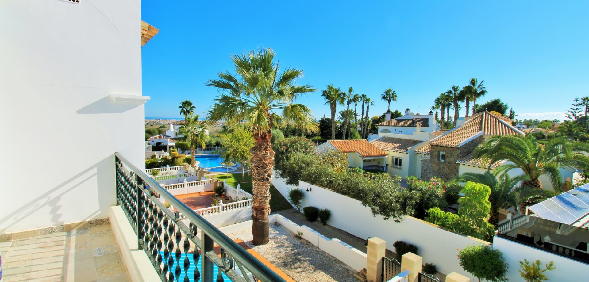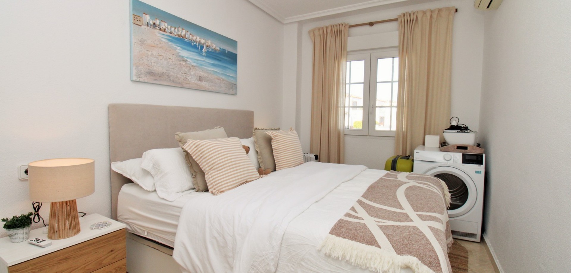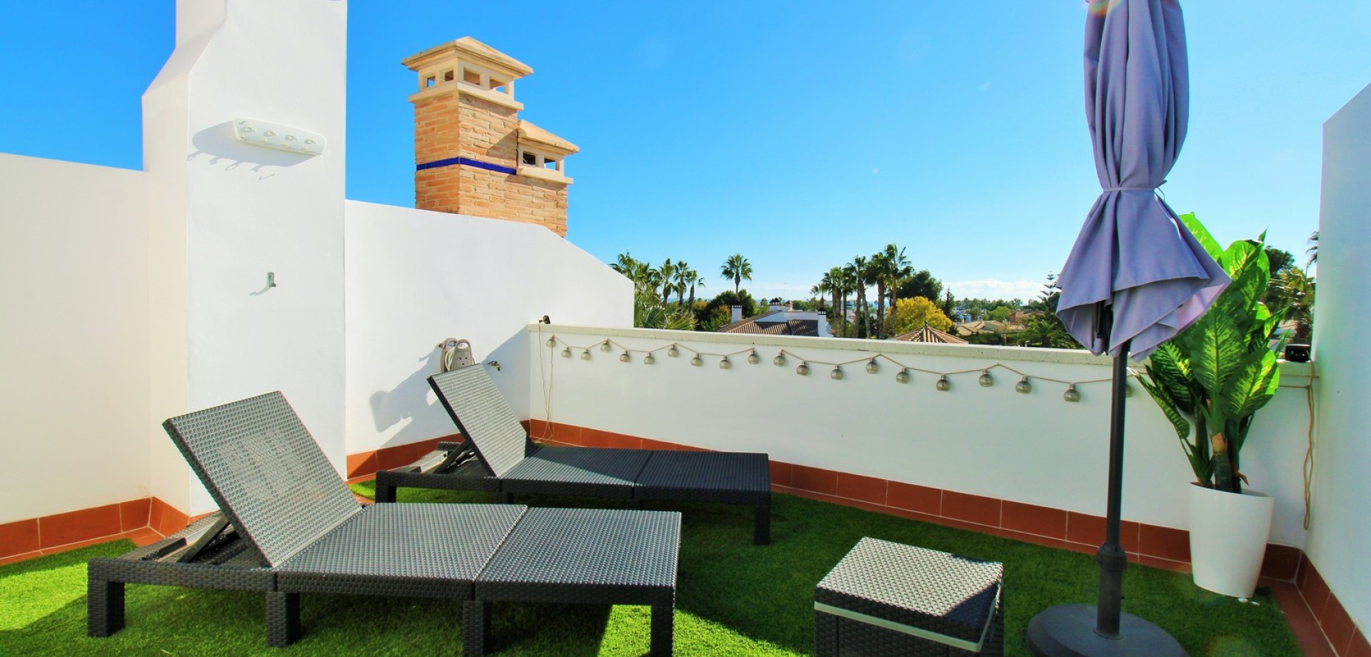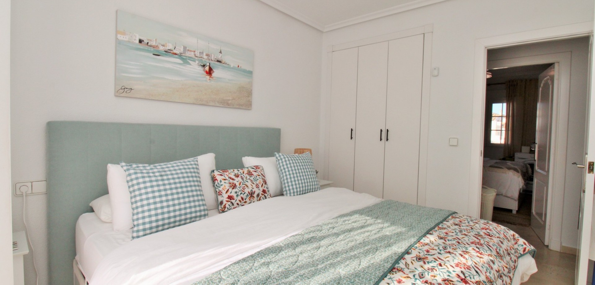 An exceptional South-facing Sofía-style townhouse with sea and pool views, perfectly positioned in the prestigious R1B gated community of Las Violetas, Villamartin. Over the past year the property has undergone extensive upgrades, including newly tiled gardens, refurbished terraces, a brand-new kitchen, retractable awnings, and high-quality furnishings and appliances. A superb opportunity in one of Villamartin’s most sought-after locations. Located just a five-minute walk from Villamartin Plaza and the golf course, this immaculate home offers the ideal blend of comfort, style, and convenience. The beautifully maintained community provides residents with a communal swimming pool and landscaped gardens. Inside, the ground floor features a bright and spacious lounge-dining area with a feature fireplace, a fully renovated modern kitchen with utility area, and a guest WC. Both the front and rear gardens have been newly retiled, and the elevated front terrace — complete with retractable sun awnings — overlooks the pool area. Upstairs are two double bedrooms with fitted wardrobes and a family bathroom. The main bedroom opens onto a private South-facing balcony with wonderful sea and pool views. Internal stairs lead up to a large private roof solarium offering panoramic Mediterranean views — perfect for relaxing or entertaining. The property is sold fully furnished, includes air-conditioning, and is presented in pristine condition throughout. Just a short stroll from a fantastic selection of restaurants, bars, shops, and the golf course, and only minutes by car to Zenia Boulevard and the Blue Flag beaches of the Orihuela Costa. Homes in Las Violetas are rarely available for long — early viewing recommended.