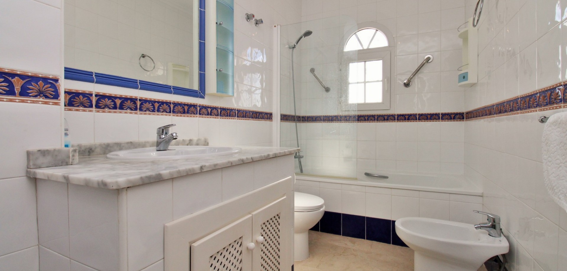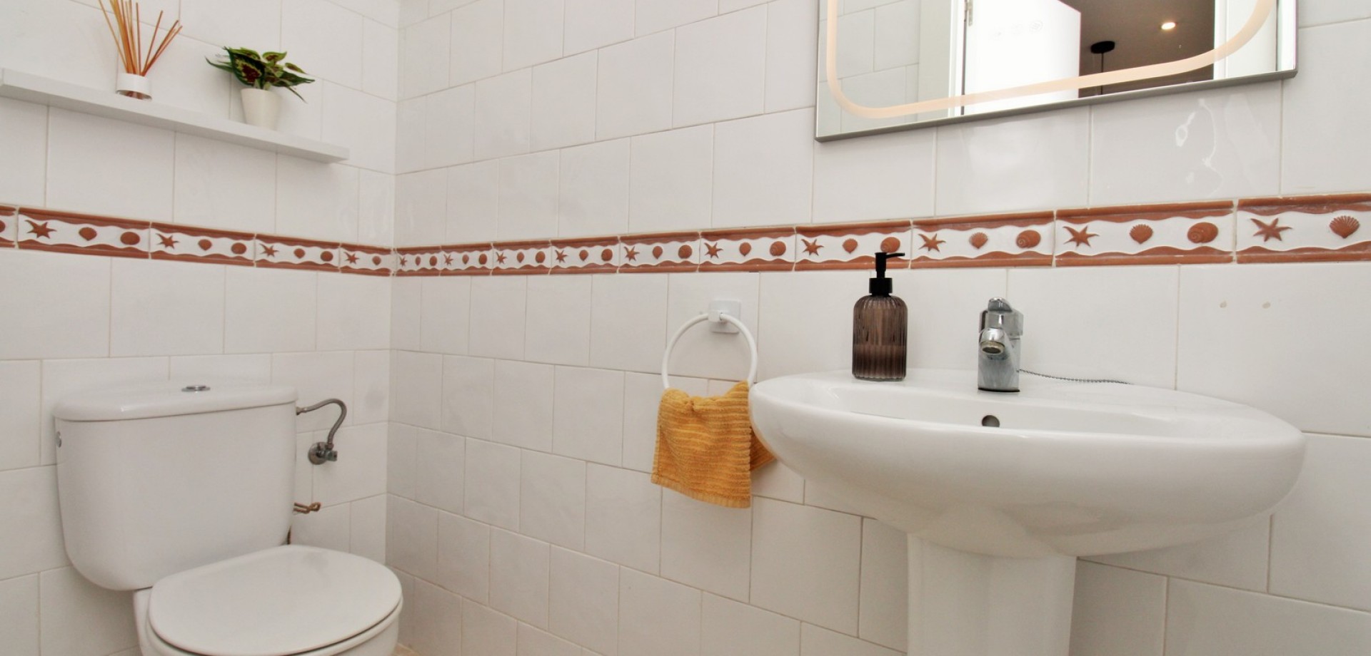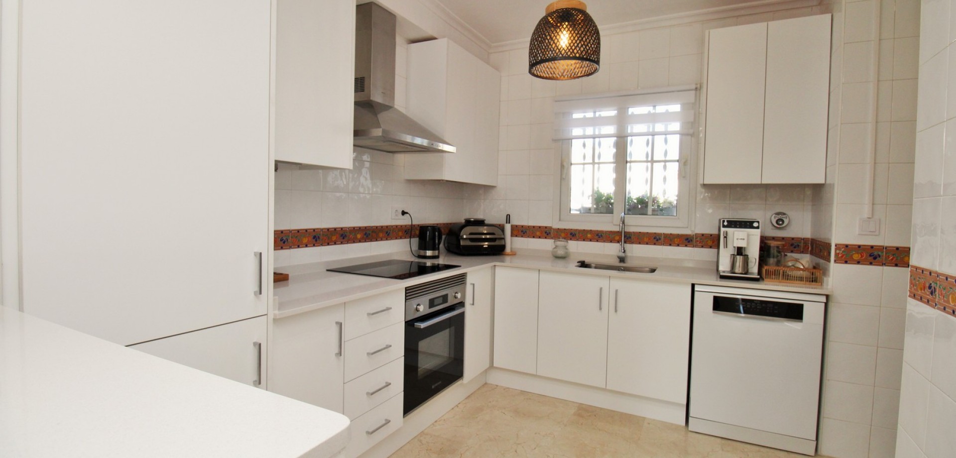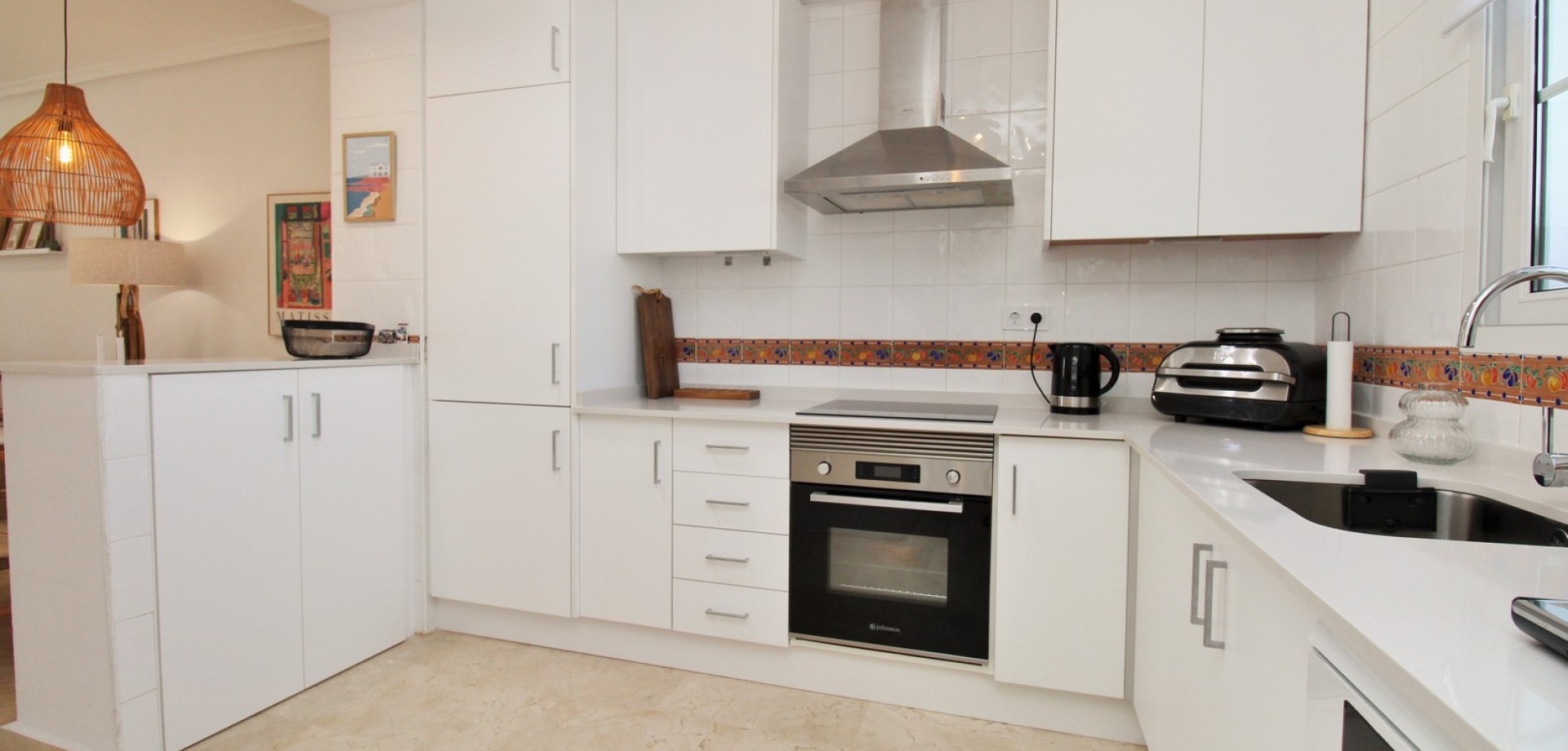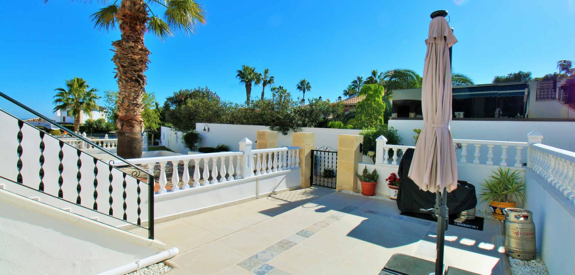 An exceptional South-facing Sofía-style townhouse with sea and pool views, perfectly positioned in the prestigious R1B gated community of Las Violetas, Villamartin. Over the past year the property has undergone extensive upgrades, including newly tiled gardens, refurbished terraces, a brand-new kitchen, retractable awnings, and high-quality furnishings and appliances. A superb opportunity in one of Villamartin’s most sought-after locations. Located just a five-minute walk from Villamartin Plaza and the golf course, this immaculate home offers the ideal blend of comfort, style, and convenience. The beautifully maintained community provides residents with a communal swimming pool and landscaped gardens. Inside, the ground floor features a bright and spacious lounge-dining area with a feature fireplace, a fully renovated modern kitchen with utility area, and a guest WC. Both the front and rear gardens have been newly retiled, and the elevated front terrace — complete with retractable sun awnings — overlooks the pool area. Upstairs are two double bedrooms with fitted wardrobes and a family bathroom. The main bedroom opens onto a private South-facing balcony with wonderful sea and pool views. Internal stairs lead up to a large private roof solarium offering panoramic Mediterranean views — perfect for relaxing or entertaining. The property is sold fully furnished, includes air-conditioning, and is presented in pristine condition throughout. Just a short stroll from a fantastic selection of restaurants, bars, shops, and the golf course, and only minutes by car to Zenia Boulevard and the Blue Flag beaches of the Orihuela Costa. Homes in Las Violetas are rarely available for long — early viewing recommended.