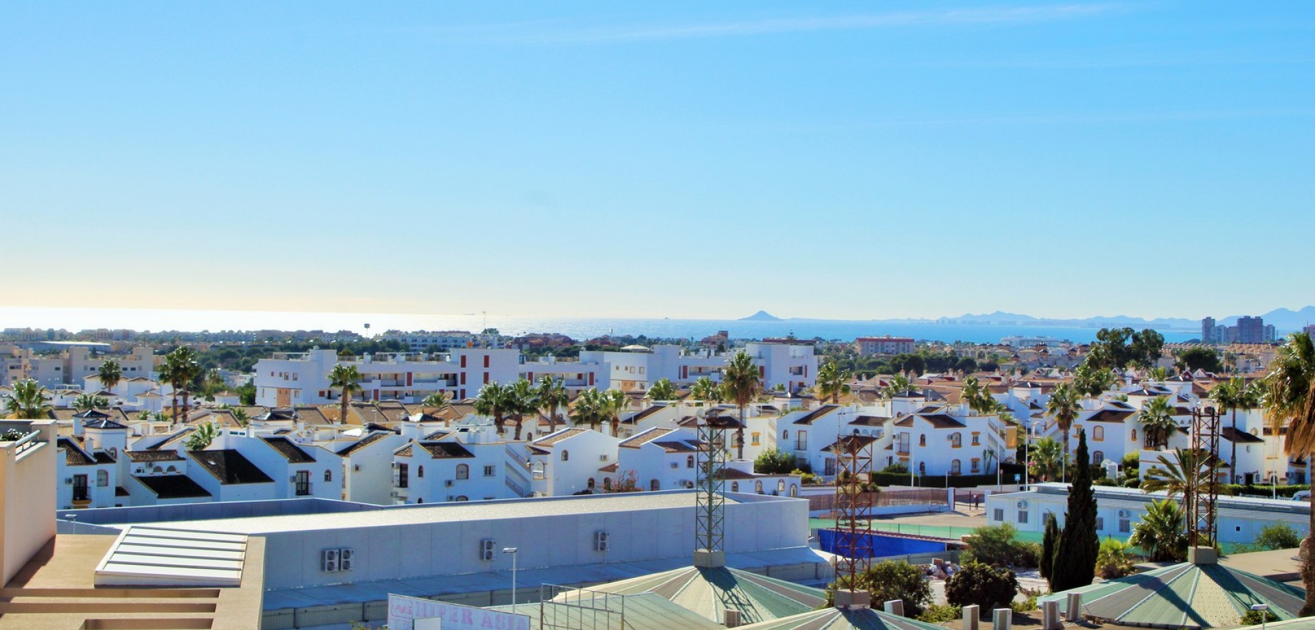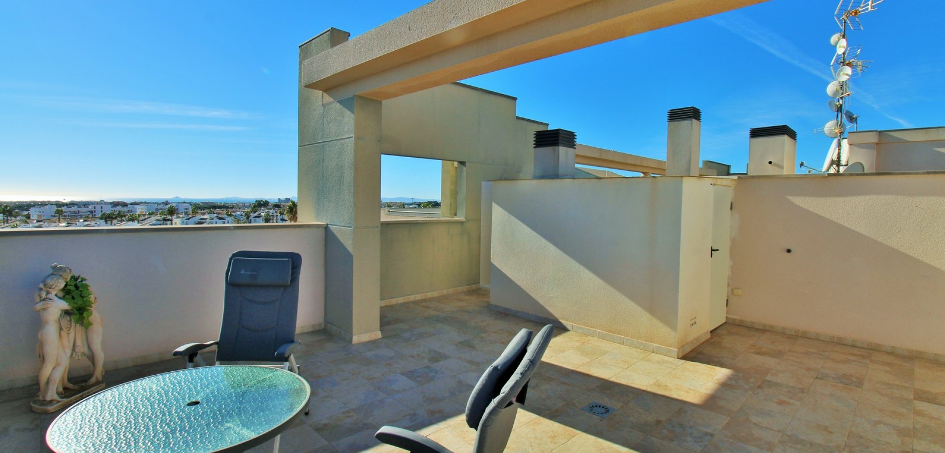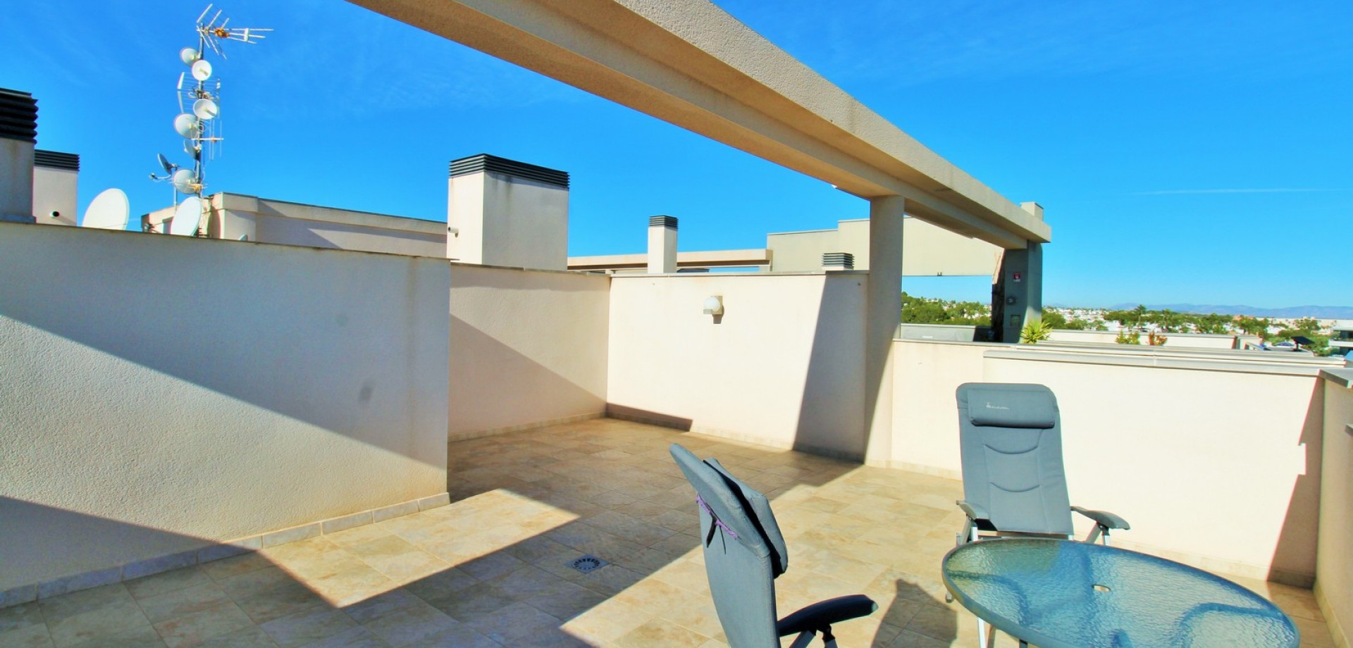This stunning East-facing penthouse apartment is located in the highly sought-after Altos del Mediterráneo complex in Los Dolses, offering exceptional views of the Mediterranean Sea and the Mar Menor. Situated in Block 3 with convenient lift access, the property stands out for its modern design, fantastic outdoor spaces, and unbeatable proximity to local amenities. The interior comprises a bright and spacious lounge-dining area with an open-plan modern kitchen, two double bedrooms with fitted wardrobes, and two contemporary bathrooms, including an en-suite for the master bedroom. Both the lounge and master bedroom offer direct access to a sunny East-facing balcony fitted with glass curtains, perfect for enjoying the views all year round. From the balcony, an external staircase leads to the impressive private roof solarium, boasting panoramic views towards the sea, Mar Menor, La Manga, and the surrounding coastline. The solarium also features a storage room, ideal for outdoor furniture, beach gear, or personal belongings. The property includes a dedicated parking space inside the gated community, along with beautifully maintained communal areas and access to premium facilities — outdoor swimming pool, indoor heated pool, gym, sauna, and green areas. Located just a stone’s throw from a supermarket, shops, bars, restaurants, and a bus stop, the property is also within walking distance of Zenia Boulevard, Villamartin Plaza, and Villamartin Golf. An outstanding option for permanent living, holidays, or rental investment in one of the Orihuela Costa’s most desirable modern developments.