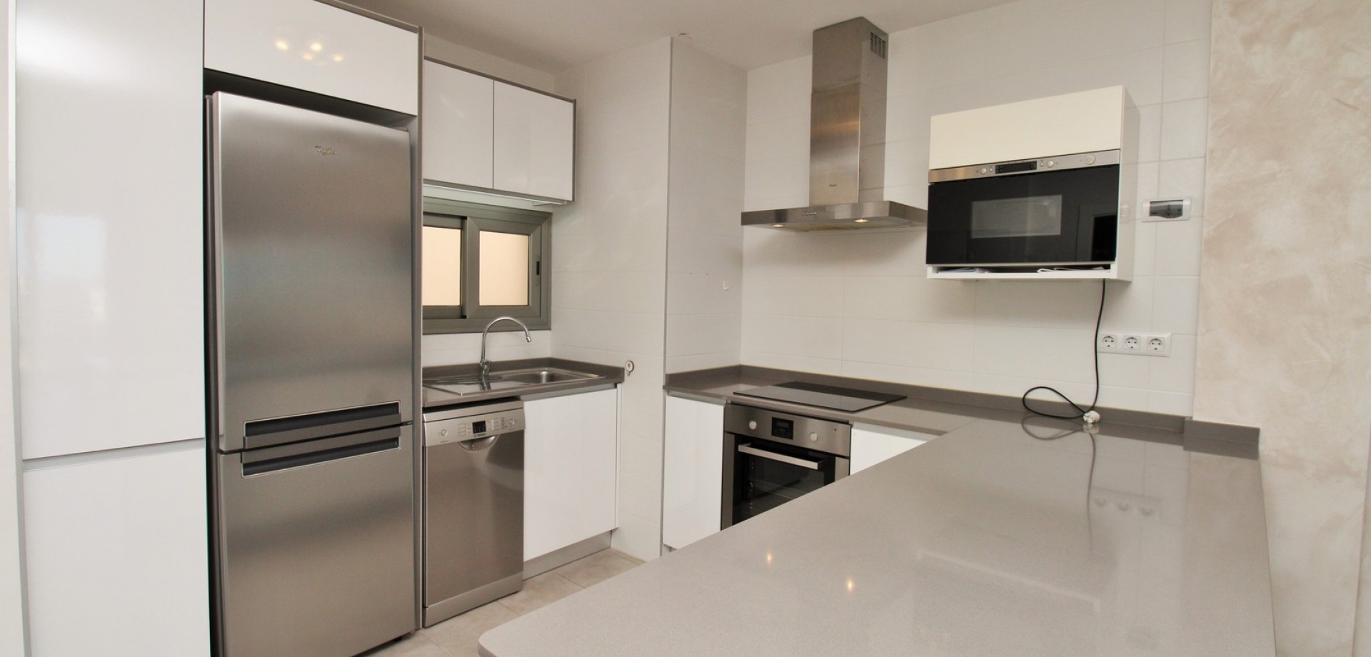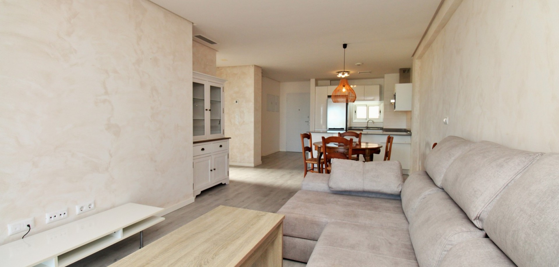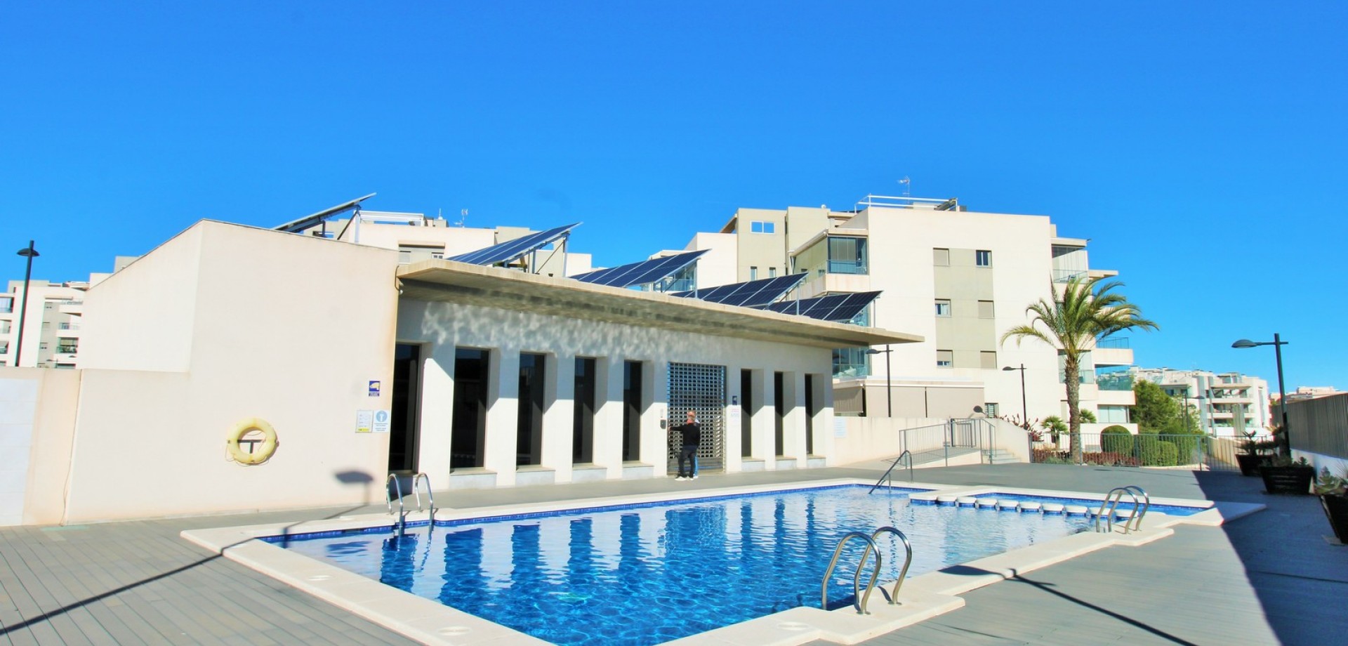 This stunning East-facing penthouse apartment is located in the highly sought-after Altos del Mediterráneo complex in Los Dolses, offering exceptional views of the Mediterranean Sea and the Mar Menor. Situated in Block 3 with convenient lift access, the property stands out for its modern design, fantastic outdoor spaces, and unbeatable proximity to local amenities. The interior comprises a bright and spacious lounge-dining area with an open-plan modern kitchen, two double bedrooms with fitted wardrobes, and two contemporary bathrooms, including an en-suite for the master bedroom. Both the lounge and master bedroom offer direct access to a sunny East-facing balcony fitted with glass curtains, perfect for enjoying the views all year round. From the balcony, an external staircase leads to the impressive private roof solarium, boasting panoramic views towards the sea, Mar Menor, La Manga, and the surrounding coastline. The solarium also features a storage room, ideal for outdoor furniture, beach gear, or personal belongings. The property includes a dedicated parking space inside the gated community, along with beautifully maintained communal areas and access to premium facilities — outdoor swimming pool, indoor heated pool, gym, sauna, and green areas. Located just a stone’s throw from a supermarket, shops, bars, restaurants, and a bus stop, the property is also within walking distance of Zenia Boulevard, Villamartin Plaza, and Villamartin Golf. An outstanding option for permanent living, holidays, or rental investment in one of the Orihuela Costa’s most desirable modern developments.