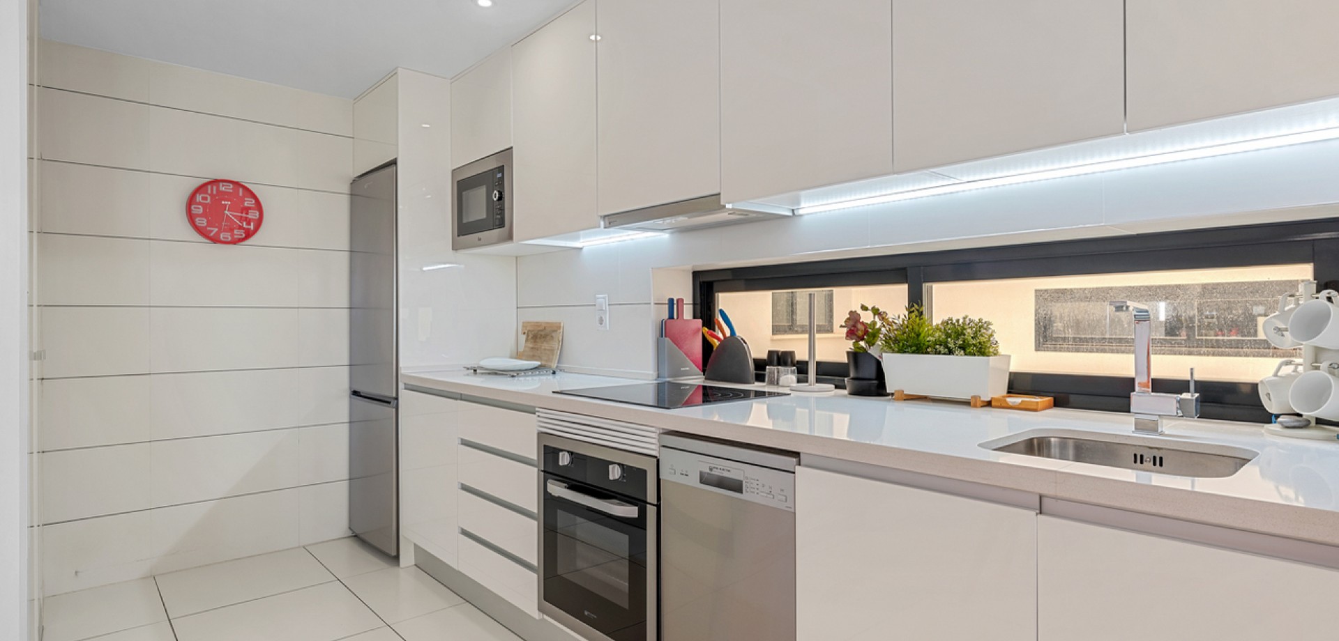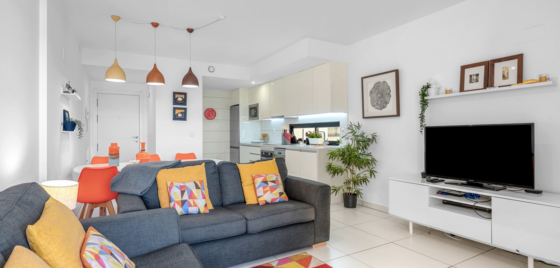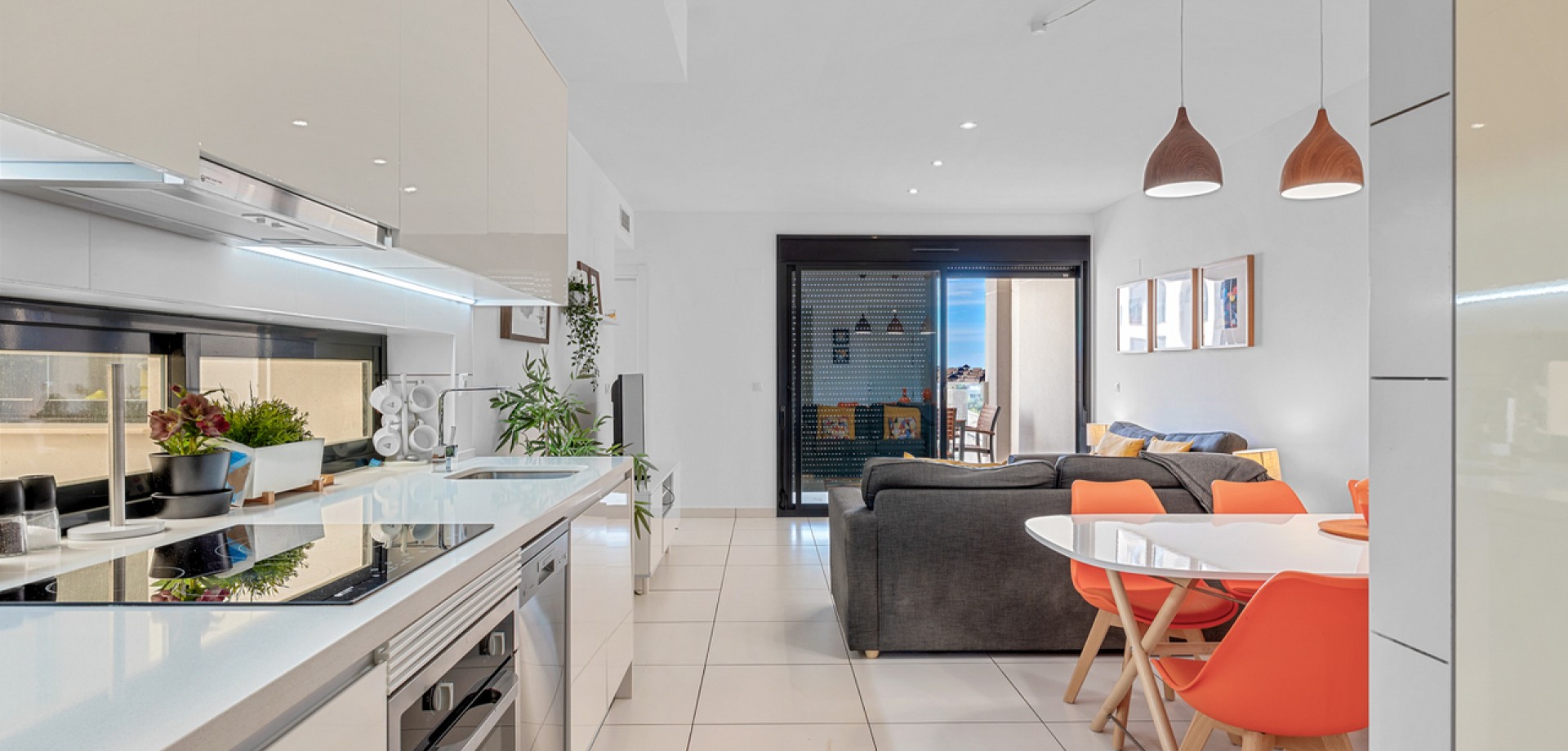 This stunning modern second floor apartment with 2 bedrooms, 2 bathrooms and private rooftop terrace/solarium is situated in Villamartin, Alicante only a few minutes walk to all local amenities (restaurants, bars and shops).