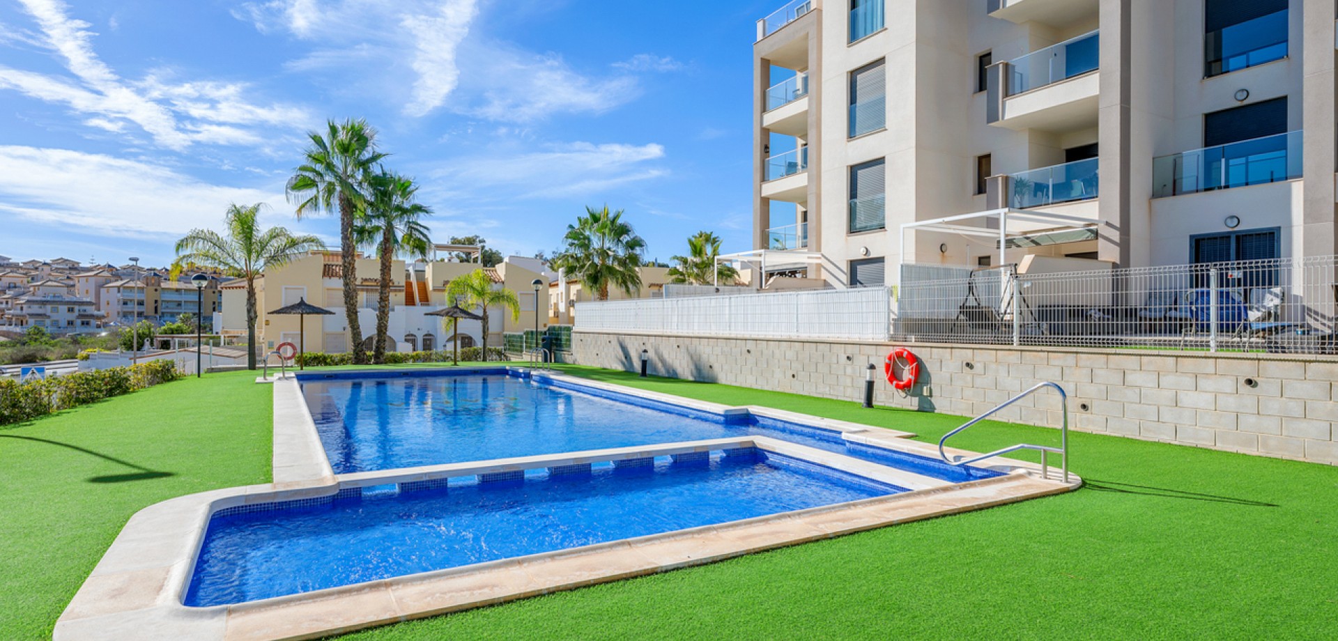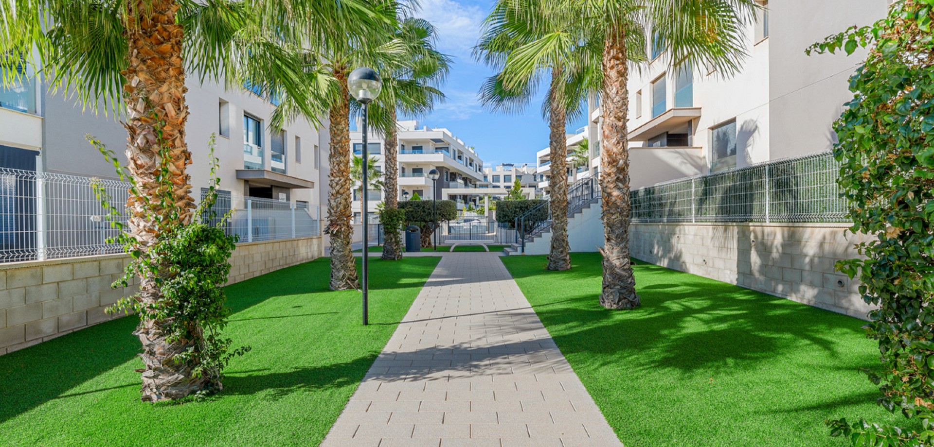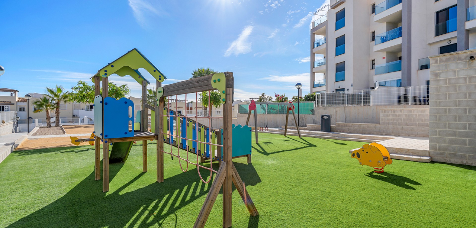 There is a lovely communal green area with three communal swimming pools, children's playground area, tennis/padel court and a beautiful communal park. These apartments are fantastic value for money and the location is great with the bars, restaurants and amenities only a short walk away.