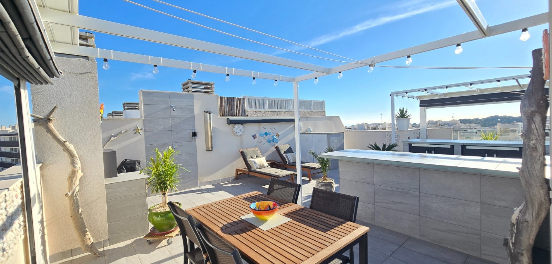 Discover this exceptional south-facing penthouse with breathtaking sea and mountain views, located in a young and perfectly maintained urbanisation near the Gulf of Villamartin. The absolute showpiece is the spacious solarium, equipped with a fully fitted outdoor kitchen, a dining and lounge area, and sun terraces where you can enjoy light, tranquillity, and panoramic views throughout the day. Inside, a bright and spacious living area with an open-plan kitchen welcomes you into a modern, inviting atmosphere. The penthouse has two bedrooms and two bathrooms, one of which is en-suite, designed with high-quality materials and a practical layout. Additional comfort can be found in the underground parking space (with pre-installation for an electric car) and two separate storage rooms, ideal for extra storage. The urbanisation itself offers a range of facilities: two swimming pools, a jacuzzi, an outdoor gym, a petanque court, a playground for the little ones and beautifully landscaped communal areas. Everything is within walking distance of bars, restaurants and other amenities, so relaxation and convenience are always within reach. As extras, the property has sun awnings, wind screens, water descaler + OSMOSE and is sold fully furnished! This penthouse combines luxurious living, comfort and a prime location on the Costa Blanca — perfect as a permanent residence, holiday home or investment. Do not hesitate to book a viewing soon! Suma: 249 euro/year. Community fees: 920 euros/year.
