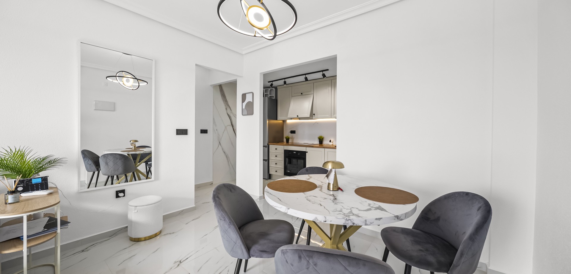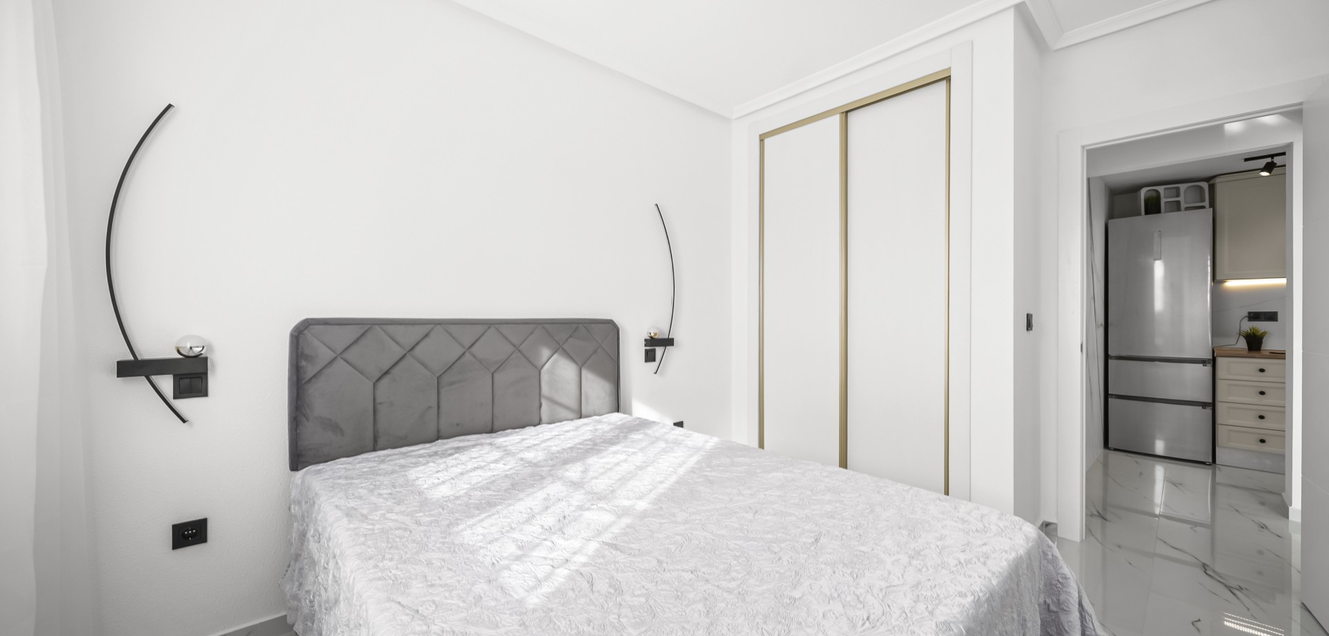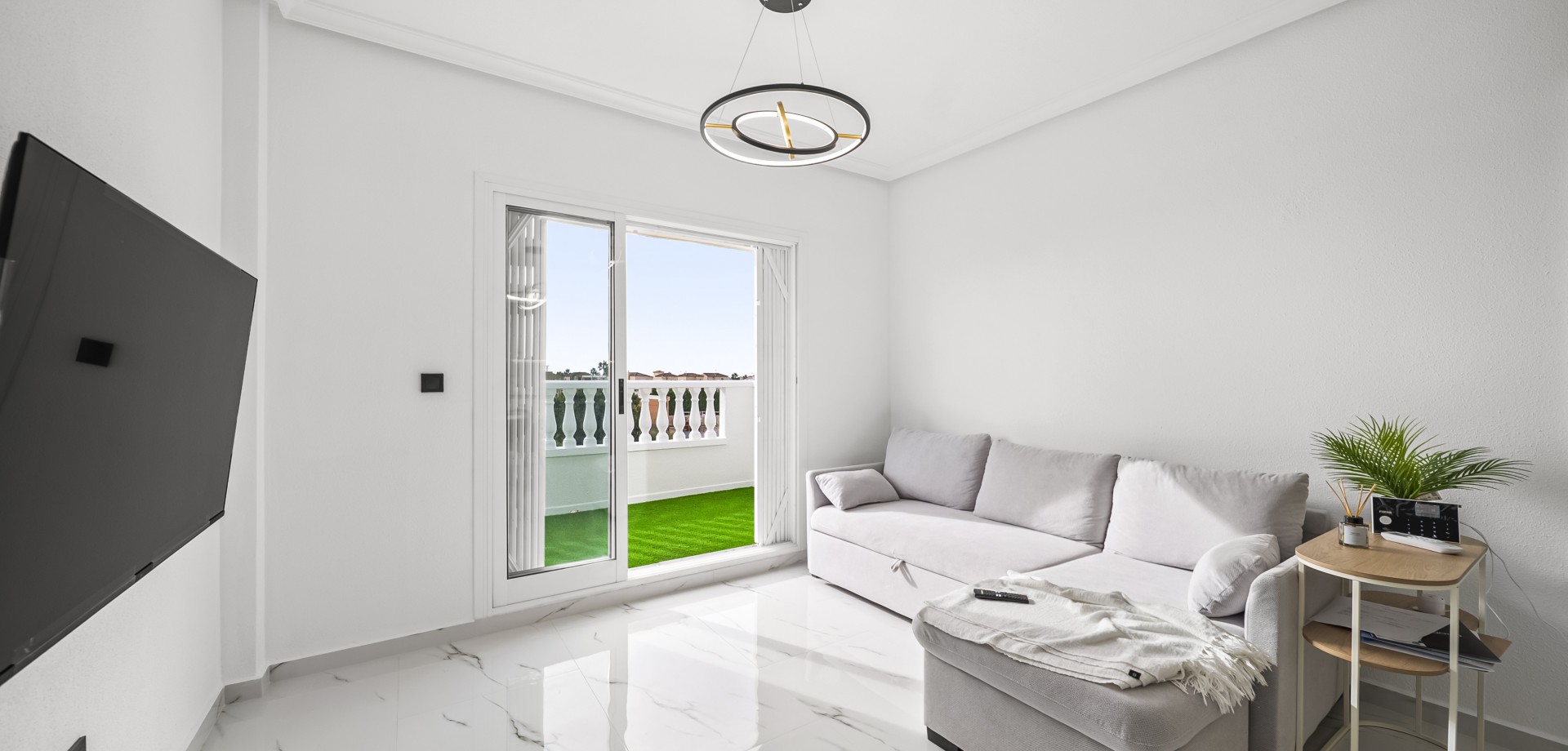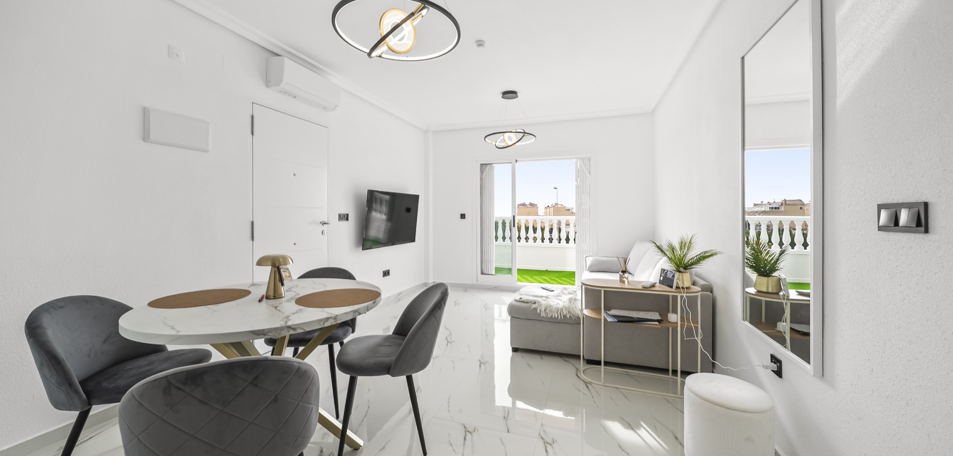 Renovated apartment with sunny terrace and sea views in Zeniamar. Fully renovated in 2025, this apartment is located on the first floor (no lift) in the Zeniamar residential complex, Playa Flamenca. It features 1 bedroom, 1 bathroom, an open-plan kitchen, and a southeast-facing terrace with sea views. Sold furnished, with storage room and access to a communal pool. Key features 1 bedroom 1 bathroom 52 m² built Open-plan kitchen Terrace with sea views First floor (no lift) Storage room Furnished Communal pool Southeast orientation Year of construction: 2001 Renovated in 2025 Annual costs IBI: €125 Community fees: €364 Location Close to all services Just minutes from supermarkets, padel courts, La Zenia Boulevard, and restaurants