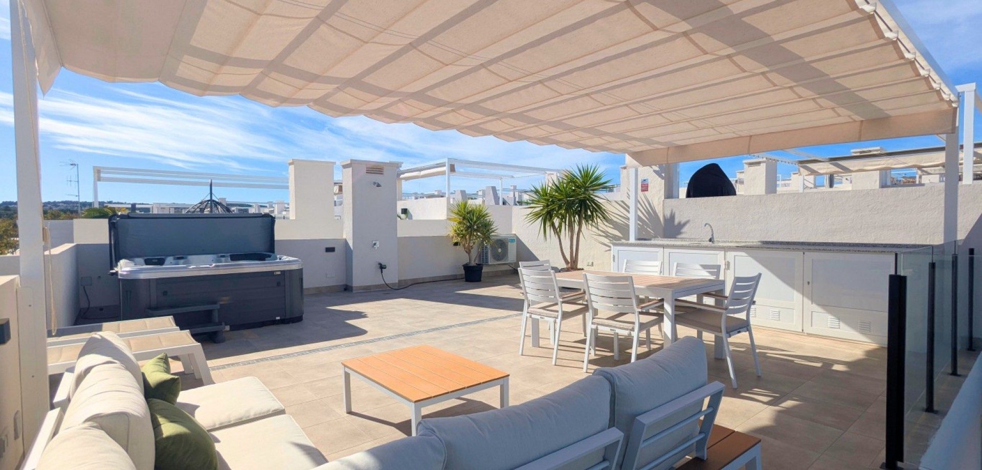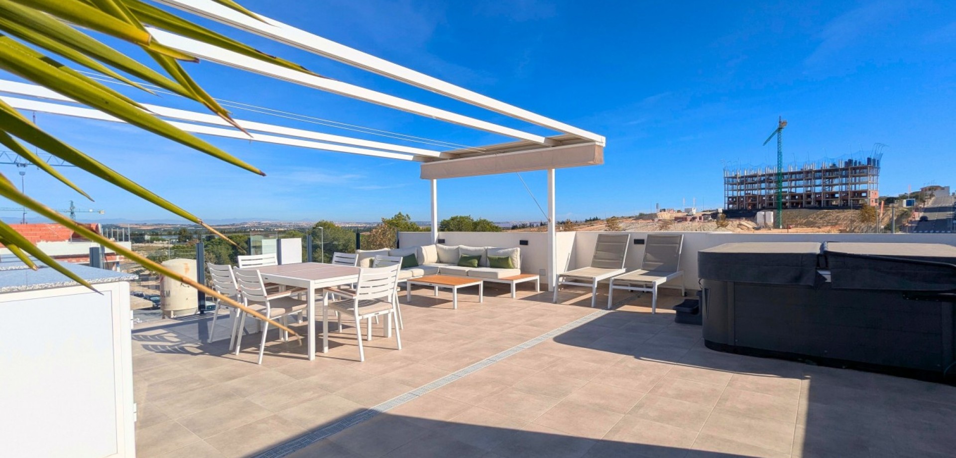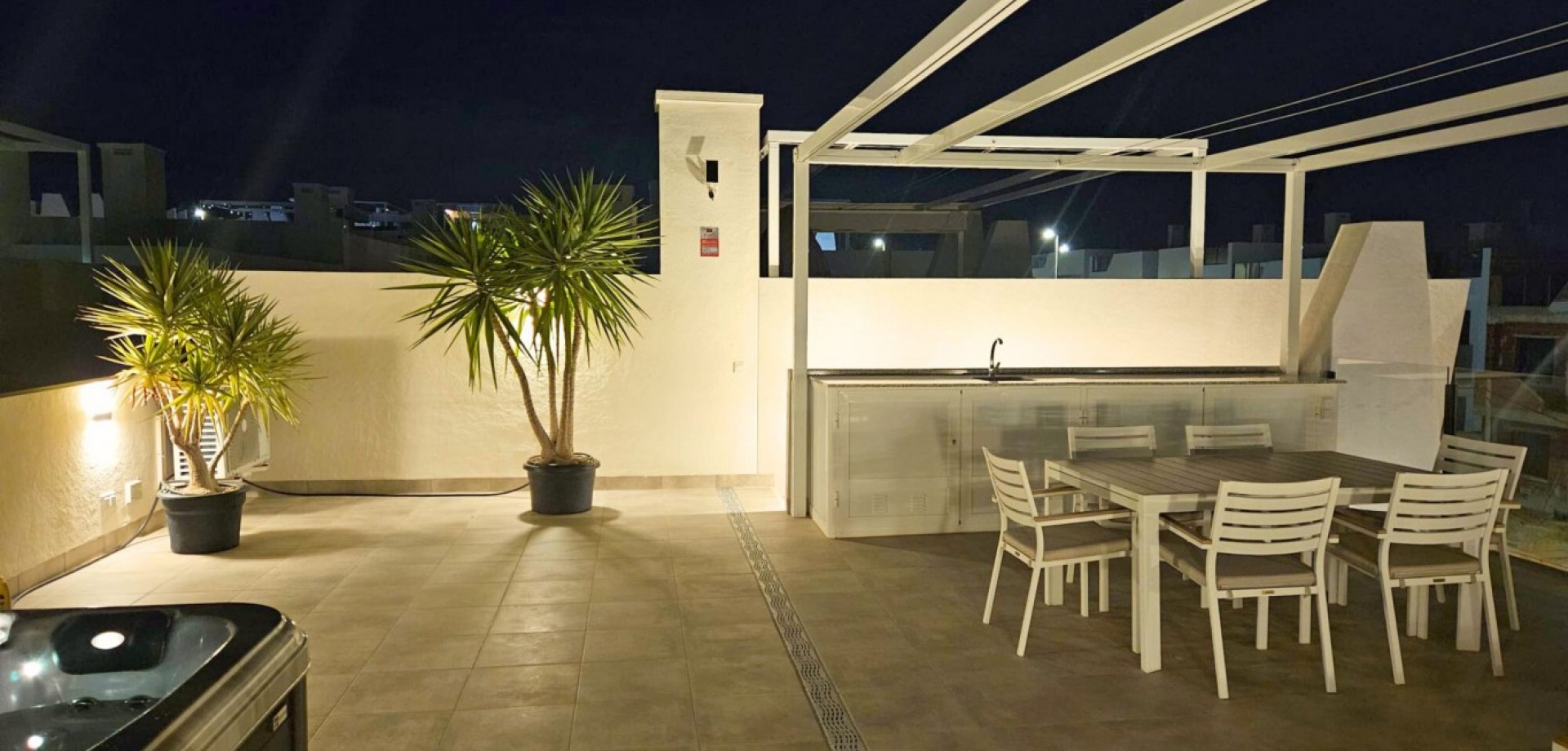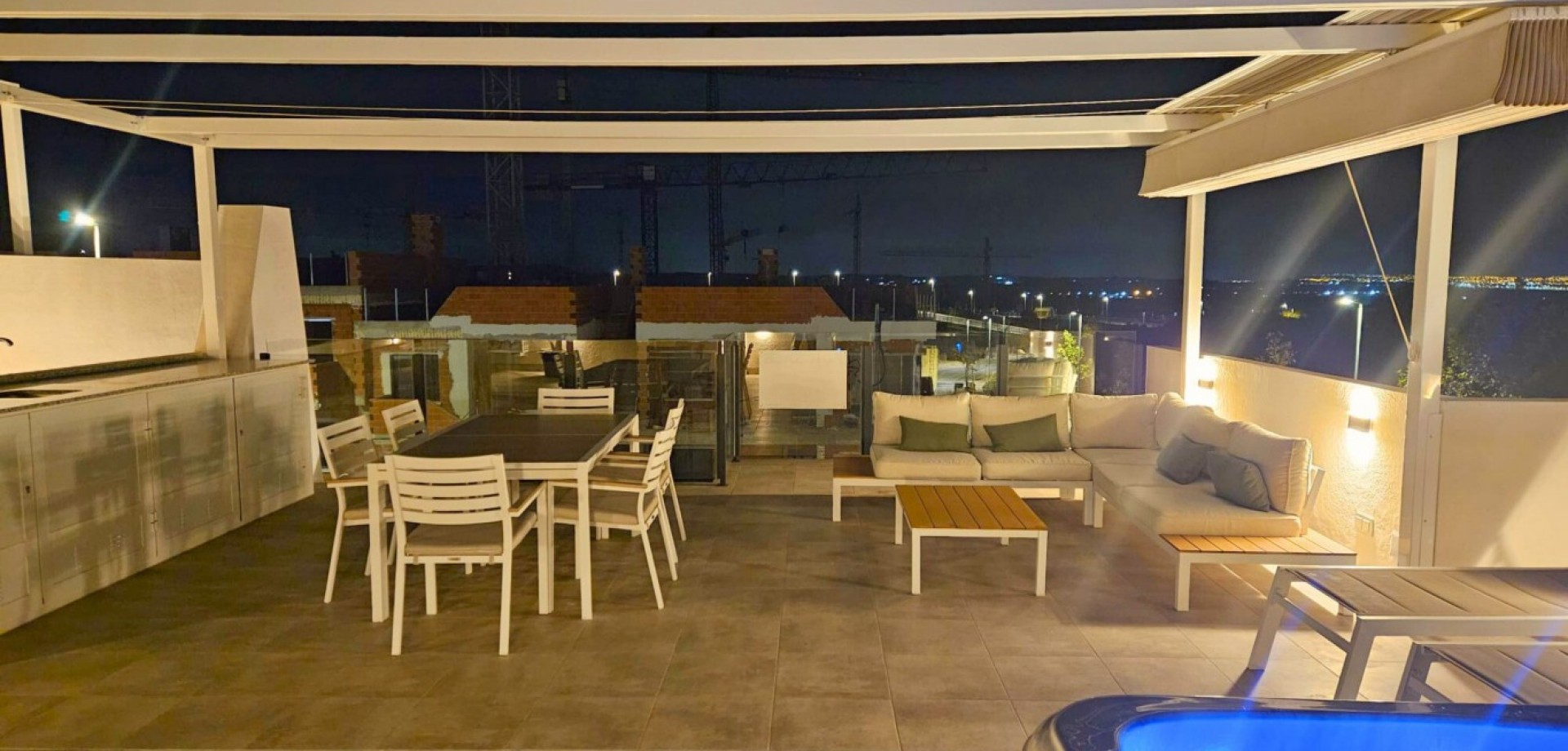 We present this exceptional corner penthouse in San Miguel de Salinas – a modern, uniquely designed home built in 2024, offering stunning views and outstanding outdoor living. Ideally located close to all amenities, this penthouse stands out immediately thanks to its unique layout, different from all other penthouses in the development. The interior is bright and welcoming, flooded with natural light throughout the day thanks to its corner position and large windows. Inside, the property features a custom-designed kitchen and sliding doors instead of standard doors, giving the home an elegant, open and modern feel. The living area connects beautifully to the outdoor spaces, making it ideal for both everyday living and entertaining. One of the key highlights is the impressive private rooftop solarium, fully equipped for outdoor enjoyment. It includes an outdoor kitchen, pergola, and even a shower, making it the perfect place to relax, dine, or enjoy the sunshine while taking in the panoramic views over the Torrevieja salt lake and the park in front. The community offers excellent shared facilities, including a large swimming pool and a children’s playground, ideal for families or those who enjoy resort-style living. The penthouse also comes with air conditioning, ensuring comfort all year round. This is a rare opportunity to own a high-quality, uniquely designed penthouse with exceptional outdoor features and one of the best views in the area.