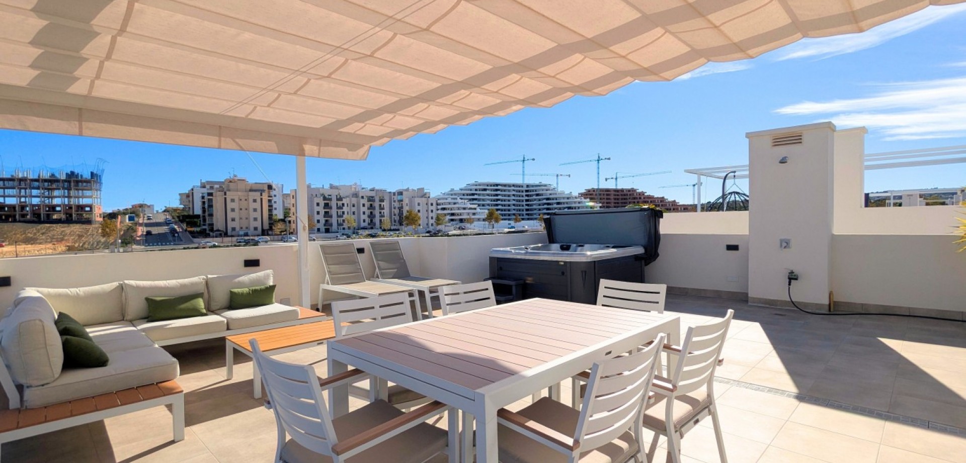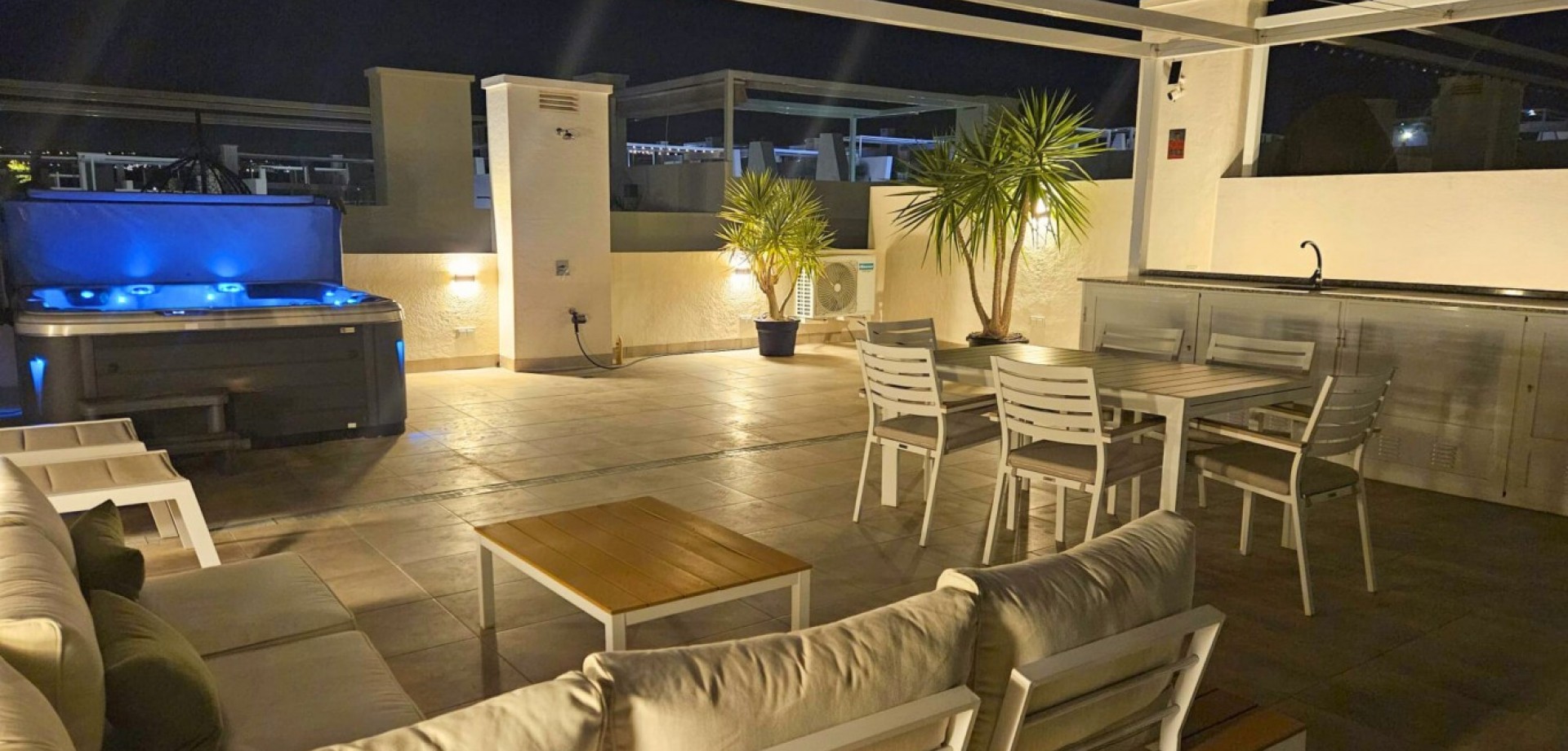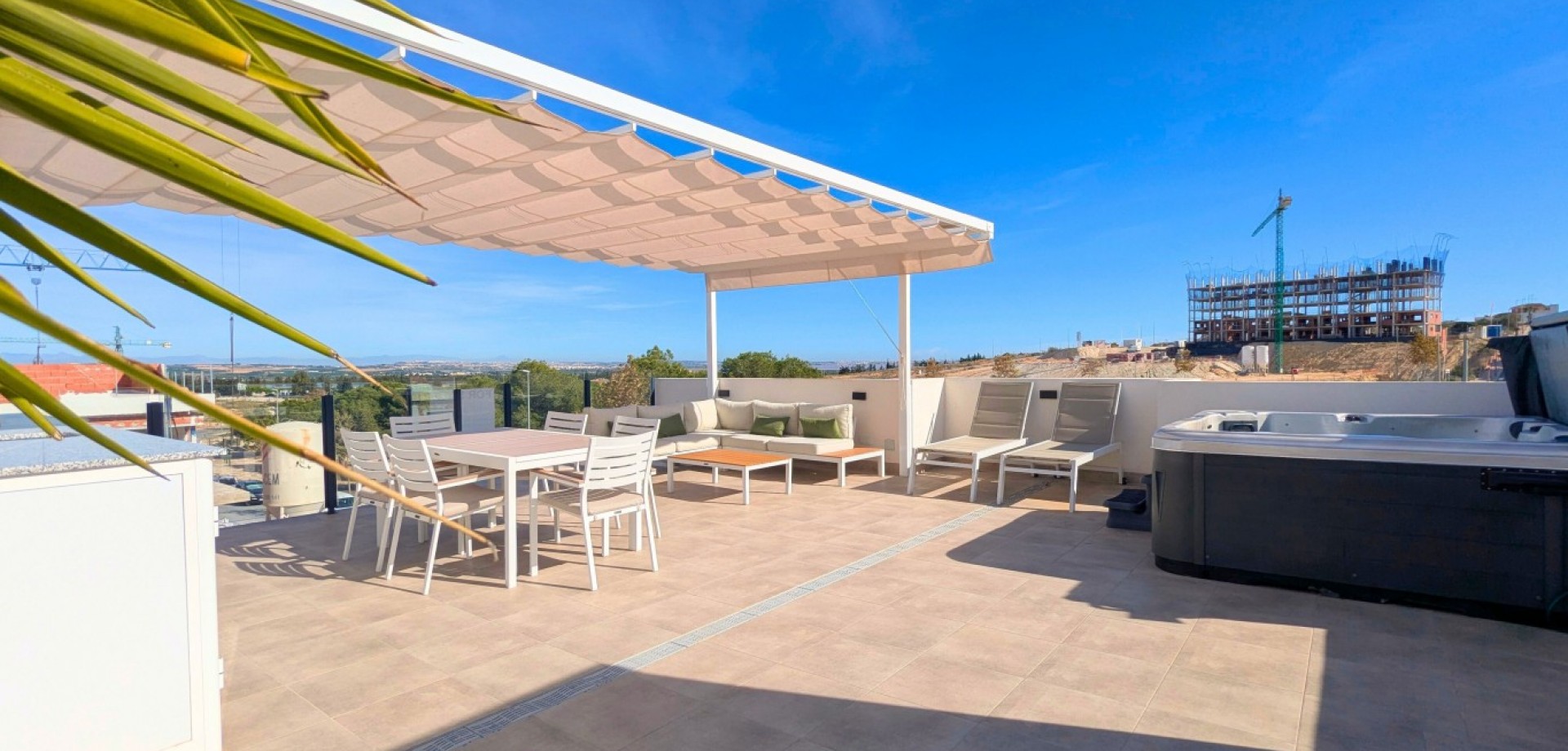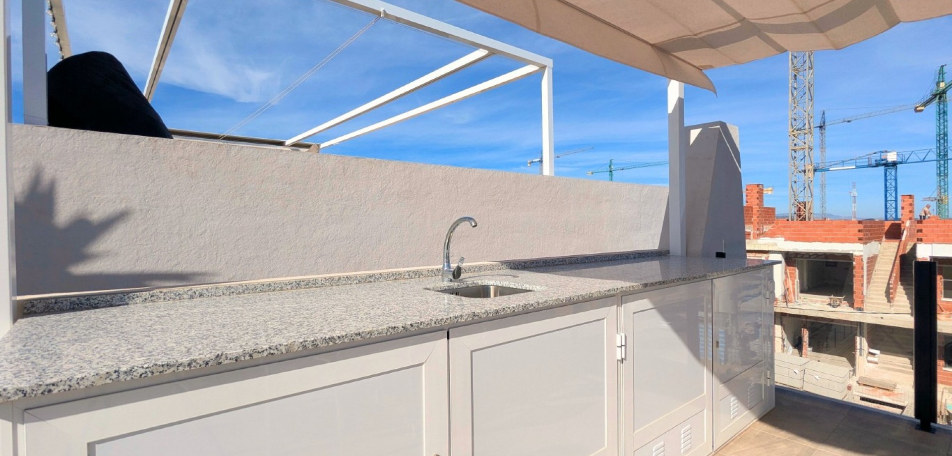 We present this exceptional corner penthouse in San Miguel de Salinas – a modern, uniquely designed home built in 2024, offering stunning views and outstanding outdoor living. Ideally located close to all amenities, this penthouse stands out immediately thanks to its unique layout, different from all other penthouses in the development. The interior is bright and welcoming, flooded with natural light throughout the day thanks to its corner position and large windows. Inside, the property features a custom-designed kitchen and sliding doors instead of standard doors, giving the home an elegant, open and modern feel. The living area connects beautifully to the outdoor spaces, making it ideal for both everyday living and entertaining. One of the key highlights is the impressive private rooftop solarium, fully equipped for outdoor enjoyment. It includes an outdoor kitchen, pergola, and even a shower, making it the perfect place to relax, dine, or enjoy the sunshine while taking in the panoramic views over the Torrevieja salt lake and the park in front. The community offers excellent shared facilities, including a large swimming pool and a children’s playground, ideal for families or those who enjoy resort-style living. The penthouse also comes with air conditioning, ensuring comfort all year round. This is a rare opportunity to own a high-quality, uniquely designed penthouse with exceptional outdoor features and one of the best views in the area.