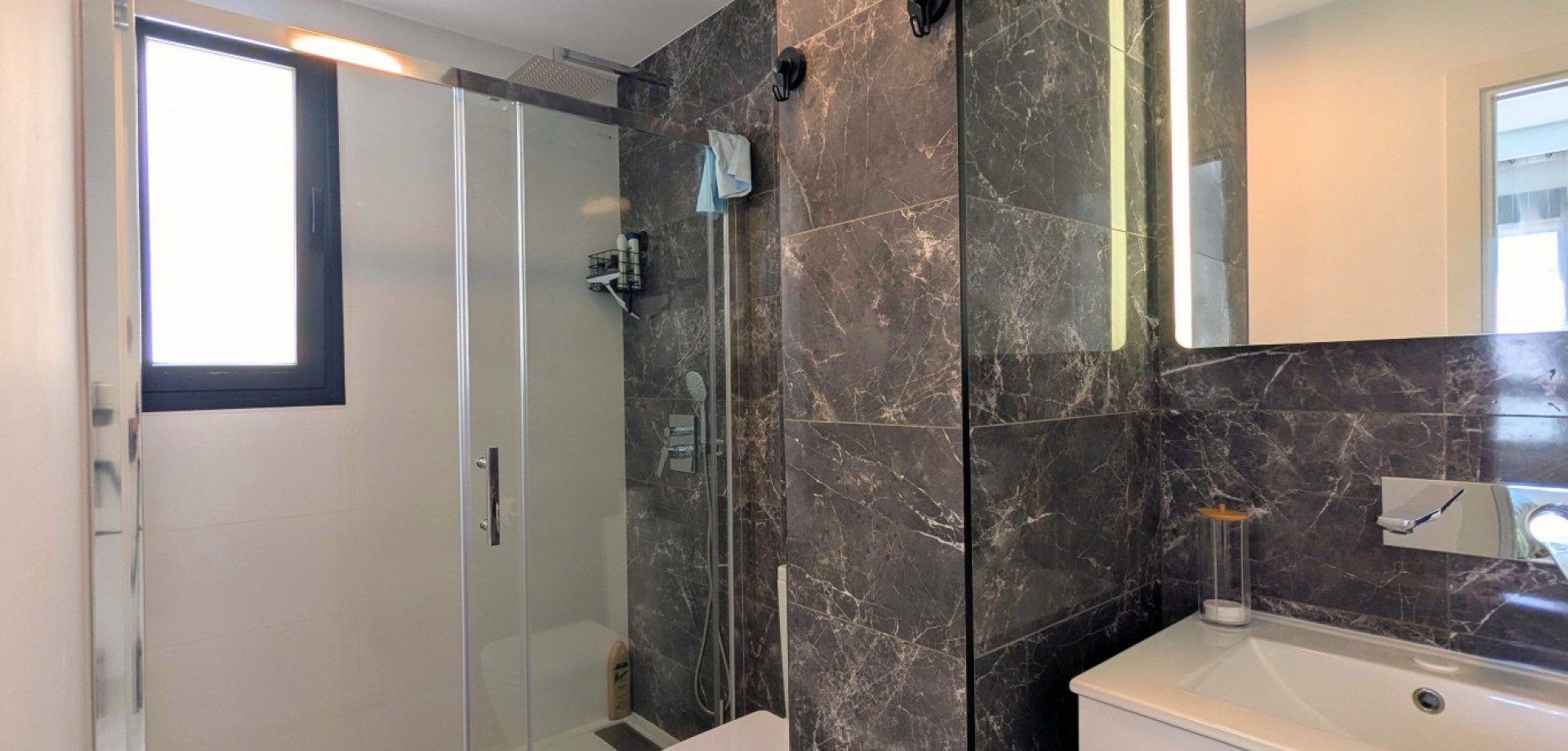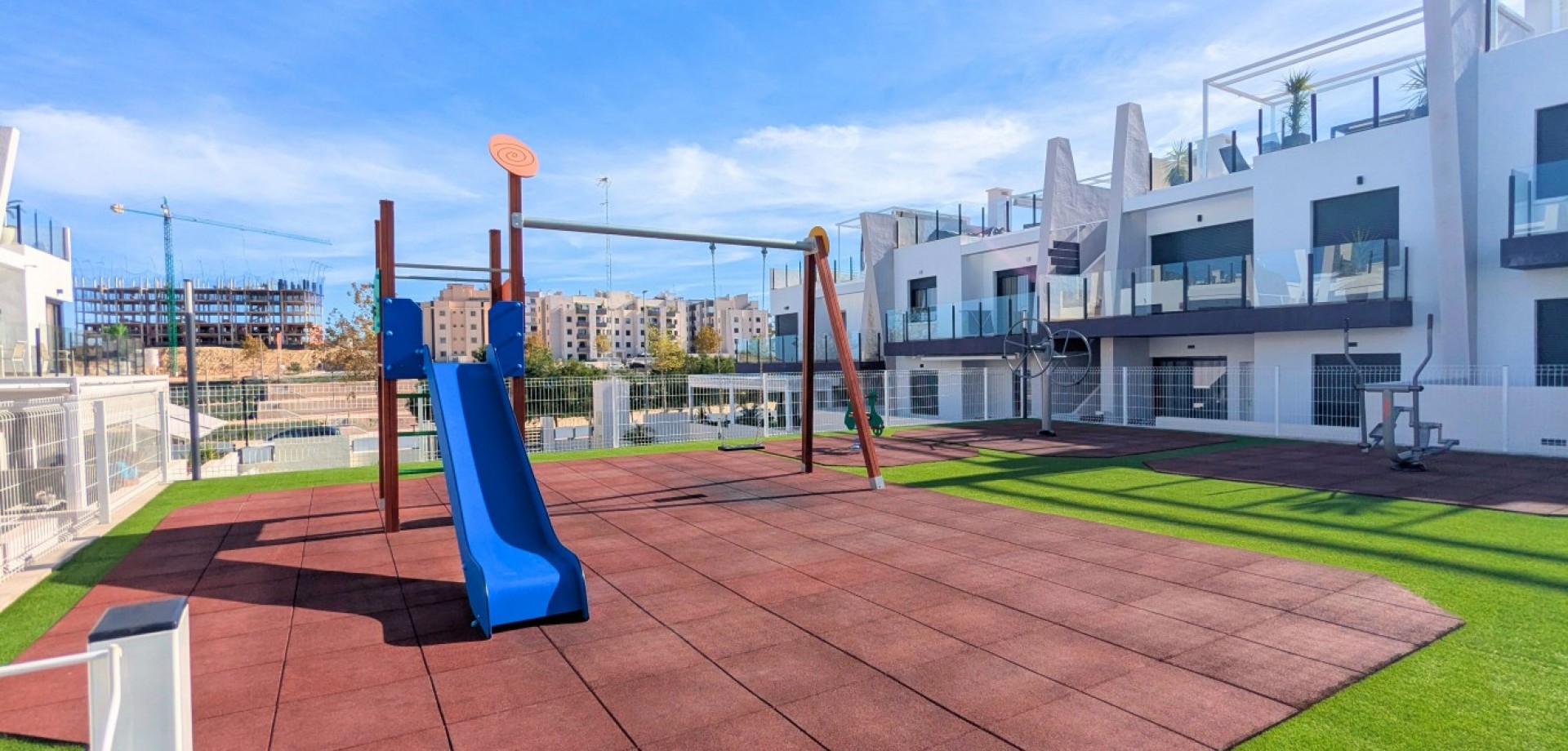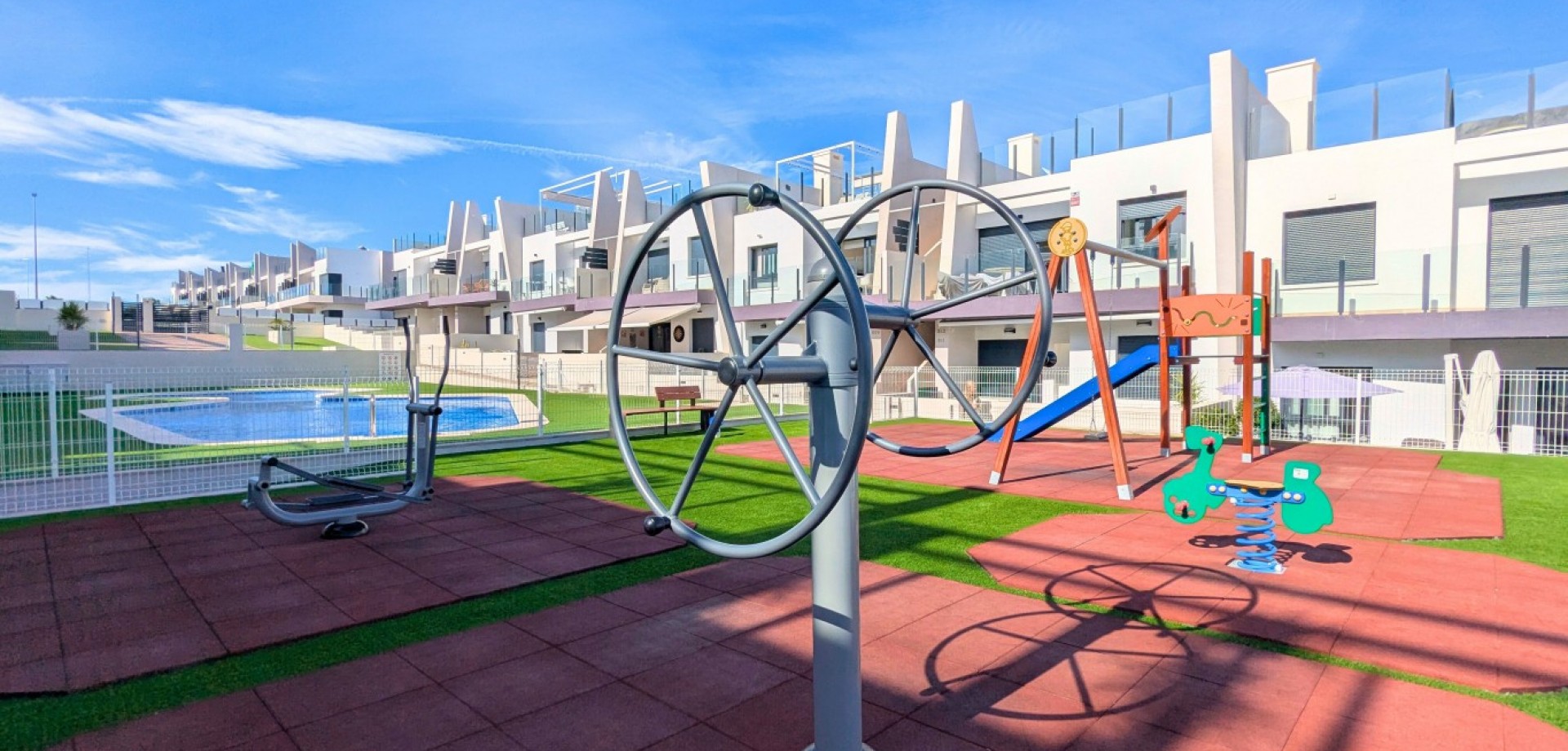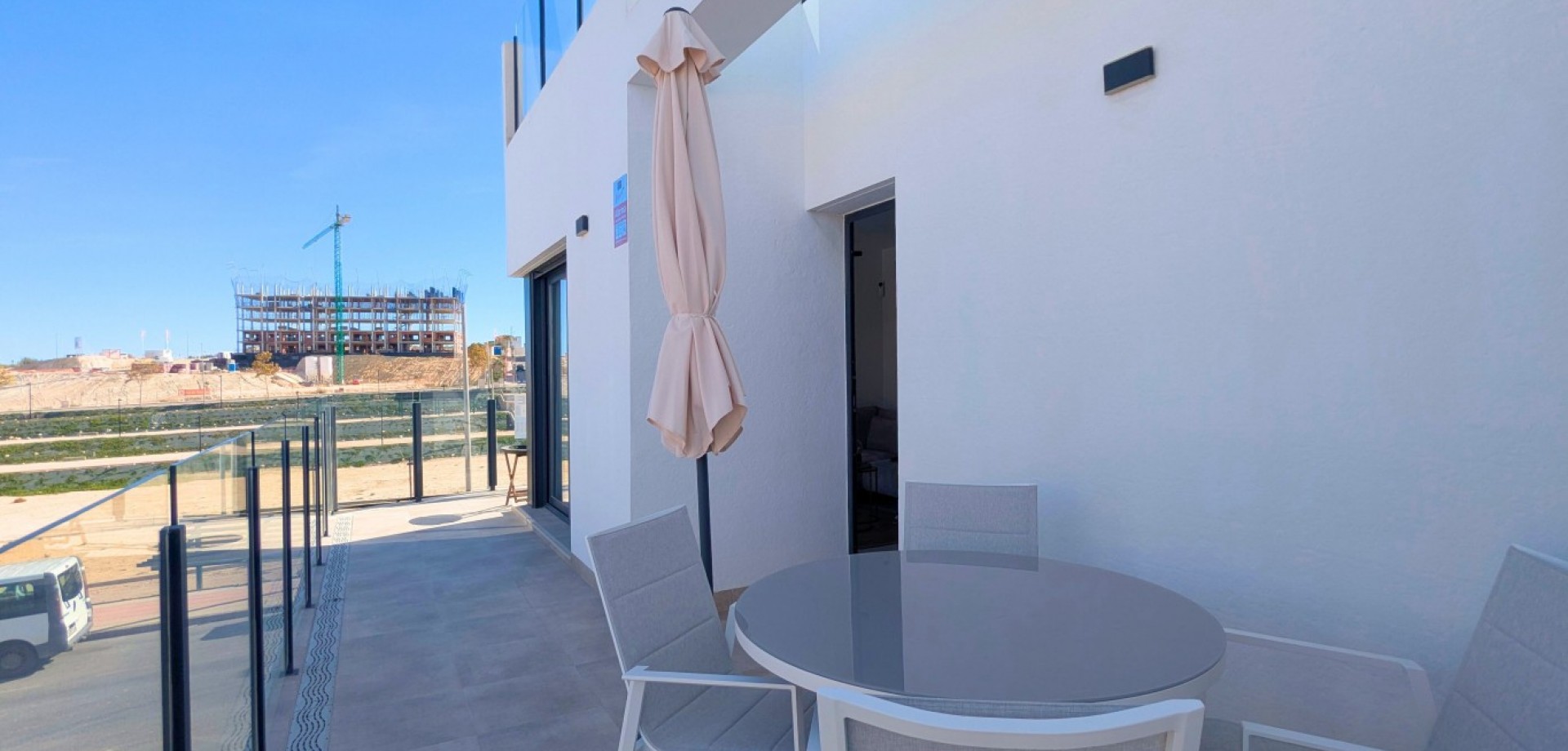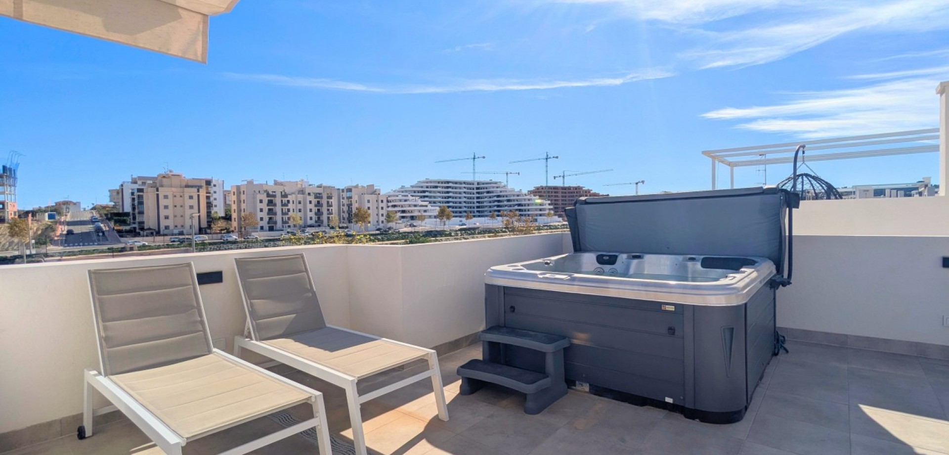 We present this exceptional corner penthouse in San Miguel de Salinas – a modern, uniquely designed home built in 2024, offering stunning views and outstanding outdoor living. Ideally located close to all amenities, this penthouse stands out immediately thanks to its unique layout, different from all other penthouses in the development. The interior is bright and welcoming, flooded with natural light throughout the day thanks to its corner position and large windows. Inside, the property features a custom-designed kitchen and sliding doors instead of standard doors, giving the home an elegant, open and modern feel. The living area connects beautifully to the outdoor spaces, making it ideal for both everyday living and entertaining. One of the key highlights is the impressive private rooftop solarium, fully equipped for outdoor enjoyment. It includes an outdoor kitchen, pergola, and even a shower, making it the perfect place to relax, dine, or enjoy the sunshine while taking in the panoramic views over the Torrevieja salt lake and the park in front. The community offers excellent shared facilities, including a large swimming pool and a children’s playground, ideal for families or those who enjoy resort-style living. The penthouse also comes with air conditioning, ensuring comfort all year round. This is a rare opportunity to own a high-quality, uniquely designed penthouse with exceptional outdoor features and one of the best views in the area.
