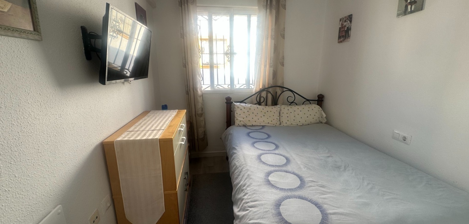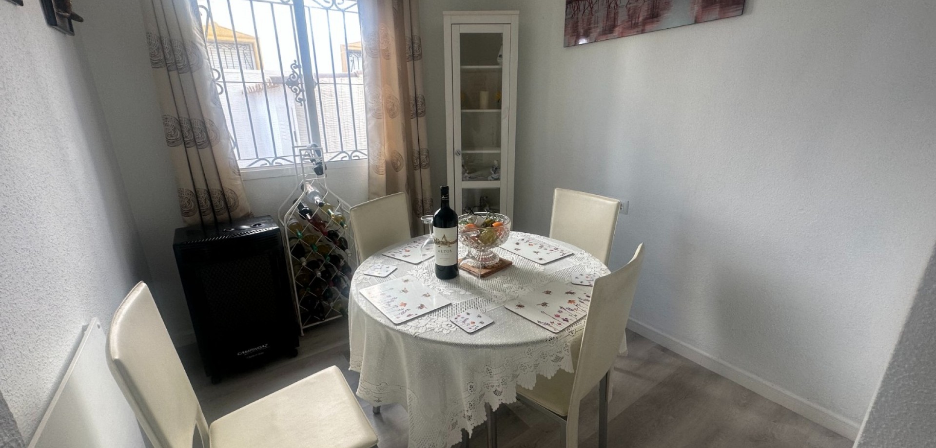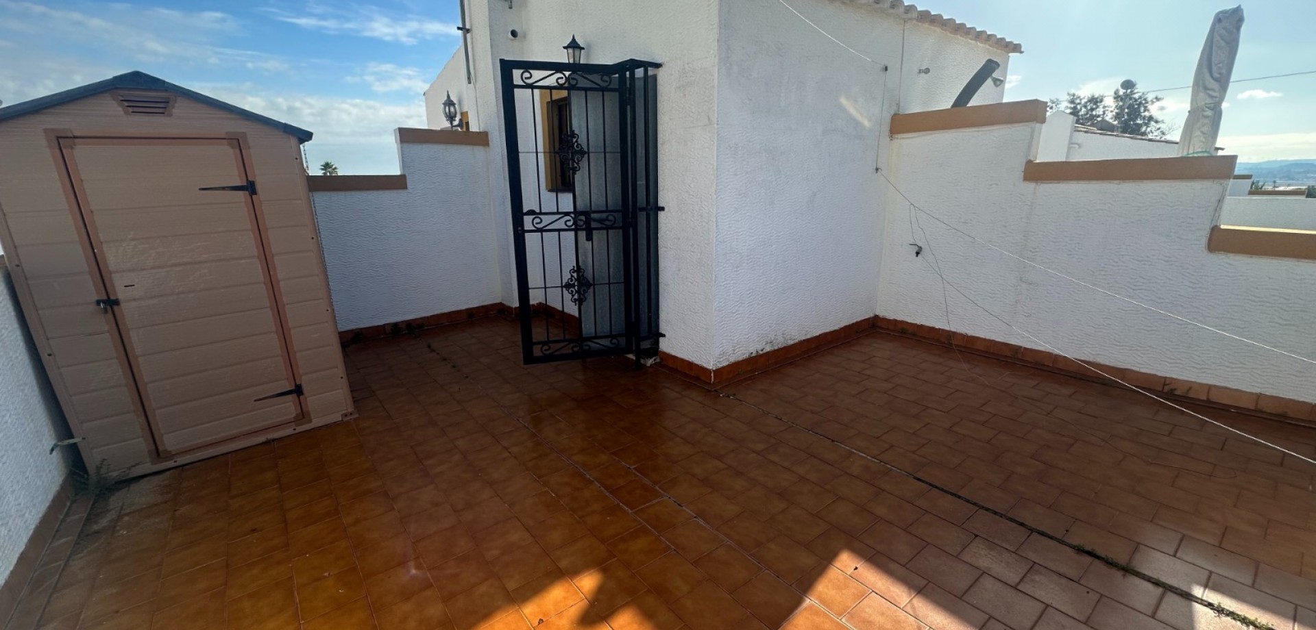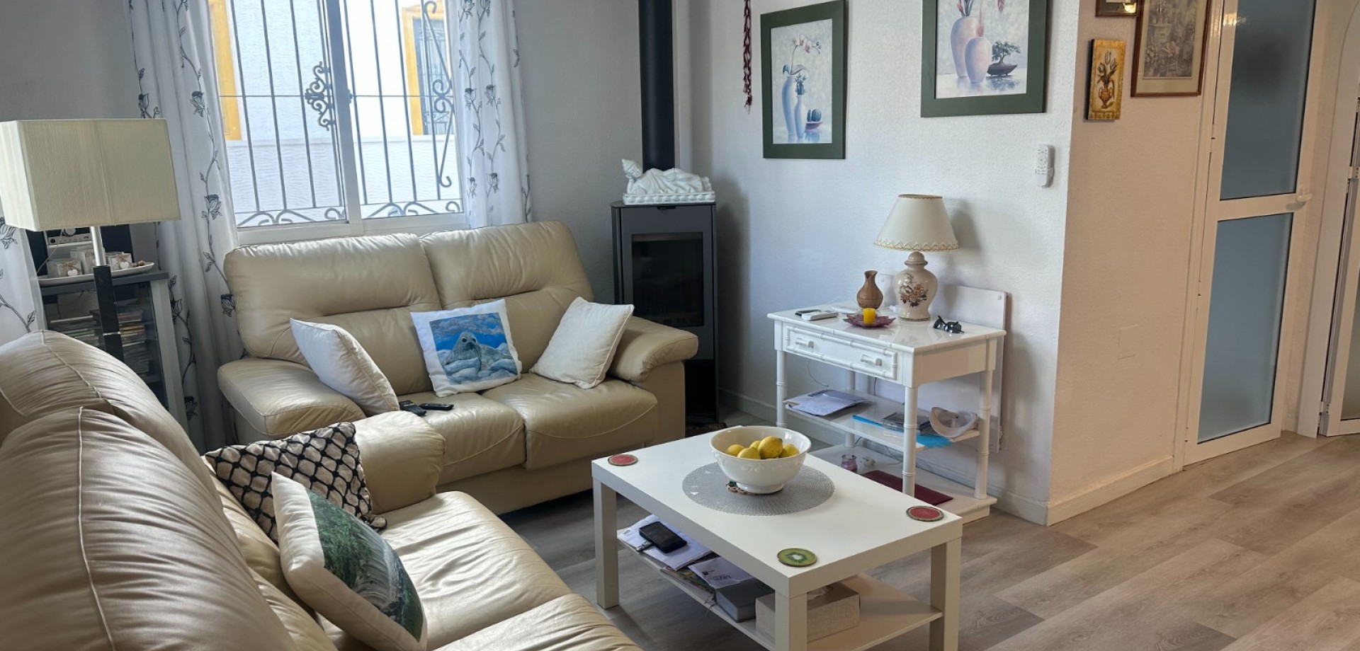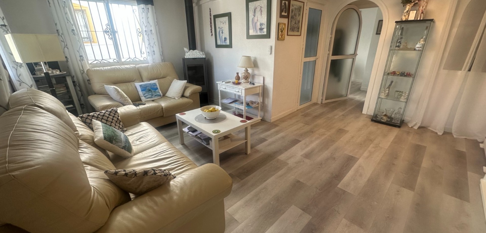 West facing quad townhouse in Entre Naranjos urbanization , Orihuela beside vistabella golf course. The house comprises of a great size garden with storage ,glazed terrace, open plan living/dining room with wood burner and separate kithen, double bedroom (currently used as a dining room) and bathroom with shower on the ground floor. On the first floor there are 2 more double bedrooms and a family bathroom and a terrace off the main bedroom. Stairs lead up to the sun drenched solarium with nice views. The community pool is only 50 meters away