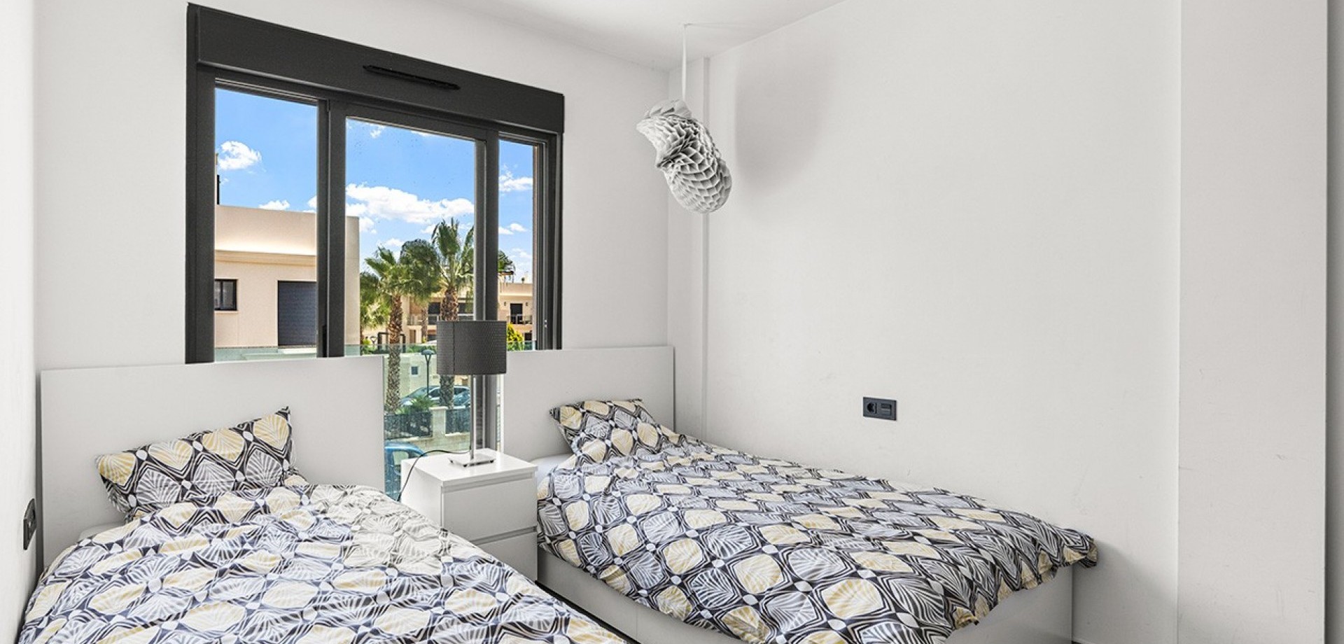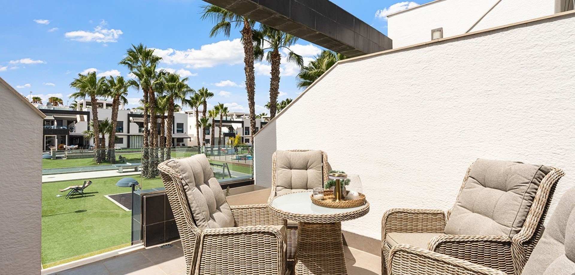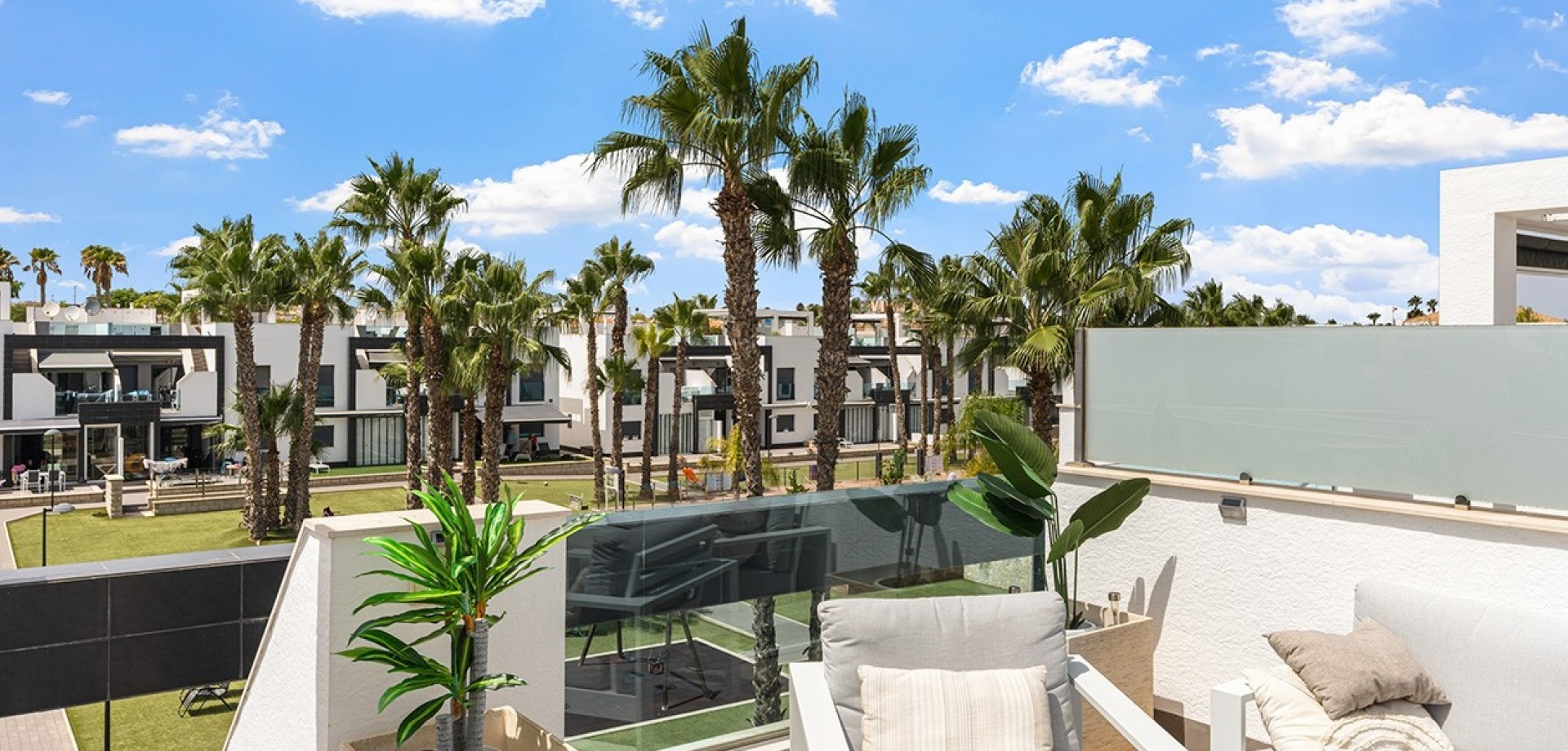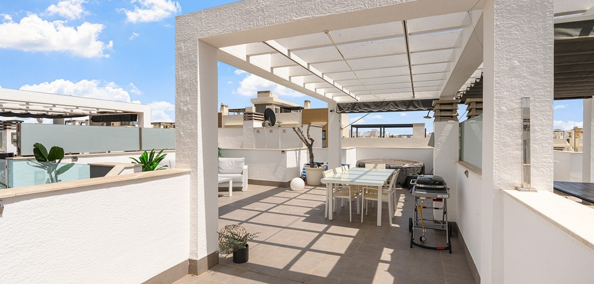 Costa Blanca Eiendom presents this elegant penthouse located in the prestigious Oasis Beach residential complex, in the heart of La Zenia, just steps away from the renowned Zenia Boulevard shopping centre. This property perfectly combines contemporary design, comfort and an unbeatable location, offering the ideal setting both for year-round living and as a second home by the sea. The home features two spacious bedrooms, one of them en-suite with views over the beautifully landscaped communal gardens, and two modern bathrooms fitted with high-quality materials and underfloor heating. The open-plan kitchen flows seamlessly into the bright living-dining area, which extends to a charming private terrace with awning, perfect for moments of relaxation. The property stands out for its large private rooftop solarium, designed for leisure and outdoor enjoyment, equipped with water, electricity, ambient lighting, a covered dining area and space to install a jacuzzi, creating an exclusive and inviting atmosphere. Additional features include hot and cold air conditioning throughout and a secure underground parking space. The property is sold furnished, except for personal belongings, and is ready to move into. The residential complex offers two large communal swimming pools with sunbathing and relaxation areas, a separate children’s pool, playgrounds and impeccably maintained gardens, all within a safe and peaceful environment next to a green park area. The location is simply perfect: just one minute’s walk from Zenia Boulevard with over 150 shops, restaurants and leisure options; only 20 minutes on foot to the beaches of La Zenia and Playa Flamenca, both known for their golden sand and crystal-clear waters; and just a short drive to three prestigious golf courses – Villamartín, Las Ramblas and Campoamor. In addition, it is well connected to local supermarkets, weekly markets and the airports of Alicante and Murcia, just 45 minutes away via the AP-7 motorway. This penthouse brings together all the qualities to make it an exceptional property: a privileged location, unique outdoor spaces and access to first-class services. Contact us today for more information, or join one of our no-obligation tours to visit this wonderful project.