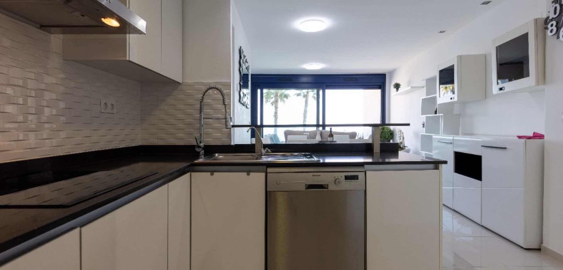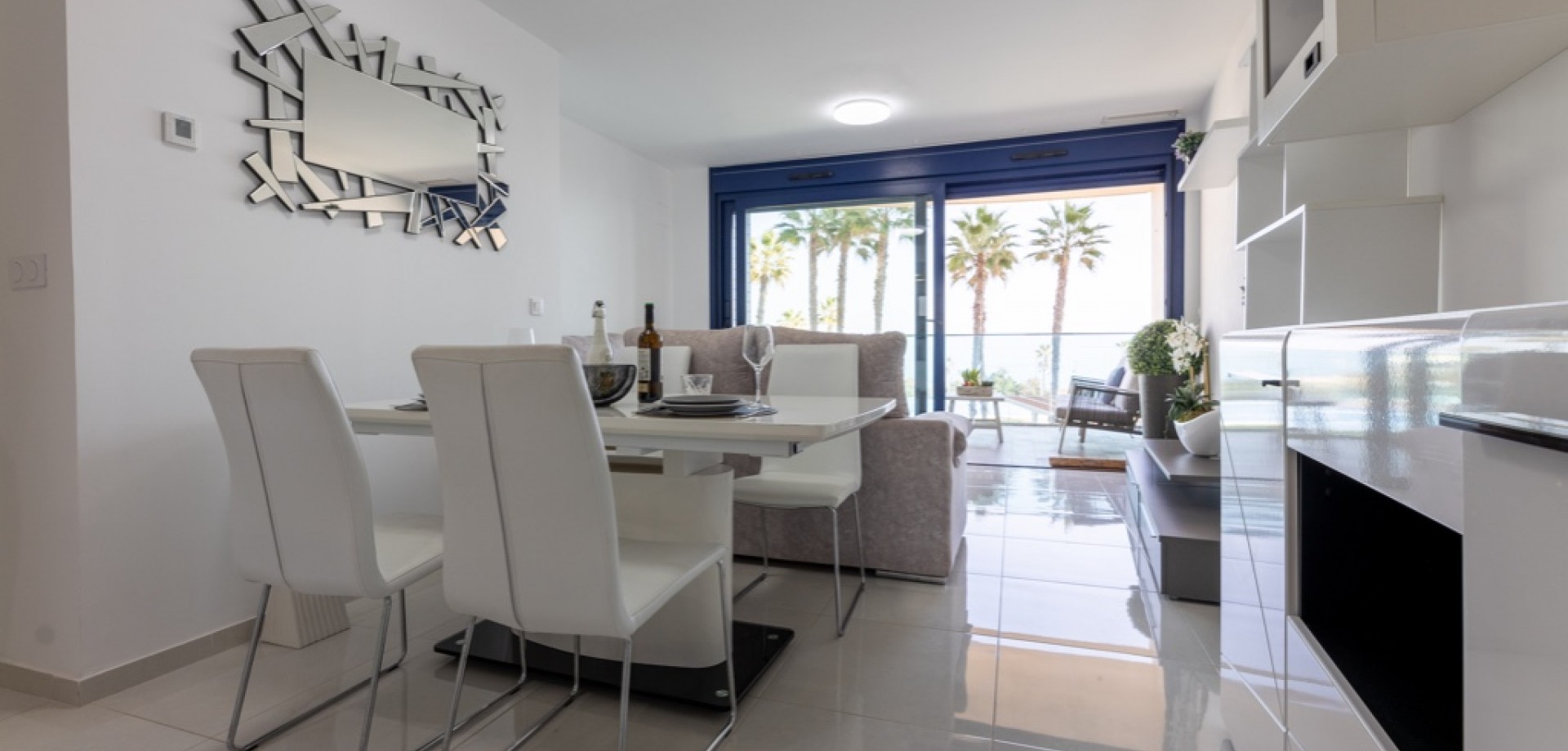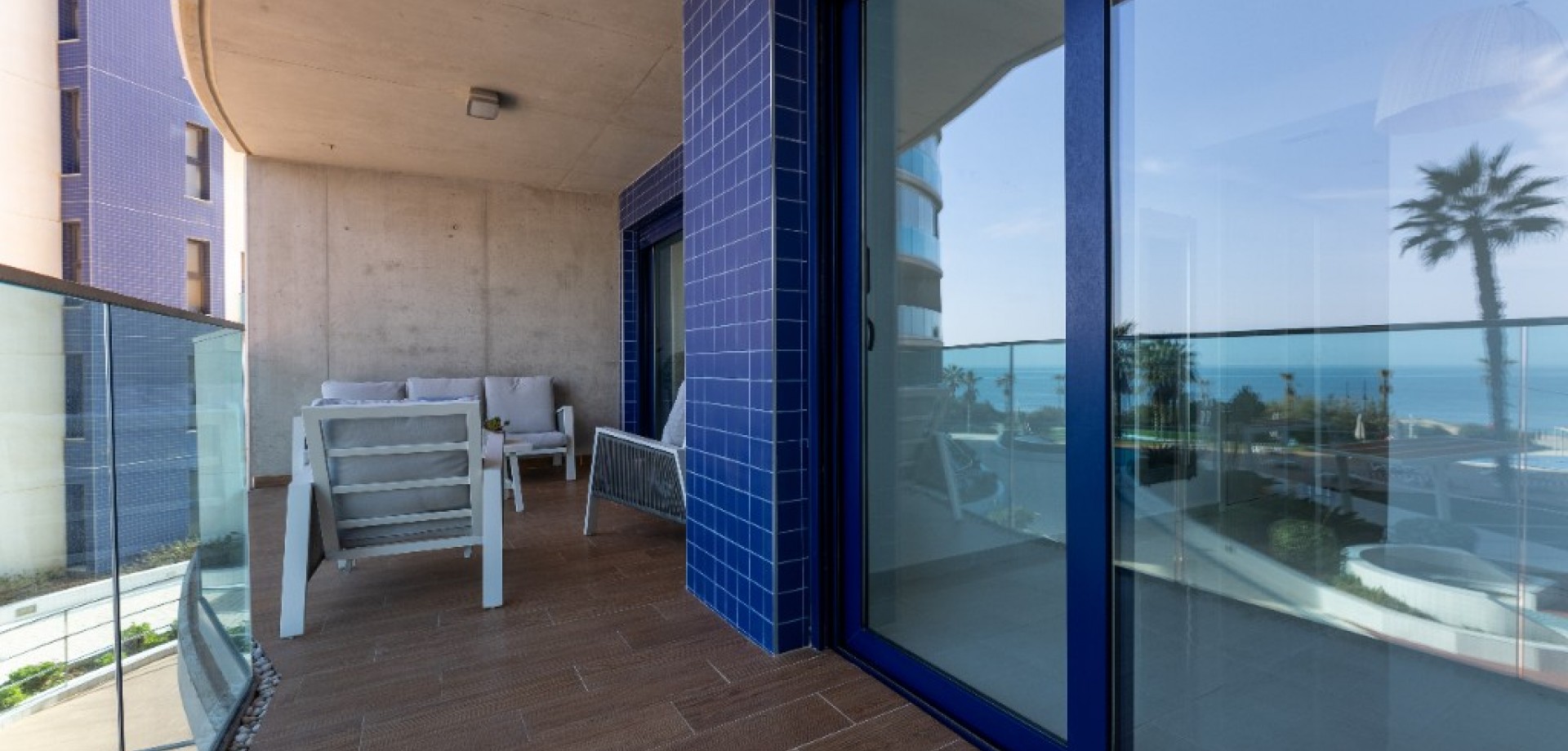 For sale apartment on the beachfront in a gated luxury community "Sea Senses", Punta Prima. We offer you for sale this beautiful apartment situated in the best frontline community in Punta Prima - in "Sea Senses". On the first spacious terrace you can enjoy panoramic sea views and the communal areas, and from the second one surrounding beauty. Apartment consists of 2 bedrooms, 2 bathrooms, living room, fully equipped kitchen with breakfast bar and utility room. The residential complex ¨Sea Senses¨ has landscaped area with infinity pool. One of the pools is heated, the other - with a Jacuzzi, water slides and a water massage bed. There is a cafe and two bars. The complex is equipped with sports facilities: paddle court and a basketball playground, gym overlooking the sea, spa with Turkish and Finish Saunas, children's playground with a toy house, ping pong, zone with free wifi, as well as underground parking. In walking distance there are restaurants, shopping centers, bus stop, supermarket, bank offices of Punta Prima. Also within 10-minute drive you will find several golf courses, water park, clubs and discos, go-karting, sports centers, yacht port and a variety of stunning sandy beaches of Costa Blanca.