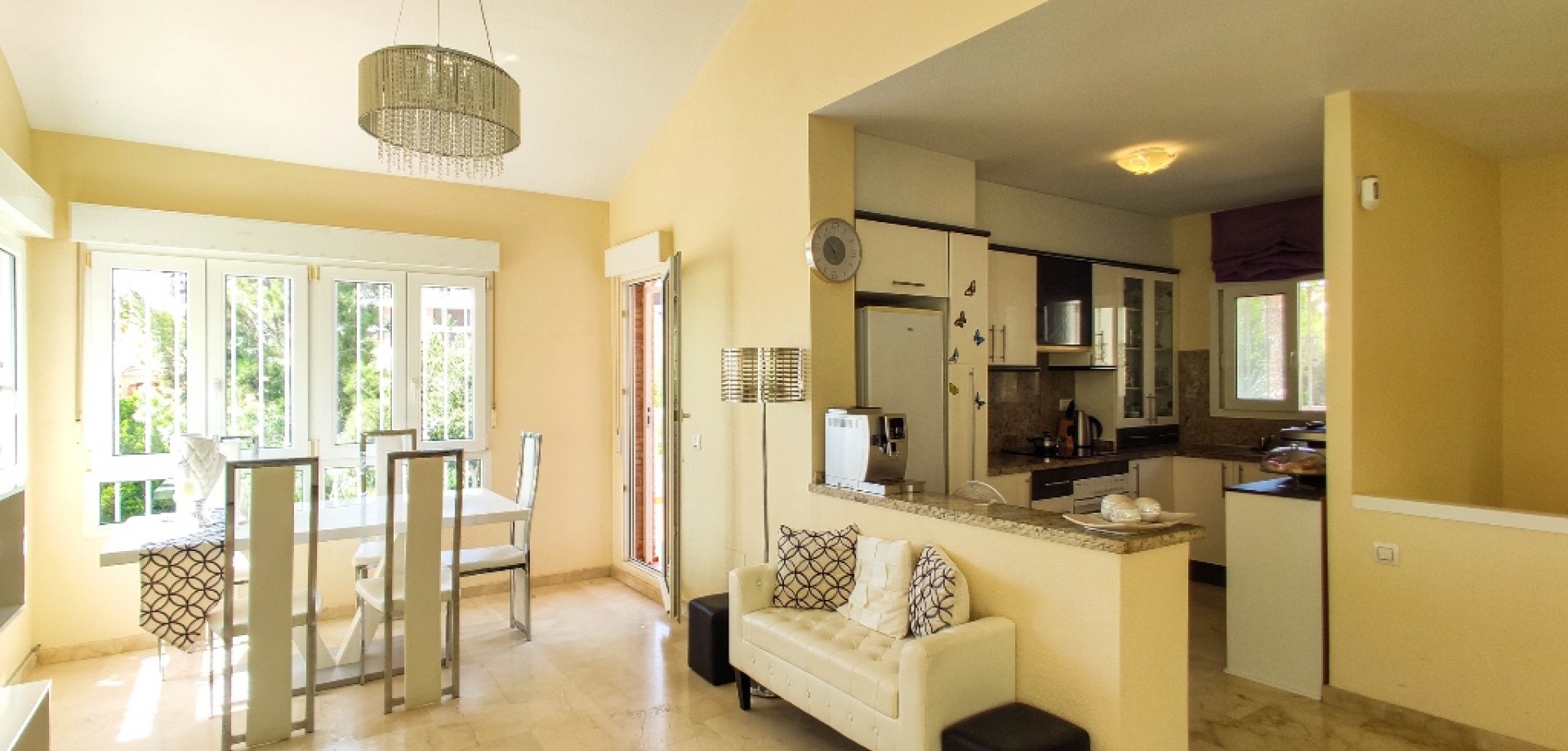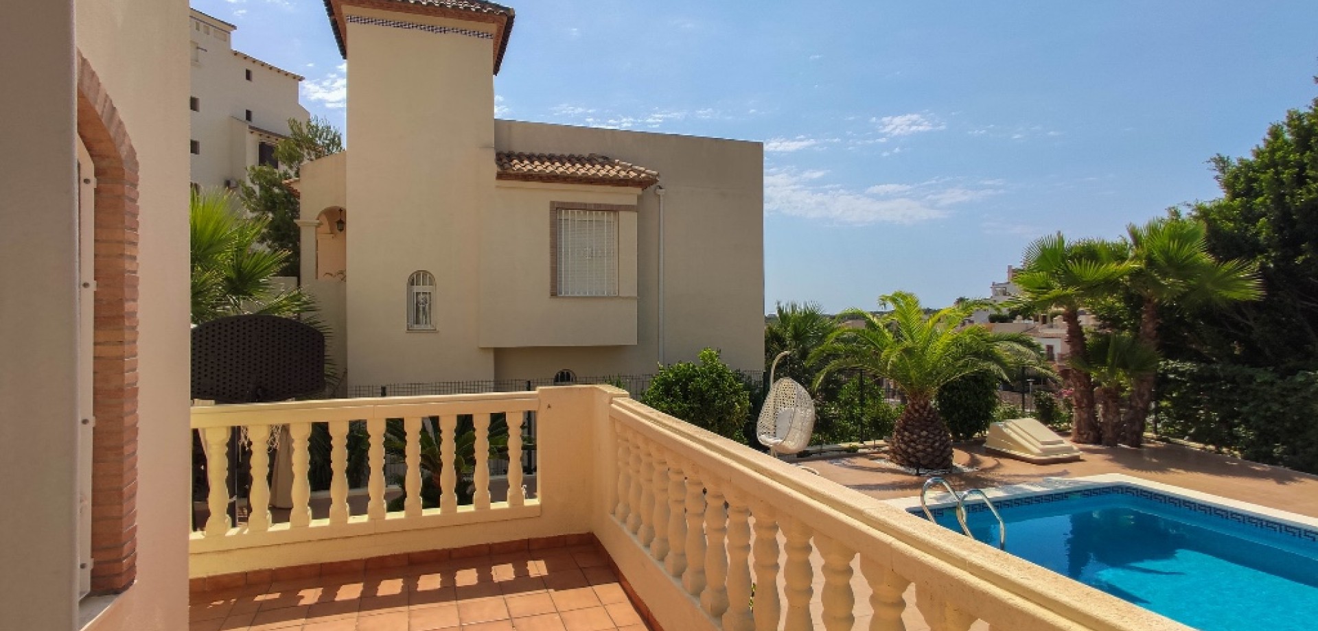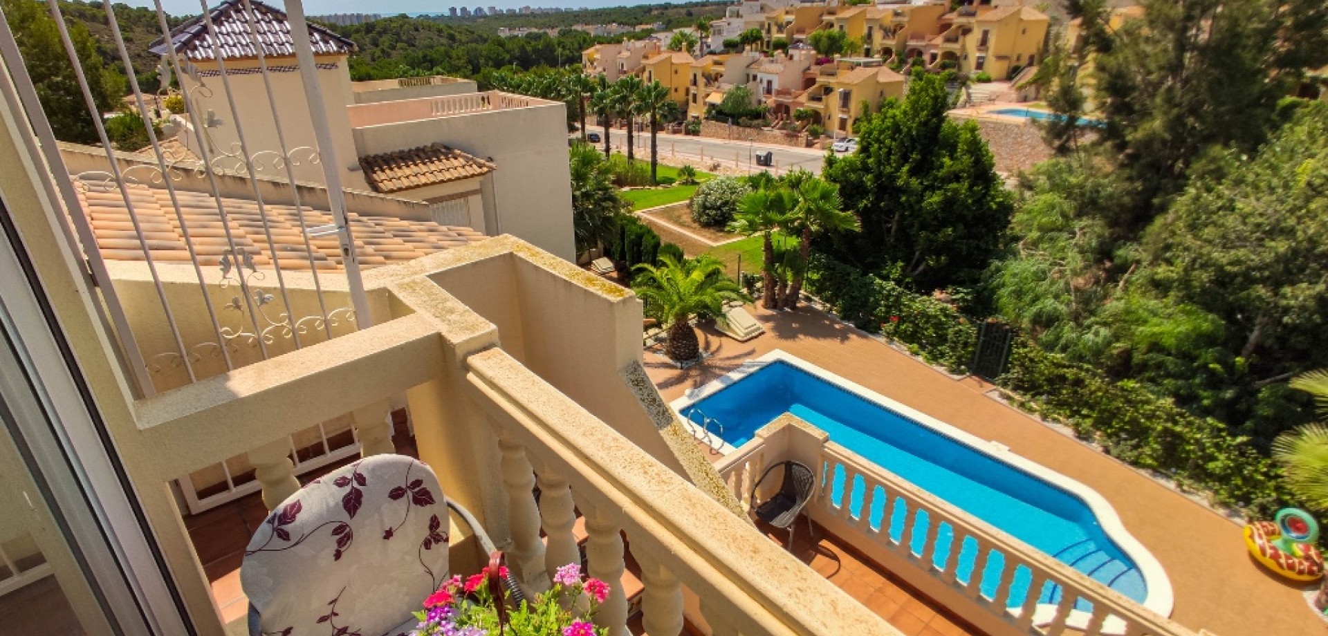 Magnificent villa close to the golf in Las Ramblas. The south-facing detached house consists of 4 bedrooms, 4 bathrooms, cozy living area, kitchen and a terrace with sea views and all flooring is tiled with marble. This property already has everything for your comfort, will be sold fully furnished and as addition has lovely garden with private swimming pool (9*4 m2) and private parking (12.5 m2). Las Ramblas is situated in Orihuela Costa on the Southern Costa Blanca on natural countryside around a stunning 18 hole golf course with the sea views. But if you are golf lover, and prefer variety - within 500 m you'll find another famous Campoamor Golf. This area is a good for permanent comfortable living - within a couple of minutes there is CC with bars, restaurants, small shops, supermarkets ALDI and Mercadona, and international "Limonar" school only 5 minutes driving. Located just 10 km from Torrevieja town and 4 km from the beautiful sandy beaches of Campoamor and La Zenia.