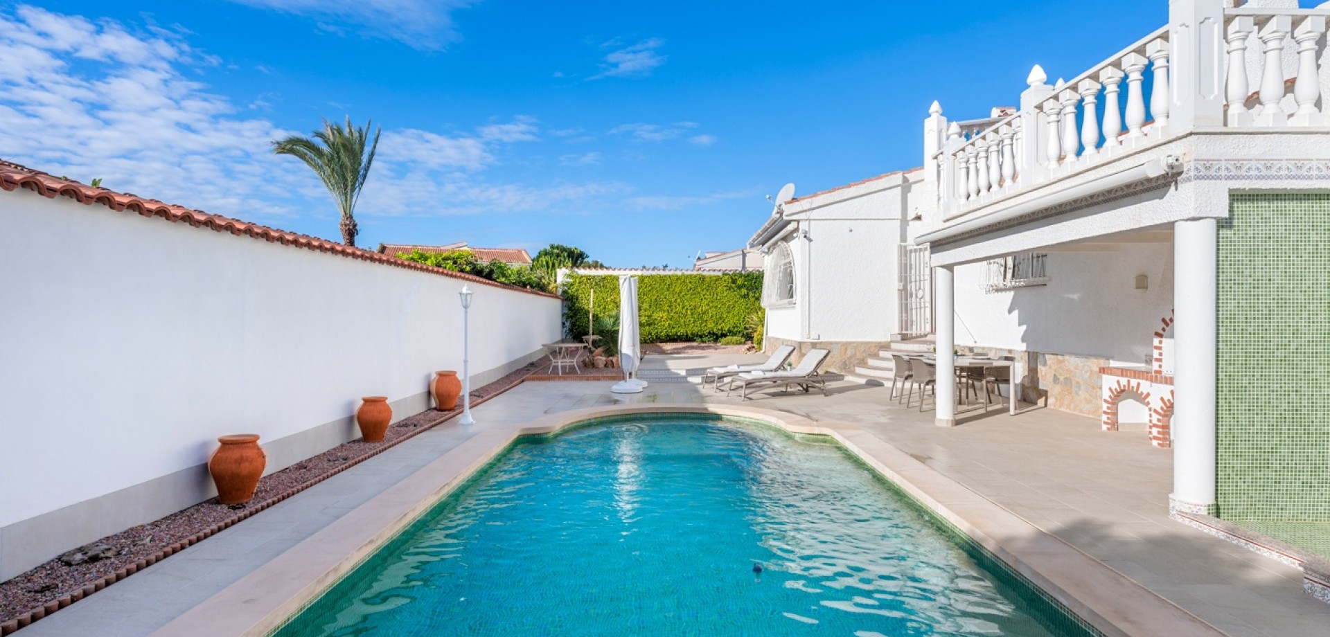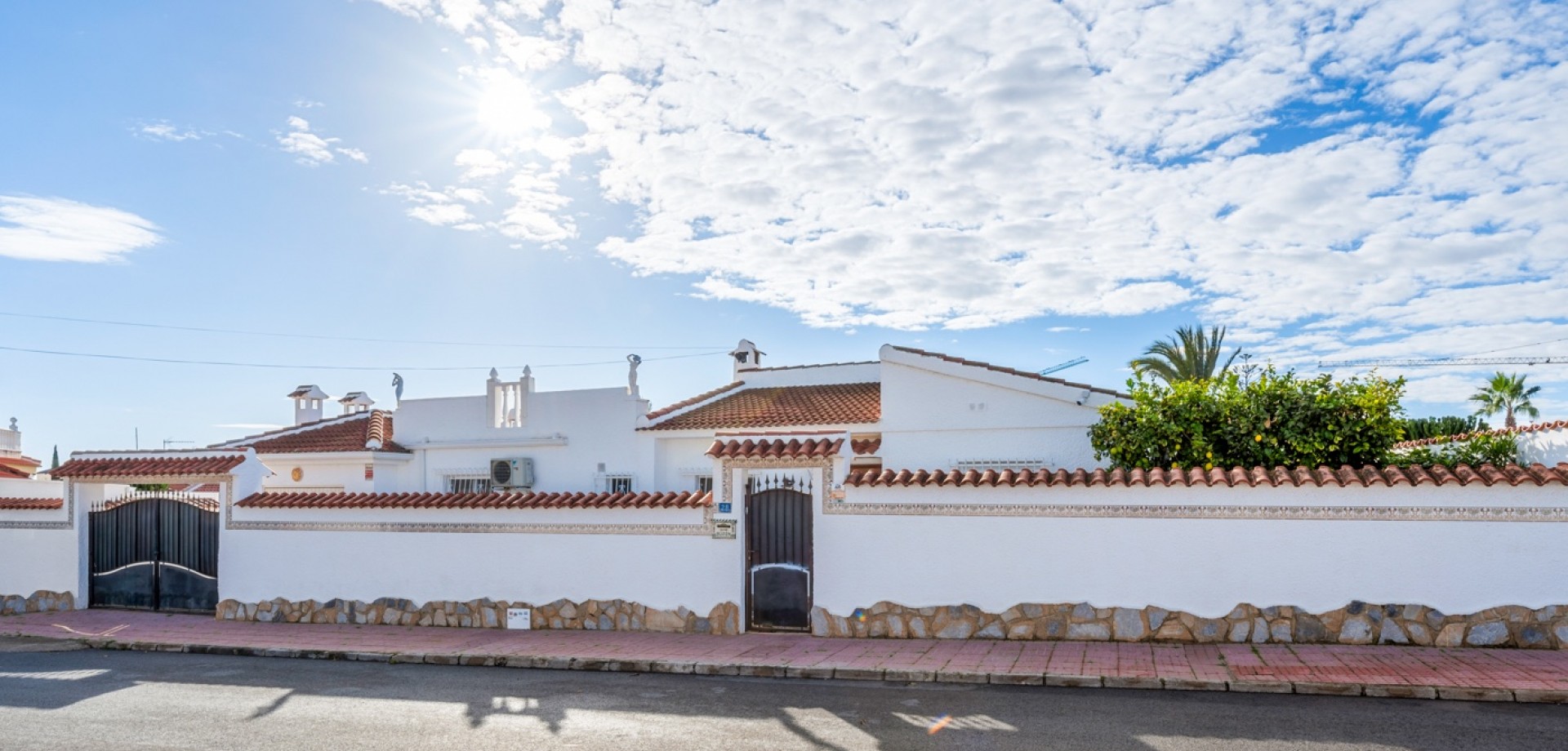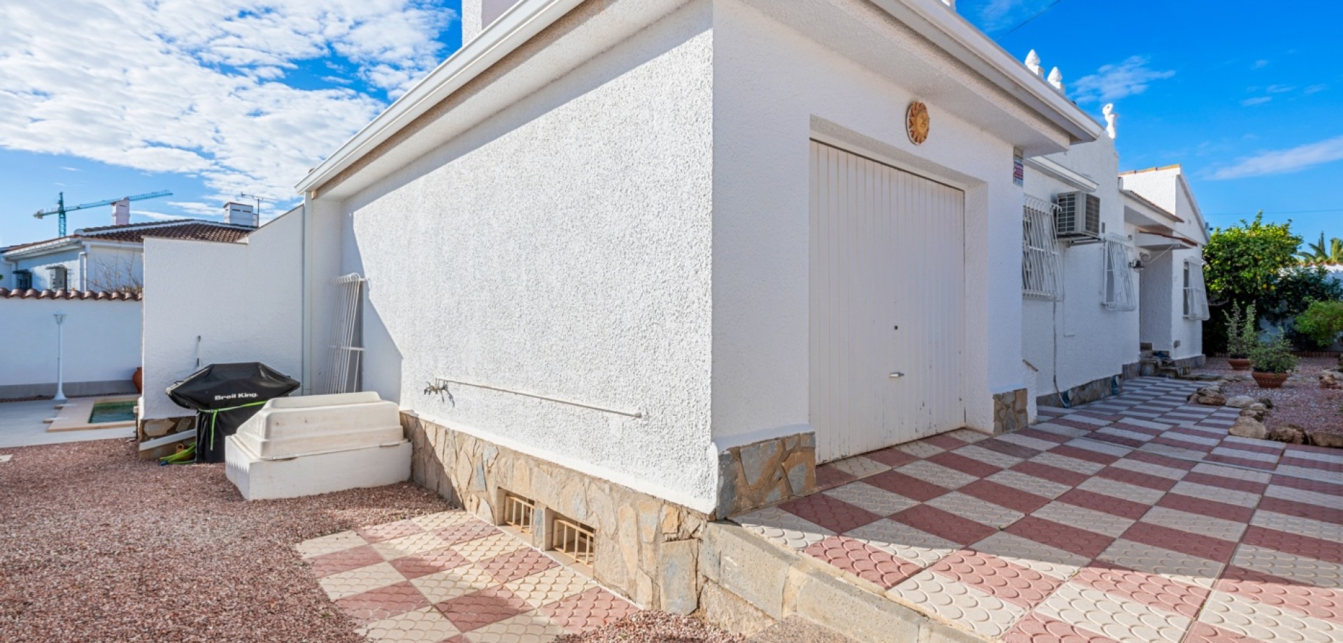 This beautiful detached villa is located in Ciudad Quesada, just a 5-minute walk from the town center, offering convenience while maintaining privacy and comfort. The property sits on a generous 500 m² plot and features 146 m² of built area. The house is distributed into three spacious bedrooms and two bathrooms, with the master bedroom benefiting from an en-suite bathroom. The villa boasts a bright and spacious living/dining area filled with natural light, creating a warm and welcoming atmosphere. The independent kitchen has direct access to the rear of the property, where you will find a private swimming pool, an outdoor kitchen, and access to the solarium—perfect for enjoying the Mediterranean lifestyle. From the side of the kitchen, there is also direct access to the interior garage and to a versatile space located beneath the garage. This area is ideal to be used as an additional bedroom, a social or entertainment area, or a cozy studio/home office. The exterior area surrounds the entire house and features fruit trees, providing a pleasant and private outdoor environment. The property has been recently renovated and is presented in perfect condition, ready to move into. This property is an excellent opportunity for both permanent living and investment in one of the most sought-after areas of Ciudad Quesada.