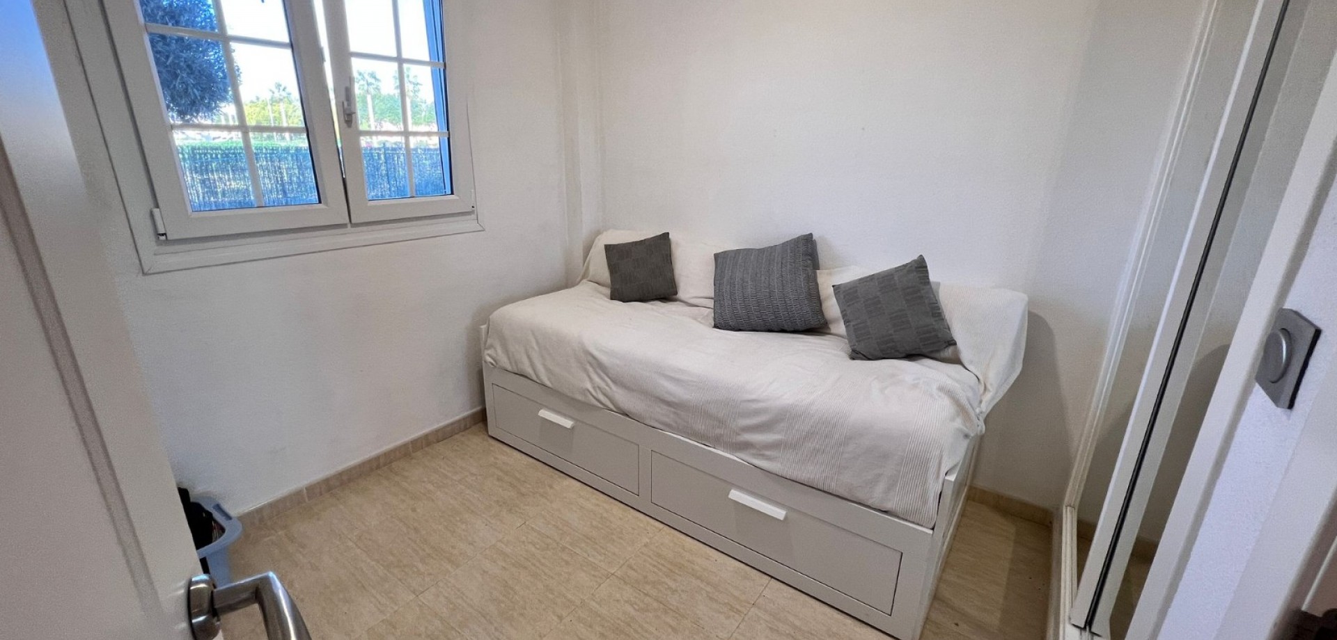 We are pleased to present this spacious two-bedroom corner apartment, situated on a large private plot within the secure, small-scale El Raso complex. With only 12 apartments, this gated complex offers a pleasant combination of tranquility, privacy, and comfort. The south-facing corner apartment boasts an exceptional amount of outdoor space, setting it apart from similar apartments in the area. The complex is accessible via an electric gate and includes a secure parking garage with a private parking space directly adjacent to the apartment. At the front of the building is a well-maintained communal swimming pool surrounded by mature gardens, as well as a convenient communal storage room. The apartment is particularly notable for its generous outdoor spaces. At the front is a covered terrace with two storage rooms, which extends into a spacious side and back garden. This outdoor space offers ample opportunities for relaxing, entertaining, or enjoying the pleasant climate year-round. Inside, the apartment features a bright, open-plan living, dining, and kitchen area with French doors, electric shutters, and air conditioning. Two well-sized bedrooms, both with fitted wardrobes, are accessible from the hallway. The master bedroom has direct access to the rear terrace. There is also a spacious bathroom with a shower and a practical utility room. This apartment combines the comfort of a low-maintenance home with the space and privacy typically expected of a villa. Situated in a quiet and popular location, a short distance from the coast, various amenities, and a golf course, this presents an attractive and unique living opportunity.