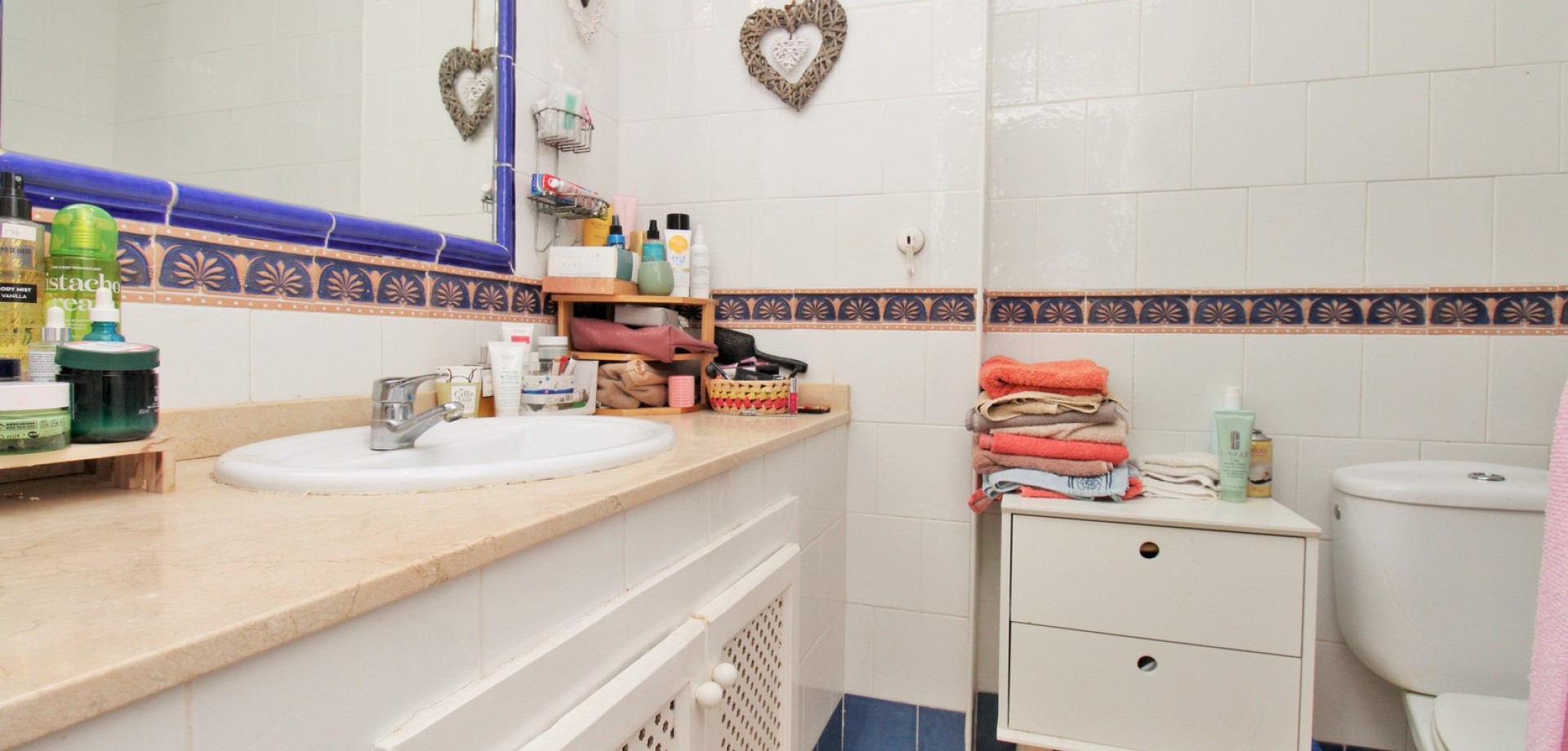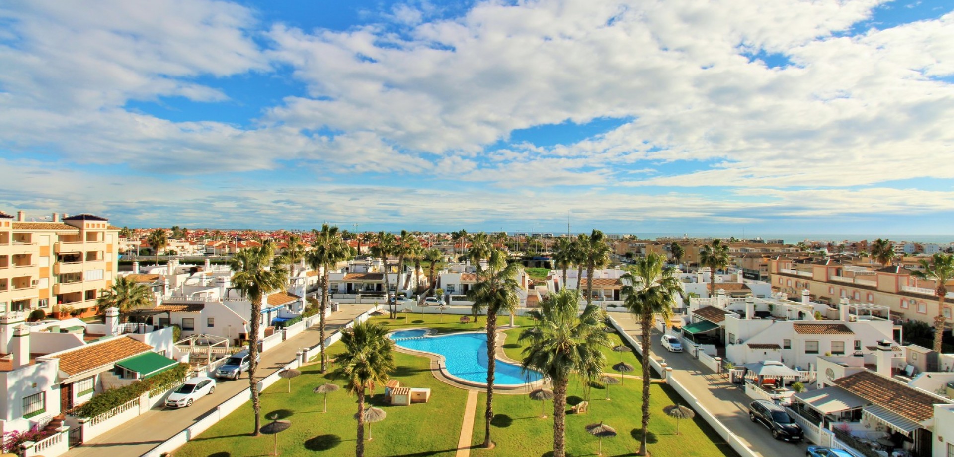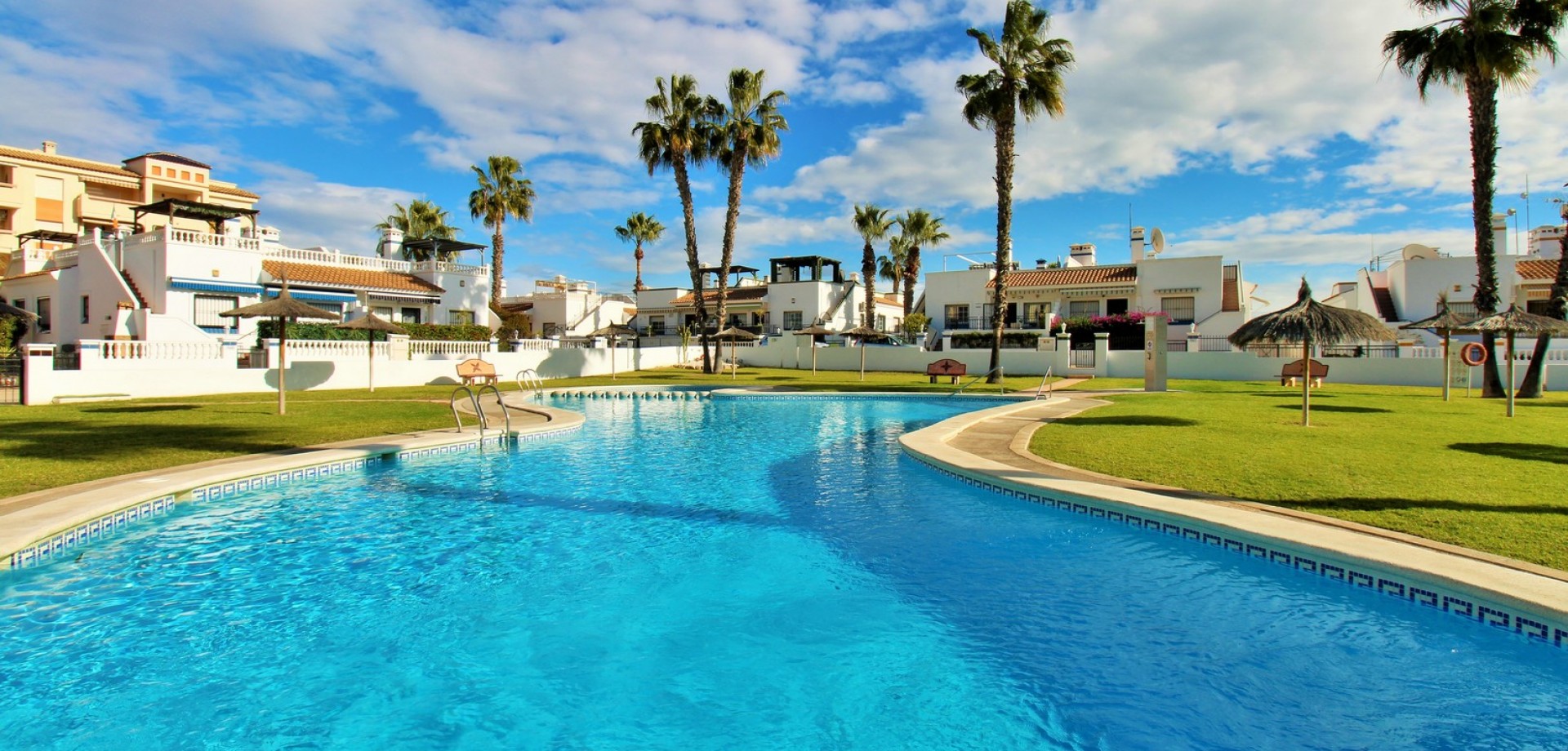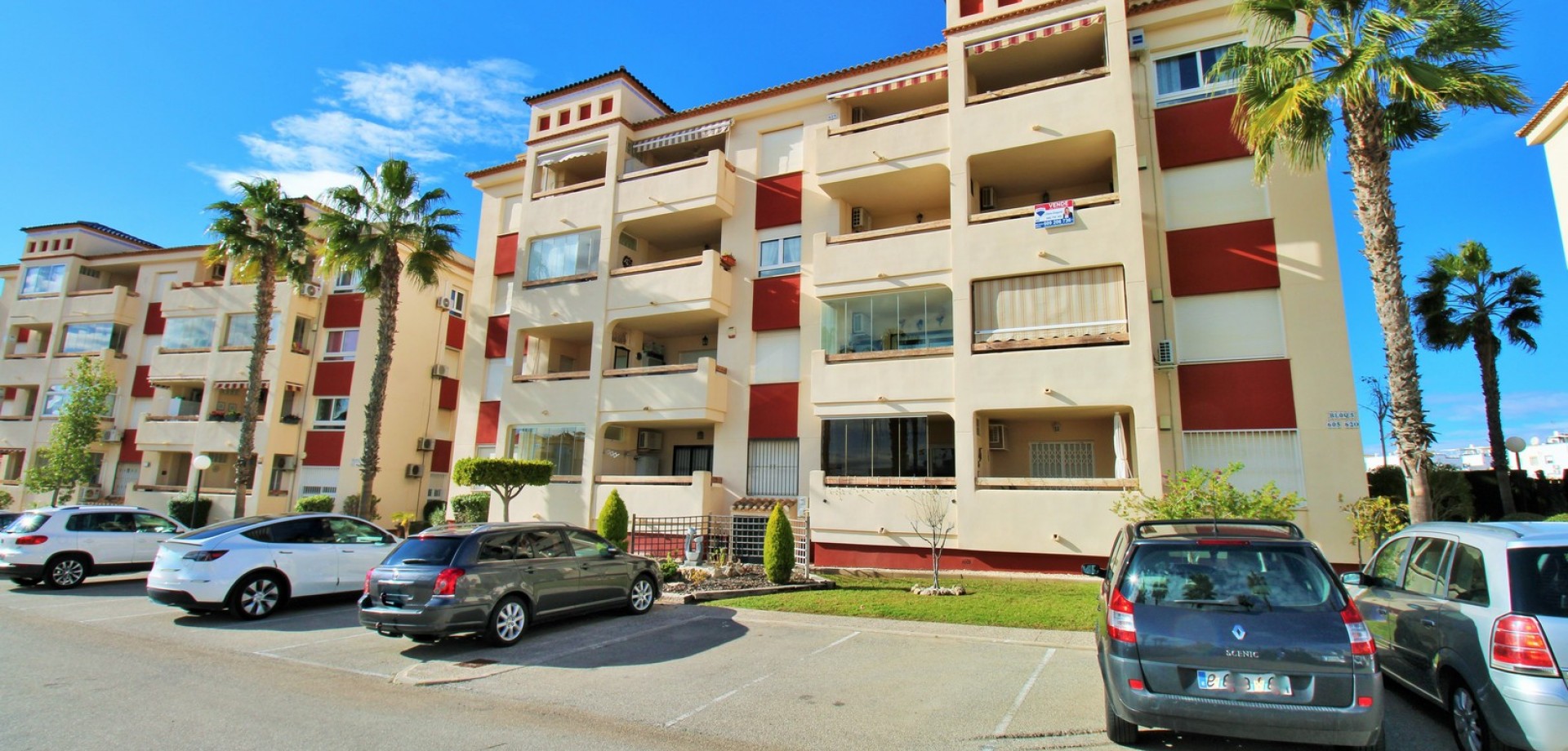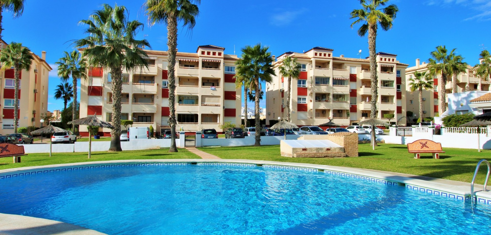 This well-presented ground floor 2-bedroom, 2-bathroom Jumilla-style apartment is located within the highly sought-after gated community of Jumilla II in Playa Flamenca. Positioned in one of the best blocks within the complex, the property enjoys open views over the communal swimming pool and landscaped garden areas. The accommodation comprises an entrance hallway, a bright lounge-dining area, a separate fully fitted kitchen, two double bedrooms with fitted wardrobes, and a family bathroom. The master bedroom benefits from an en-suite bathroom with a walk-in shower, offering excellent privacy and comfort. From the lounge, patio doors lead out to a covered front terrace with retractable glass curtains, creating a versatile outdoor living space that can be enjoyed year-round while taking in the attractive pool and garden views. The apartment is part of a secure, well-maintained community and is ideally located within walking distance of local amenities in La Florida, including The Abbey Tavern, Emerald Isle, local bars and restaurants, and the popular Saturday street market. The renowned Zenia Boulevard shopping centre is just a short distance away, along with several golf courses and a choice of blue-flag beaches along the Orihuela Costa coastline. An excellent option as a holiday home, permanent residence, or rental investment in one of Playa Flamenca’s most established residential communities.