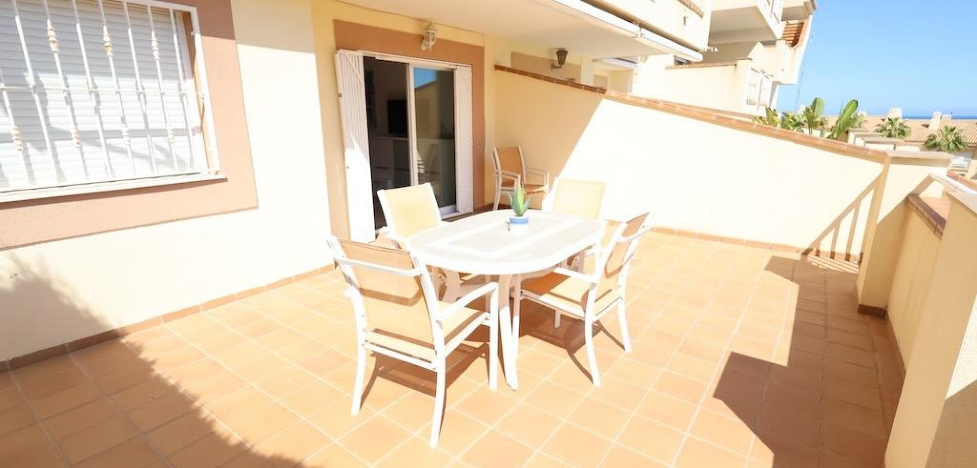 Aguamarina in Campoamor. Corner ground floor apartment , south facing with sea views and facing the communal pool with a large 20 m2 terrace, with direct access to the pool, the house has 70 m2 with 2 bedrooms and 1 bathroom, large independent kitchen with access to the covered patio, the house is sold furnished and with air conditioning and a closed garage, it is located close to all services and a few meters walk to the beach.