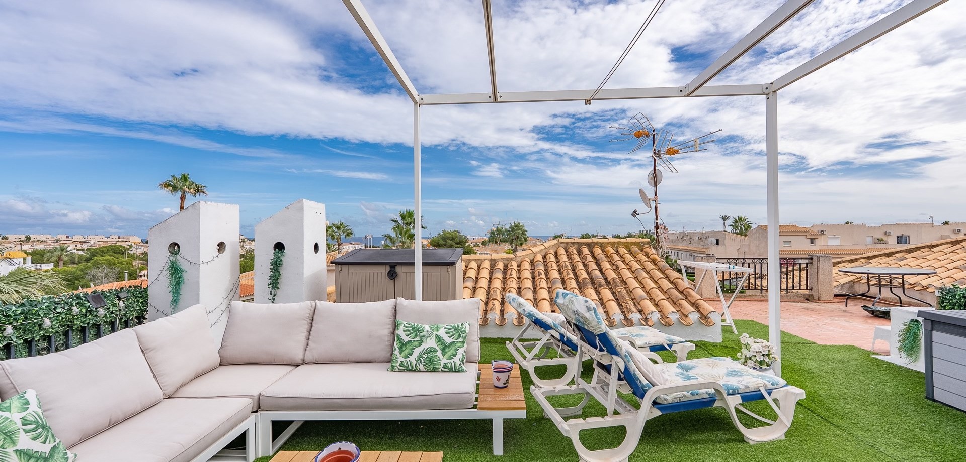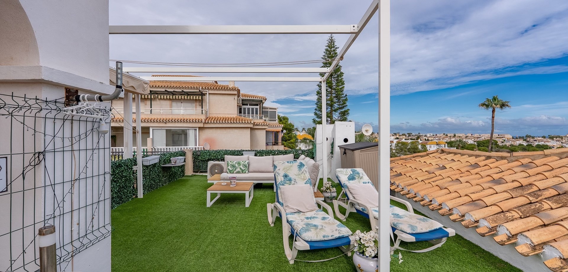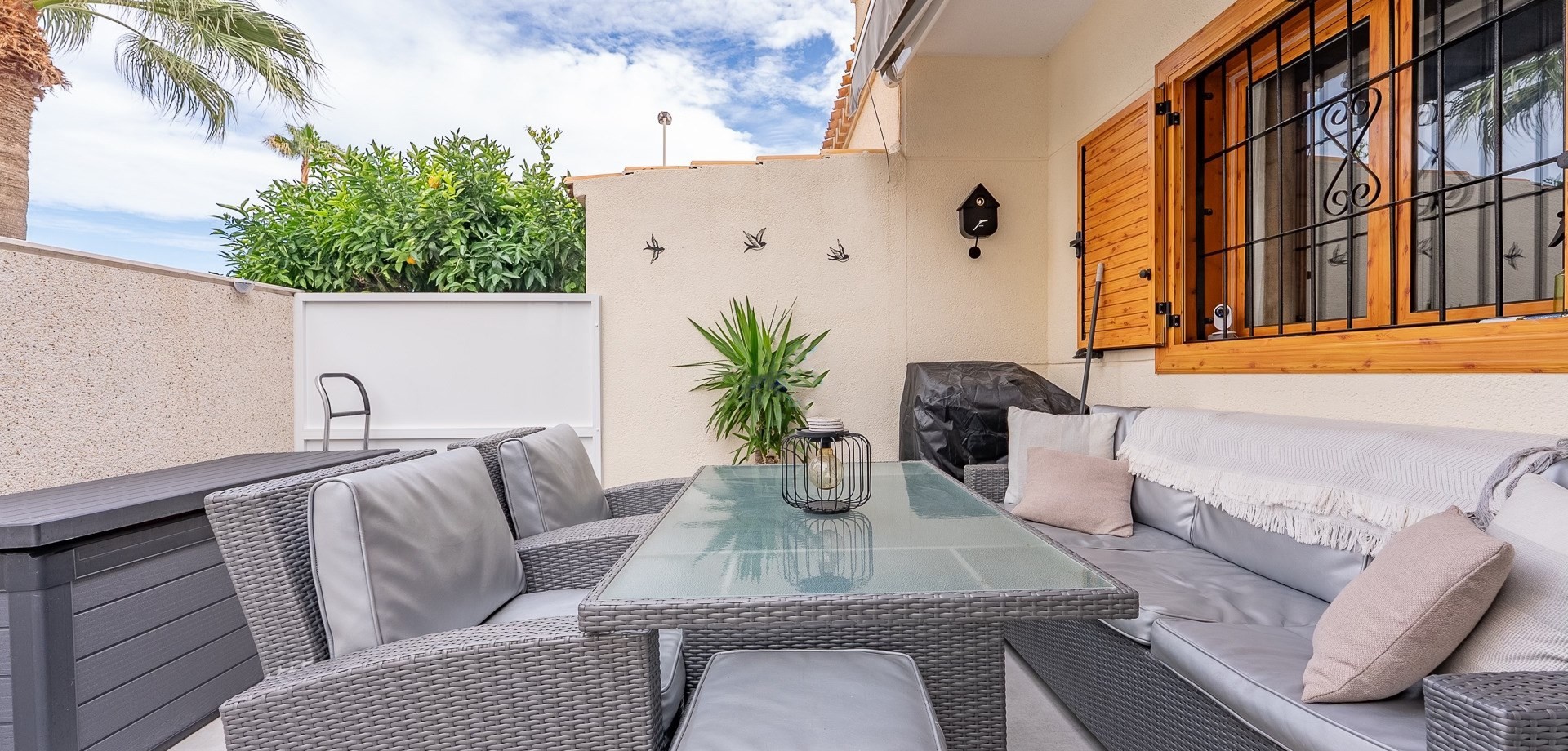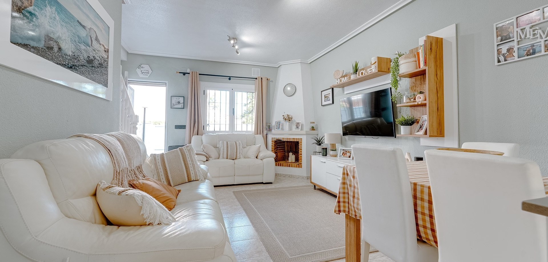 Modern 2-bedroom townhouse for sale in Playa Flamenca, Costa Blanca This modern 2-bedroom, 2-bathroom townhouse is located in the prestigious area of Playa Flamenca, Costa Blanca, one of the most sought-after locations for living, holiday homes and property investment on the Spanish coast. Thanks to its excellent location, all essential amenities are within walking distance, including restaurants, cafés, supermarkets, the popular La Zenia Boulevard shopping centre, and the renowned beaches of Orihuela Costa. The property is situated in a well-maintained, secure residential complex with a communal swimming pool, offering privacy, comfort and a peaceful environment. Despite its quiet setting, the townhouse enjoys a central location, making it an ideal choice for permanent living, holiday use or rental investment on the Costa Blanca. At the front of the property, there is an elegant terrace — perfect for enjoying morning coffee or outdoor dining under the Mediterranean sun. The ground floor features a spacious and bright living area with a dining space and an open-plan kitchen. The kitchen has been fully renovated, boasts a modern design and is equipped with high-quality appliances. A stylish bathroom with a walk-in shower is also located on this level. The upper floor offers two spacious double bedrooms, both with built-in wardrobes and individual air conditioning units. The master bedroom has access to a private balcony, while the second bedroom opens directly onto a large rooftop solarium terrace. This sun-drenched outdoor space is ideal for relaxing, entertaining guests and enjoying panoramic sea views and views of the surrounding area. This townhouse is an excellent opportunity for those looking to buy property near the sea in Spain, who value quality, comfort and a prime location. The excellent condition of the home, close proximity to the beaches and the well-developed local infrastructure make it one of the best real estate opportunities in Playa Flamenca.