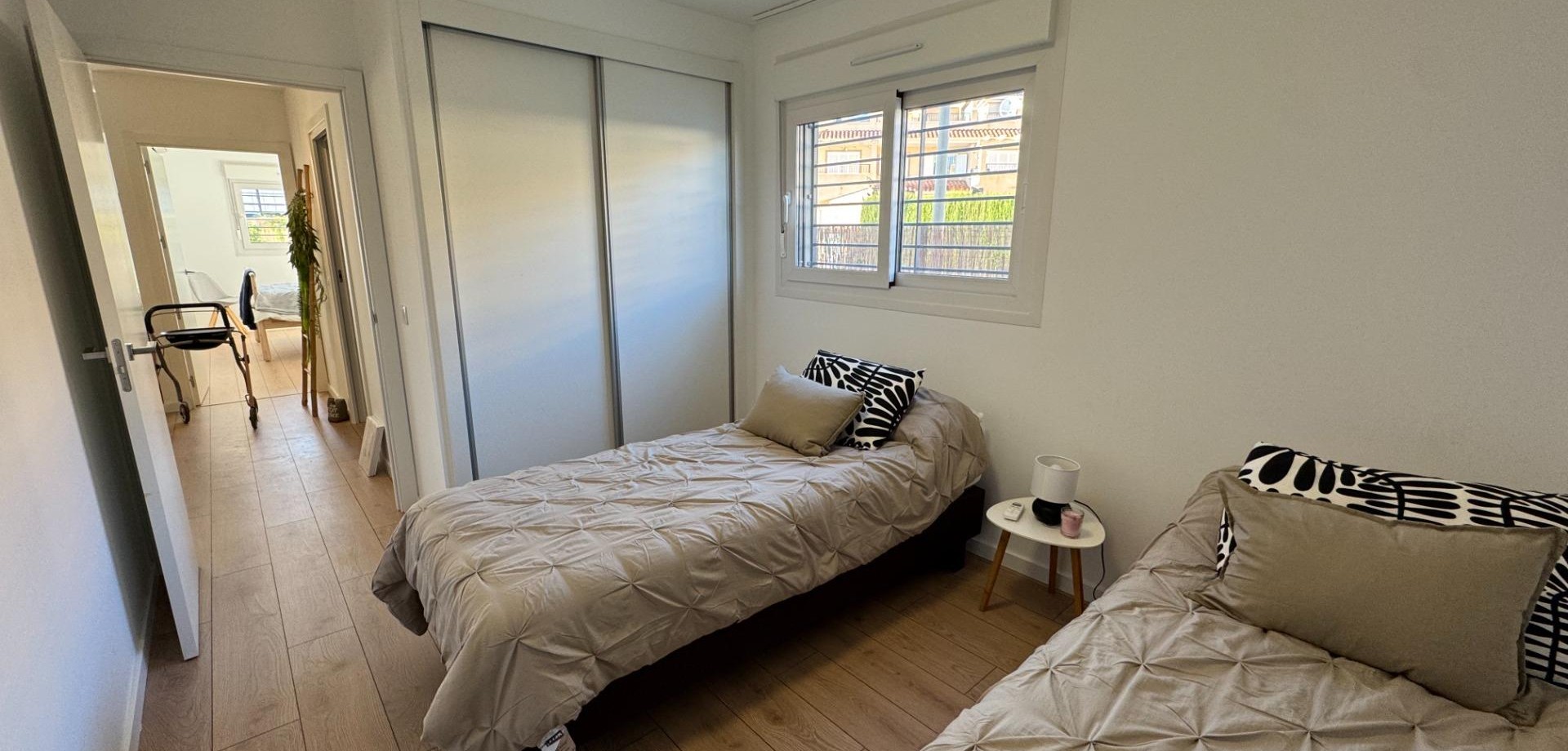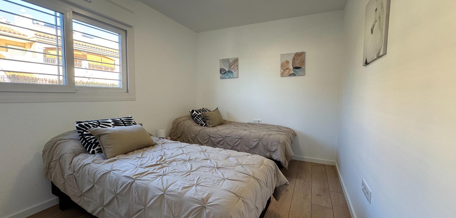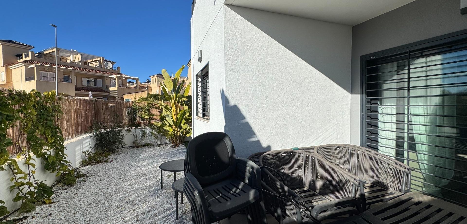 Elegant Ground-Floor Living in Mil Palmeras~~Discover refined coastal living in this beautiful 65 m2 ground-floor corner apartment, where comfort, accessibility, and style come together effortlessly. Designed to be fully accessible for people with reduced mobility, this home offers ease and elegance for every stage of life.~~The apartment features two stylish and comfortable bedrooms and a modern, fully equipped bathroom, creating a welcoming and harmonious living space. Thanks to its corner position and dual east–south orientation, the property is bathed in natural light throughout the day, allowing you to enjoy both the gentle morning sun and warm southern exposure.~~Step outside into your private garden, a charming outdoor oasis ideal for morning coffee, relaxed lunches, or quiet evenings surrounded by greenery.~~Set within a prestigious and well-maintained residential complex, residents enjoy access to a communal swimming pool, sun terrace, and a fully equipped gym. The golden beaches of Mil Palmeras are just five minutes away by car, offering the perfect balance between tranquility and the Mediterranean lifestyle.~~The apartment is presented in excellent condition and ready to move into, featuring air conditioning and built-in wardrobes for maximum comfort and functionality. A private parking space and storage room are included, ensuring convenience and peace of mind.~~A rare opportunity to own a bright, accessible, and elegantly designed home close to the sea.