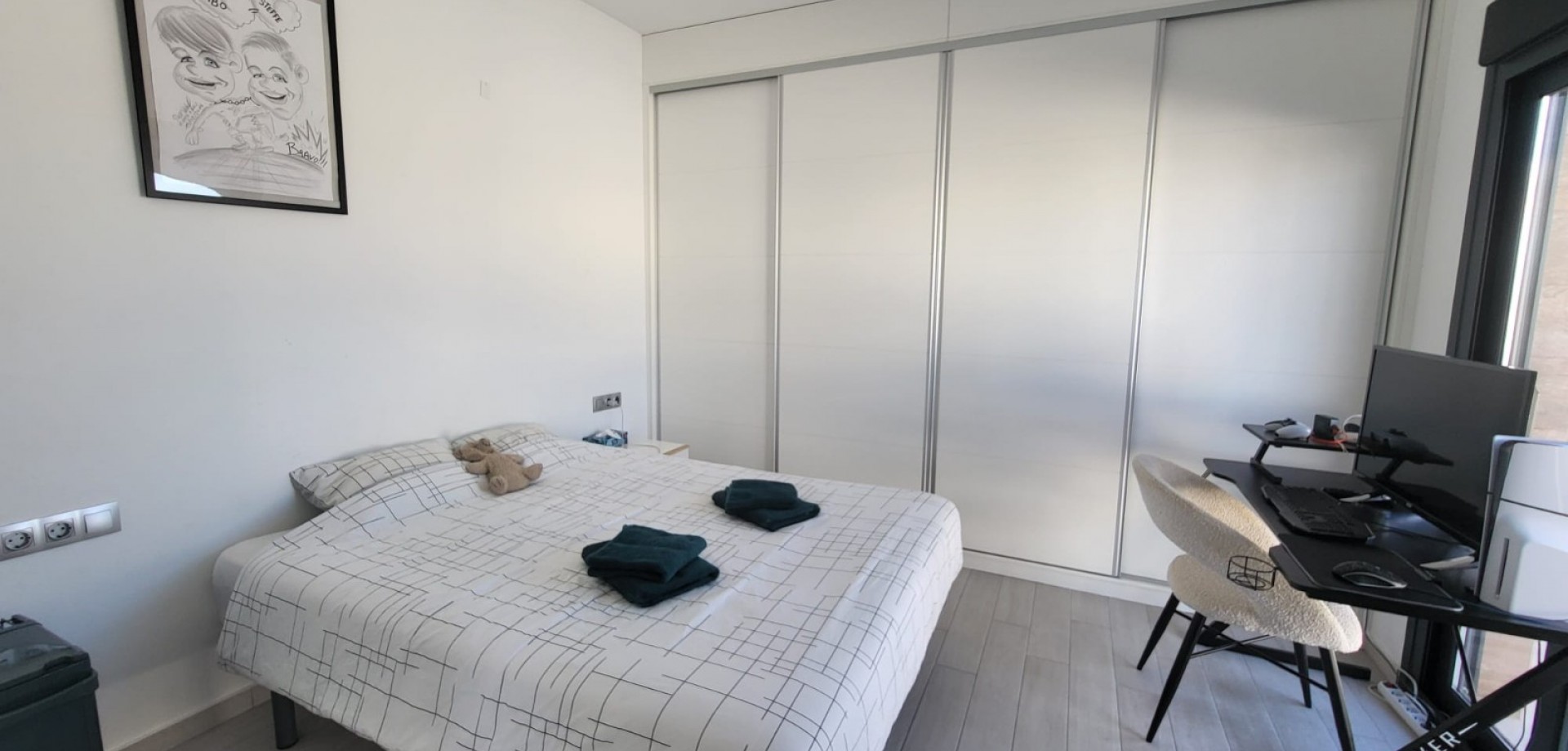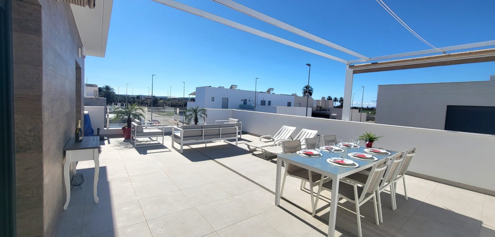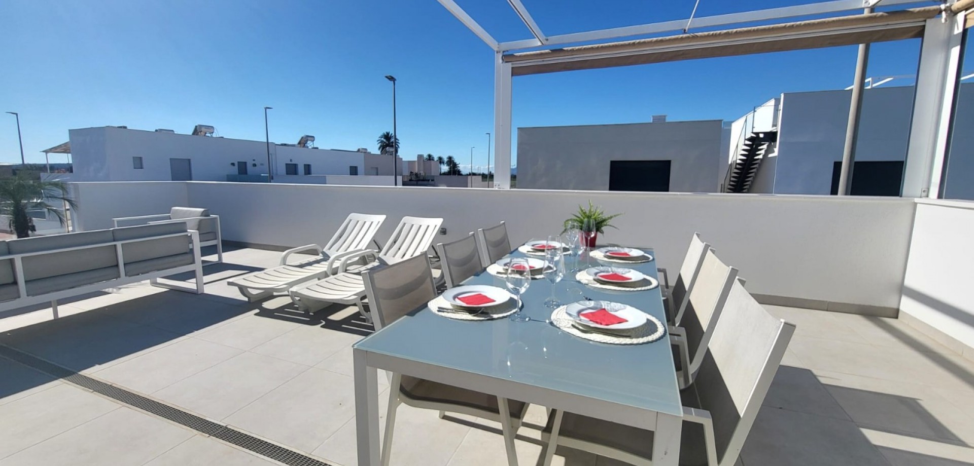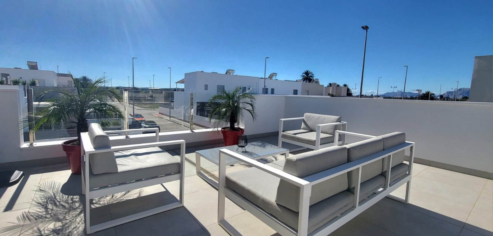 This modern corner townhouse in Daya Vieja, Alicante offers stylish Mediterranean living in a peaceful village setting. Only 5 years old and south facing, the property is filled with natural light and benefits from no community fees. The home features 2 bedrooms and 2 bathrooms, thoughtfully laid out over two floors plus a private solarium. On the ground floor, you’ll find a bright living area, a double bedroom, and a full bathroom, ideal for guests or single-level living. The first floor hosts the second bedroom with its own bathroom, along with access to the stunning private solarium, where you can enjoy open mountain views and sunshine all day long. Outside, the property really shines with a private swimming pool, front terrace, and ample outdoor space for relaxing or entertaining. Additional practical features include a laundry room, storage room, and hot and cold air conditioning throughout for year-round comfort. Perfectly located, the townhouse is within walking distance to village amenities, just 25 minutes from Alicante Airport, and only a short drive to the popular towns of Benijófar and Rojales, offering a wider range of shops, restaurants, and services. A fantastic opportunity for a permanent home, holiday retreat, or low-maintenance investment on the Costa Blanca.