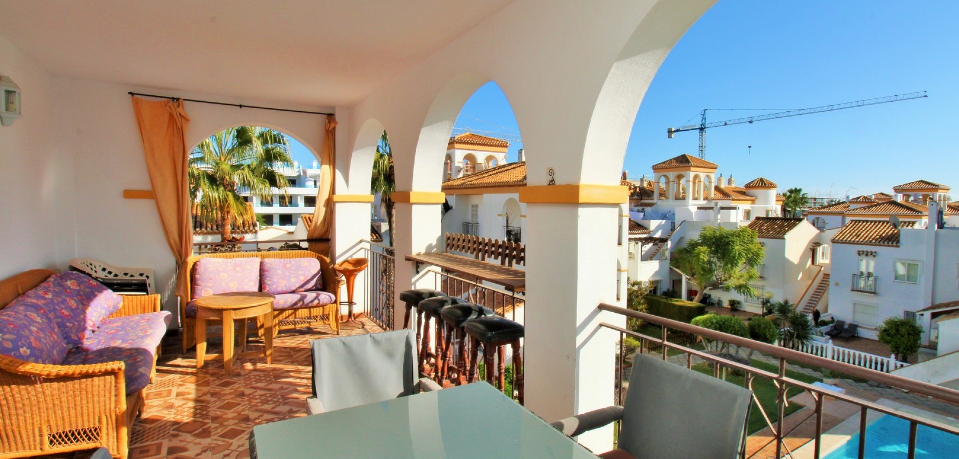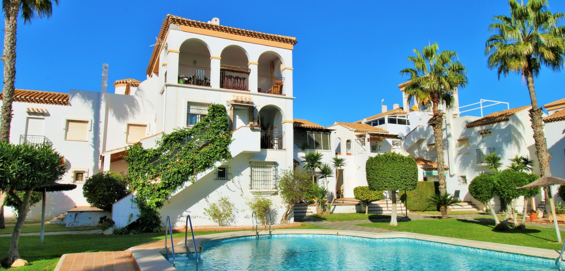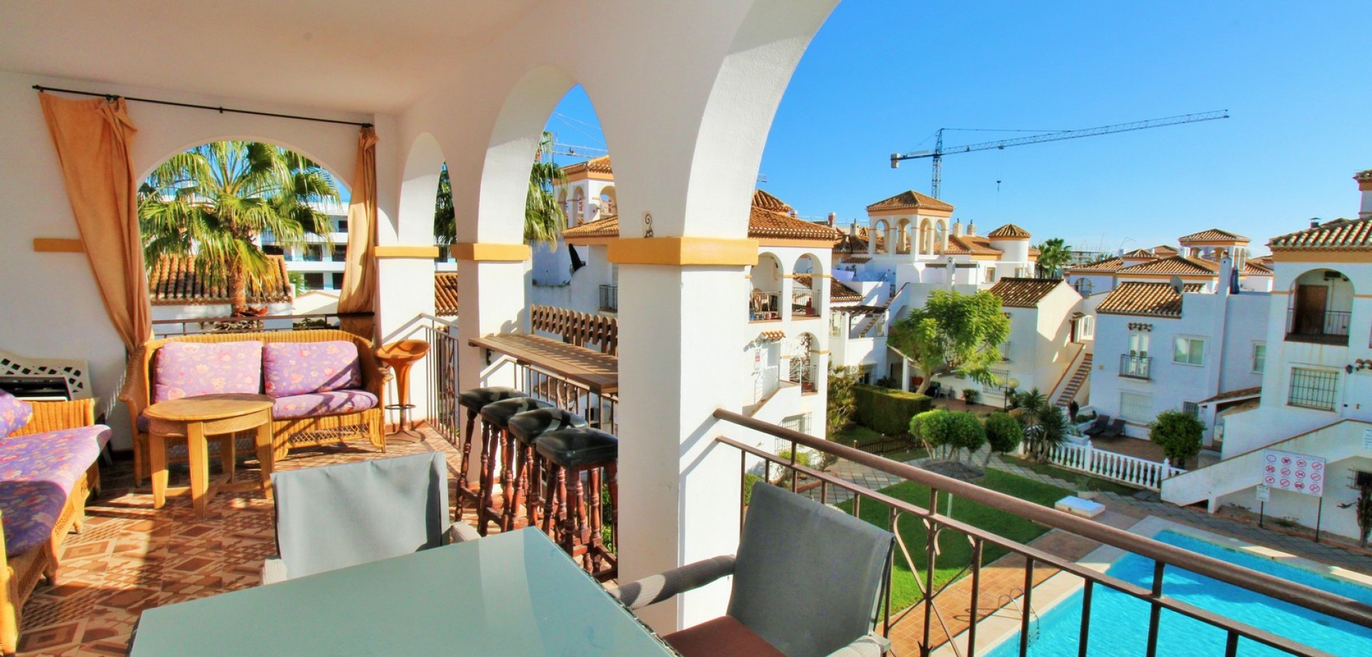 The property itself is designed to make the most of outdoor living, offering multiple private terraces with open views over the pool and gardens — ideal for relaxing, dining, or entertaining in the sunshine.