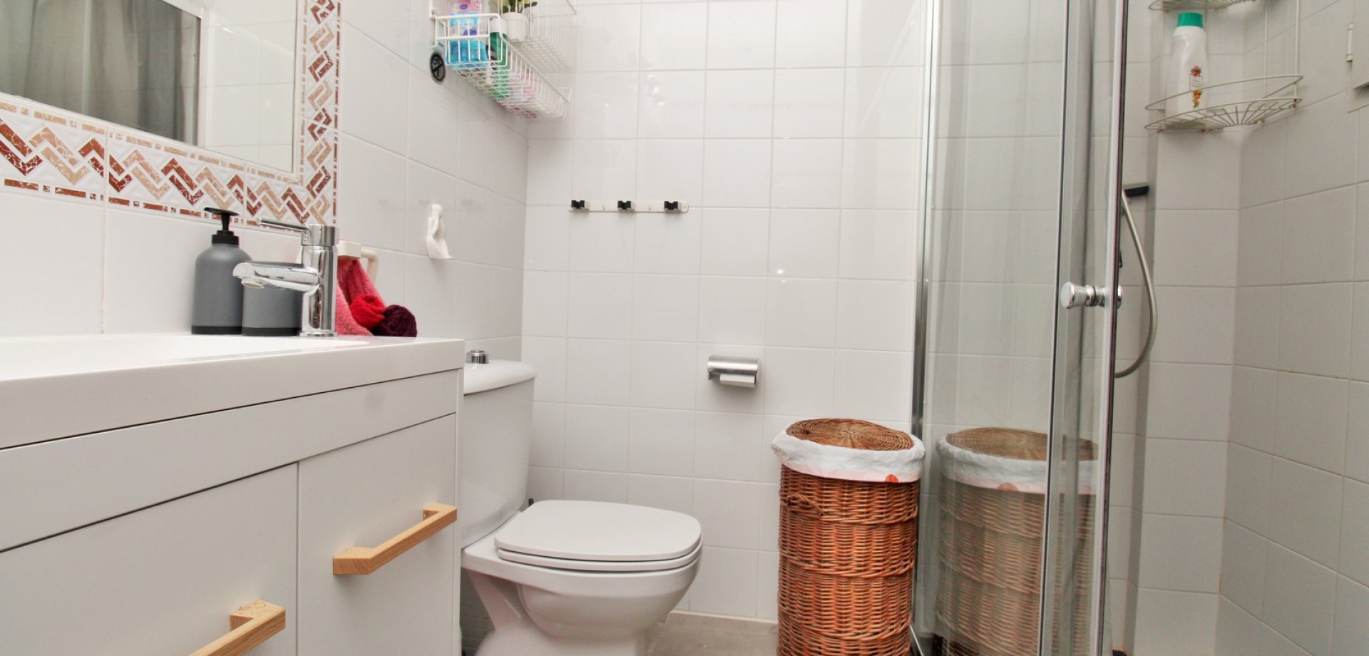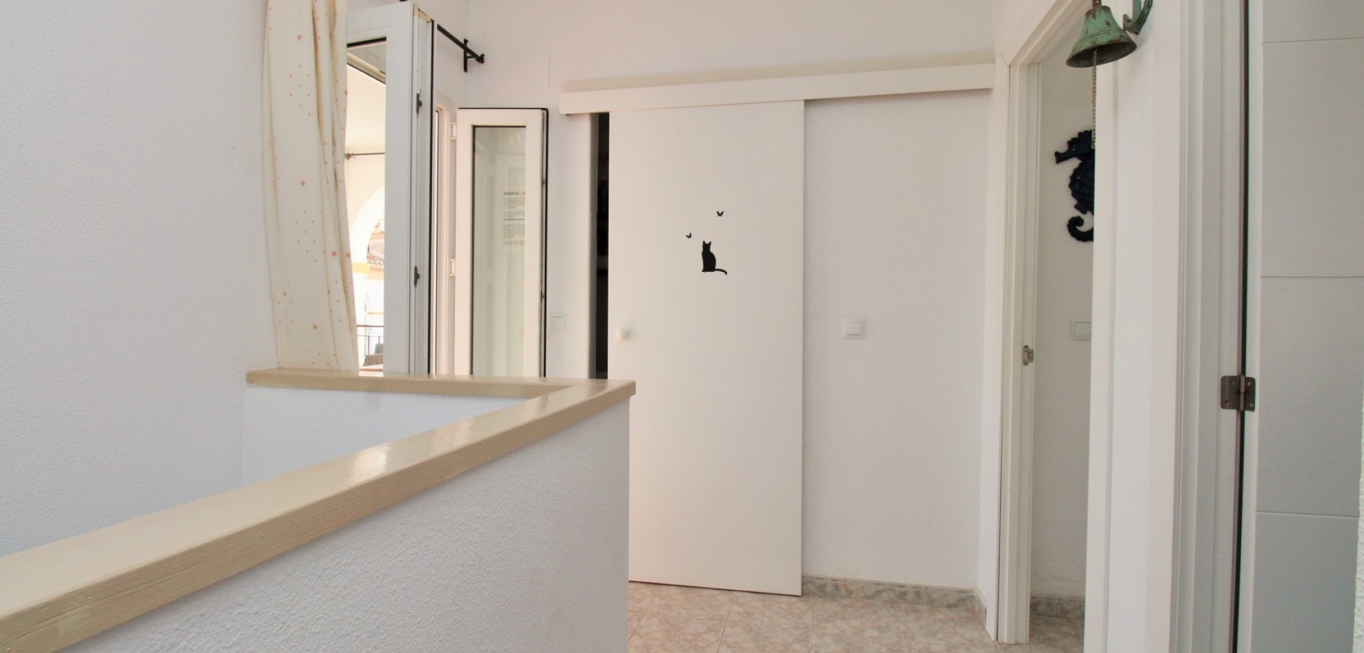 The upper level comprises two further double bedrooms and a second contemporary bathroom, also with a walk-in shower. Completing the home is a private rooftop solarium, complete with a built-in BBQ and beautiful views across the communal areas and the Mediterranean Sea — a perfect spot for evening sunsets or hosting friends.