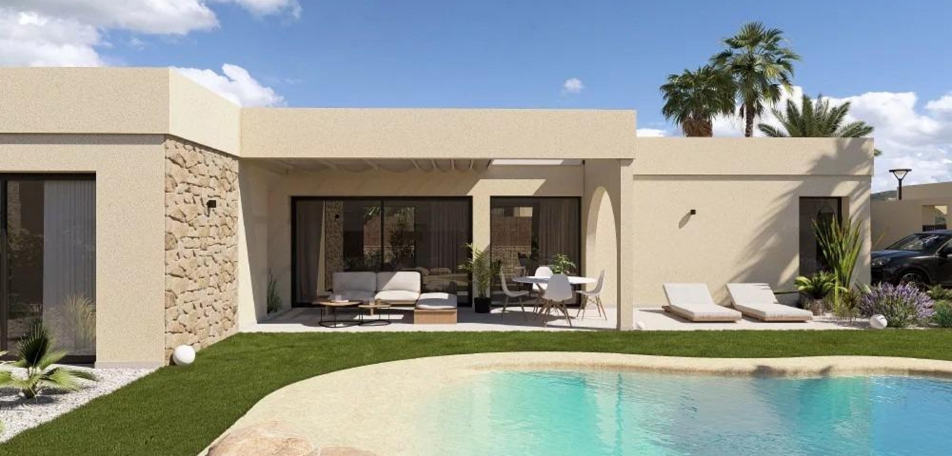 Contemporary One Level Villas in Altaona Golf Resort Murcia Prime Golf Resort Location Near Murcia City Discover this exclusive collection of new build detached villas located in the prestigious Altaona Golf Resort in Murcia. Set within a secure and peaceful environment surrounded by nature and an 18 hole golf course, this residential community offers the perfect balance between tranquility and accessibility. Altaona Golf is just 15 km from Murcia city center, where you will find shopping centers, restaurants, schools and medical services, while the beaches of the Costa Calida are only 20 km away. Murcia Corvera Airport is conveniently located 15 km from the resort, making this an ideal location for both permanent living and holiday homes. Modern Single Level Design with Private Garden and Pool These elegant villas are designed on one level for maximum comfort and functionality. Buyers can choose between 2, 3 or 4 bedrooms and 2 or 3 bathrooms plus a guest toilet. Each home features an open plan kitchen and living area that connects seamlessly to the outdoor terrace and private landscaped garden with swimming pool. A private parking space is included within the plot, ensuring convenience and privacy. Energy Efficient Homes with High Quality Features All villas hold an Energy Certificate Rating A, ensuring excellent energy efficiency and low running costs. The properties include ducted air conditioning with heat pump throughout the house except bathrooms, and electric underfloor heating in the living room and bathrooms with independent thermostats by zone. A mechanical ventilation system renews the air in kitchens, bathrooms, laundry room and guest toilet, improving indoor comfort. The kitchen comes equipped with an extractor hood and electric induction hob. LED lighting is included in the living room, hallway and exterior areas, while the remaining rooms are prepared for the owner to customize lighting. Bedrooms are fitted with USB charging points for added convenience. Smart Home Technology and Secure Community Each villa includes a video intercom system, smart home automation with two intelligent switches, and motorized vehicle access to the gated community. The private garden is delivered landscaped with a drip irrigation system and an inviting private swimming pool, ideal for enjoying the Mediterranean climate all year round. Distances to Key Points of Interest Altaona Golf Course 0.1 km Murcia city center 15 km Beaches of Los Alcazares and Mar Menor 20 km Murcia Corvera Airport 15 km Shopping centers and services 10 km Hacienda Riquelme Golf Resort 12 km Your New Lifestyle in Altaona Golf Awaits Enjoy golf, nature, security and modern comfort in one of the most attractive resorts in the Murcia region. Contact us today to receive more information or to arrange a visit to these beautiful new build villas.