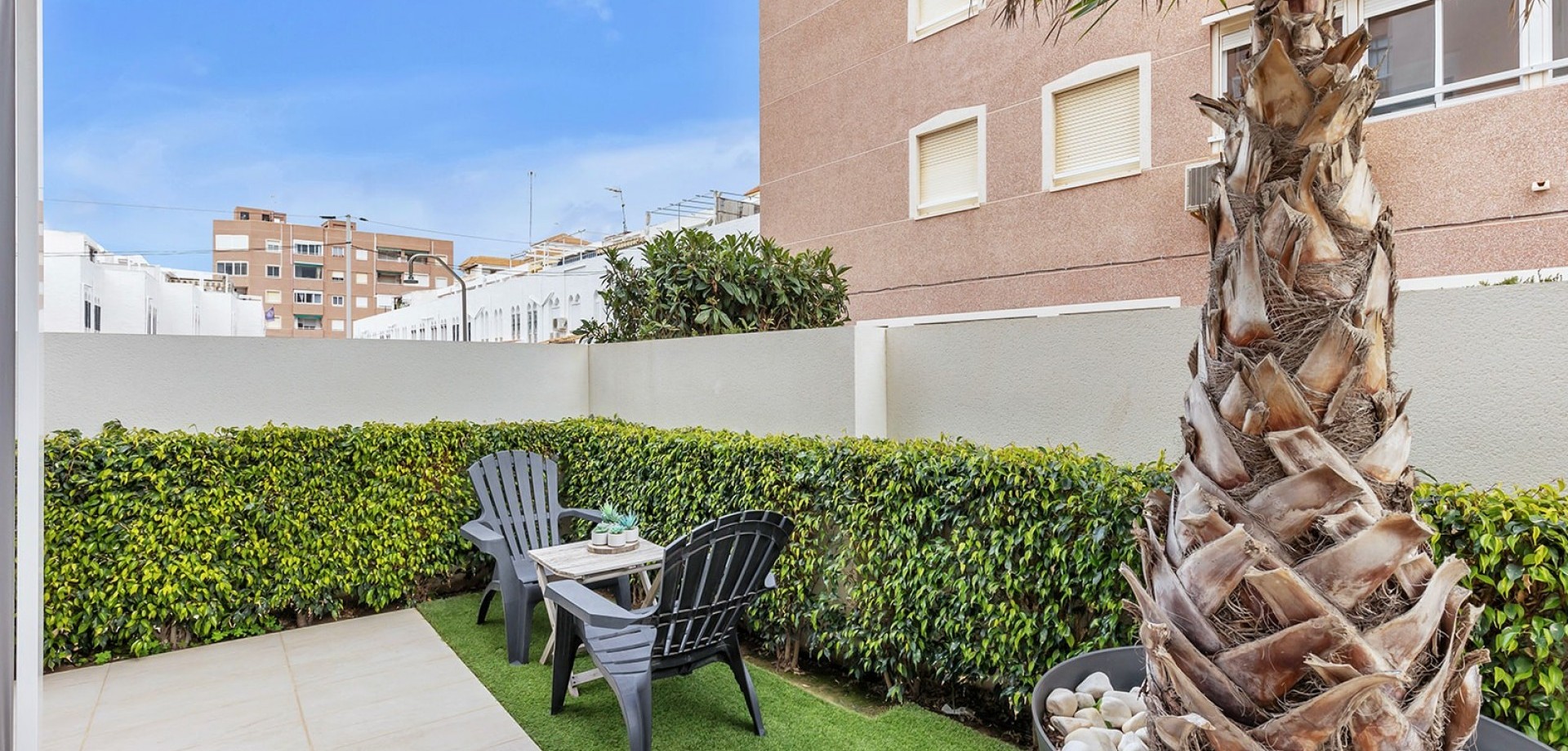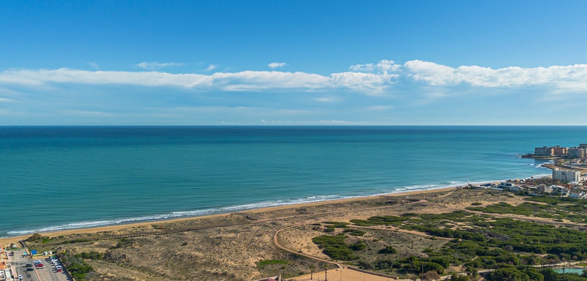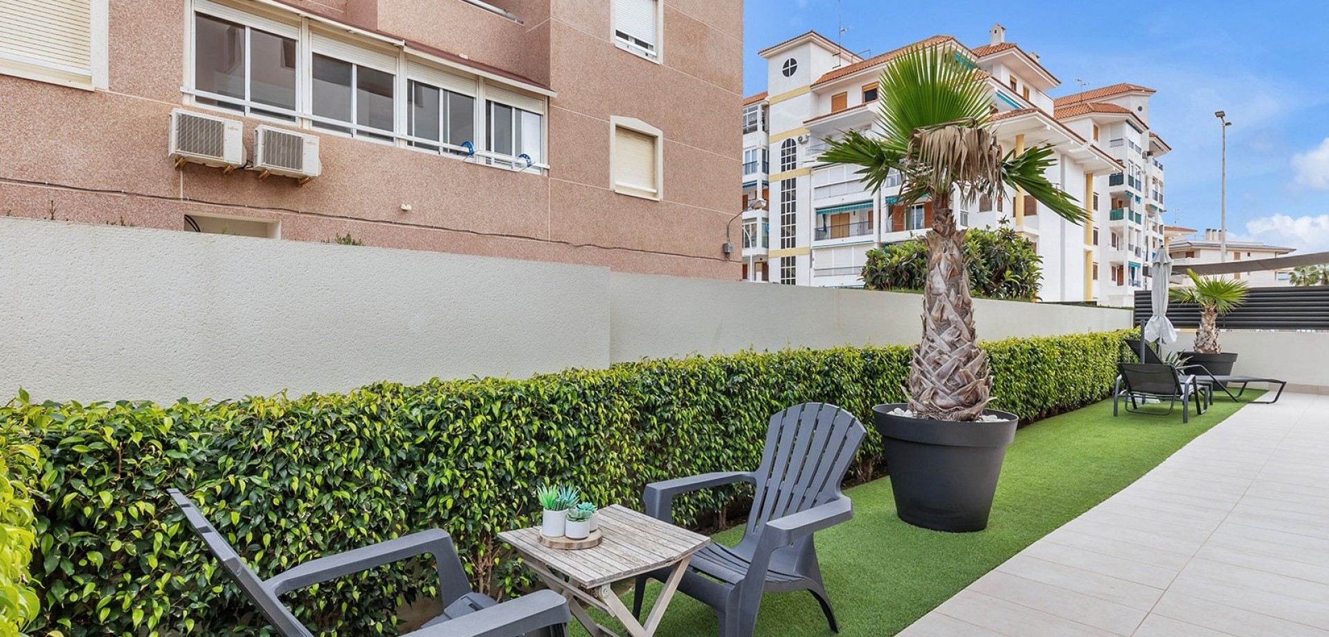 This new build ground floor apartment in La Mata is sold completely ready to move in (key ready) and is located in a small-scale and well-maintained residence within walking distance of the beach. The property combines modern comfort, high-quality finishes and a pleasant Mediterranean lifestyle. The flat has two spacious and bright bedrooms and two modern bathrooms with walk-in showers, ensuring optimal comfort and privacy. The stylish living space with open, fully equipped kitchen connects seamlessly to the outdoor area and creates a spacious and light living experience. The spacious private garden is a natural extension of the living space and offers enough room for a lounge and dining area, ideal for enjoying the outdoor life on the Costa Blanca all year round. The property is sold fully ready to move into, including furniture and fittings. In addition, the flat has a private parking space in front of the building and a private storage room in the basement, both included in the price. Residents can also use the communal swimming pool within the residence. Thanks to its excellent location in La Mata, close to the beach and all amenities, this flat is ideal as a second home, investment or permanent residence on the Costa Blanca.