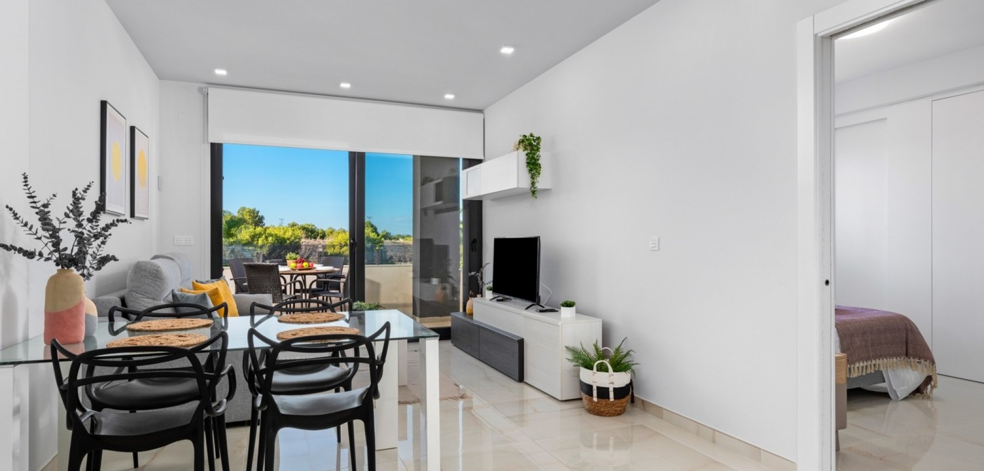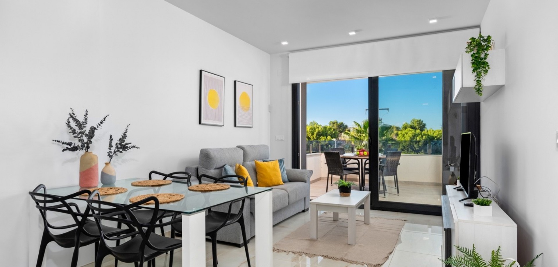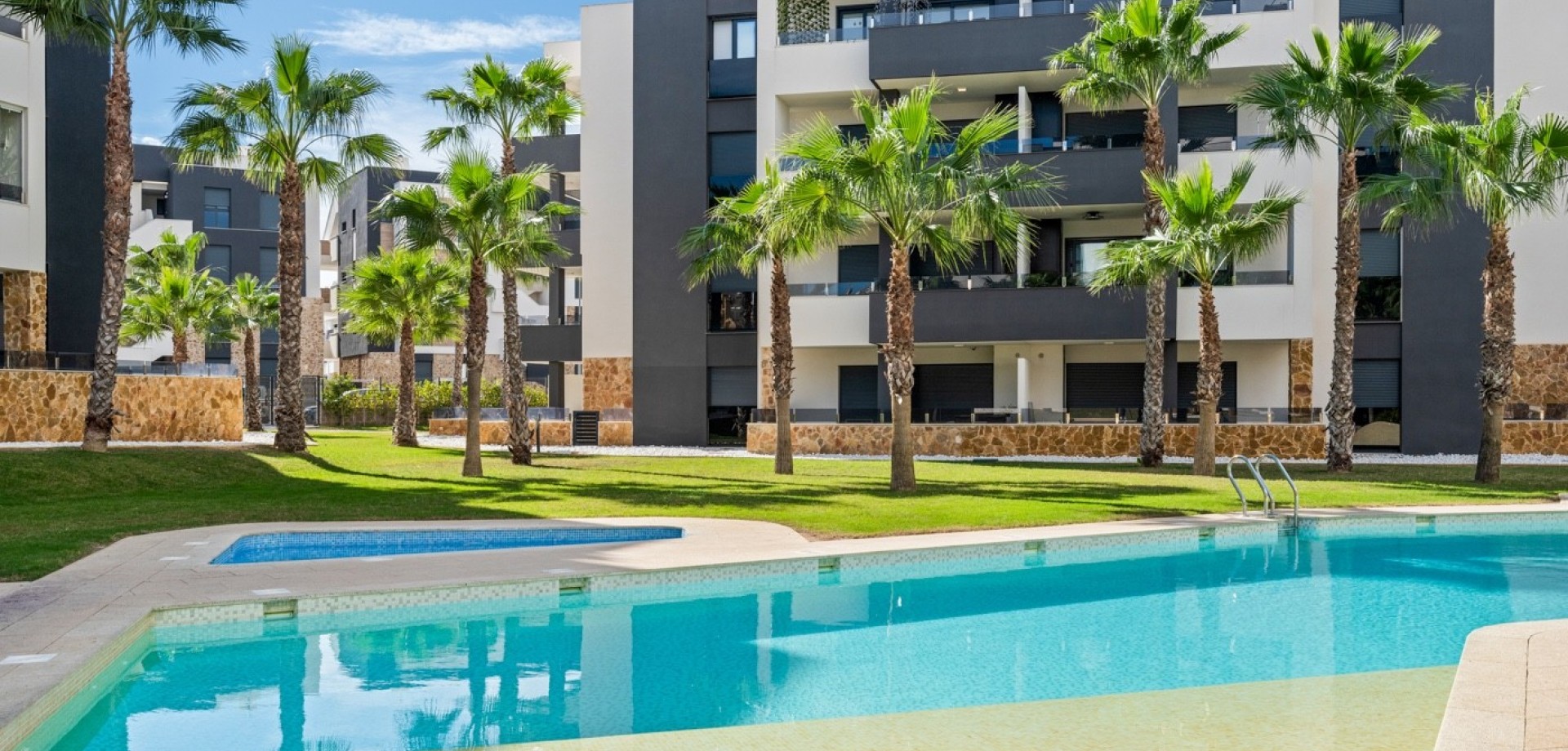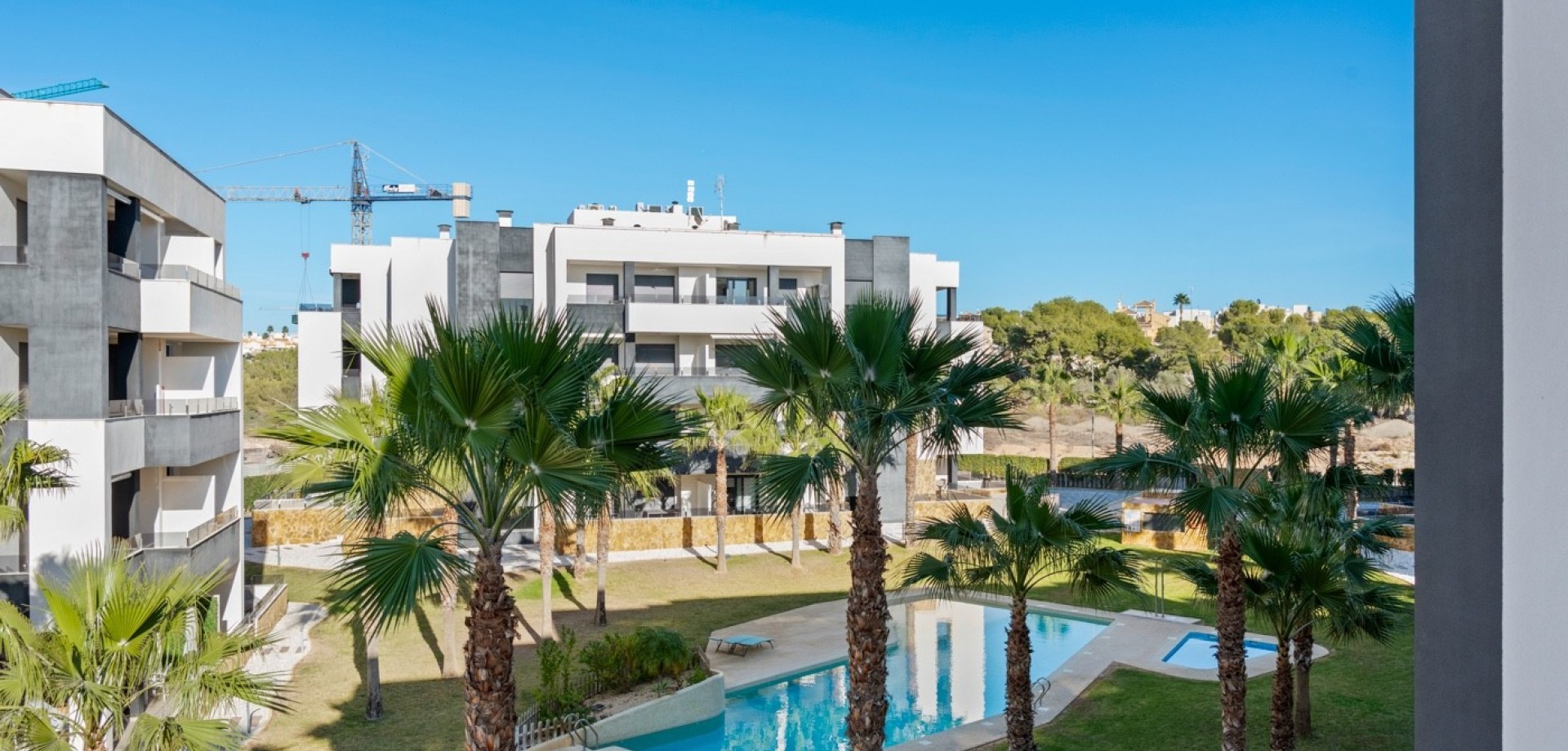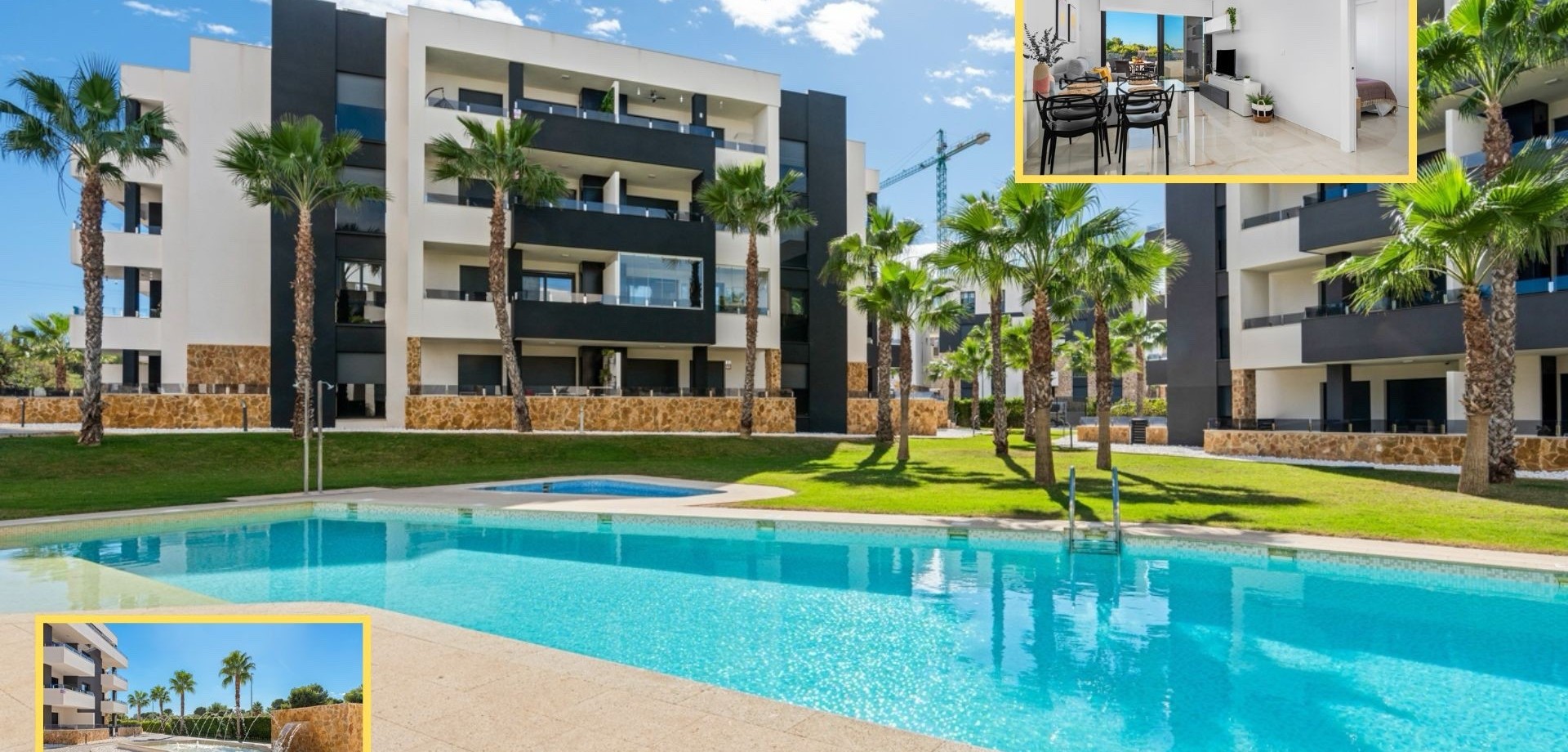 We present to you a beautiful and new 2 bedroom apartment in the popular Amanecer VI gated complex in Los Altos. The property with southwest exposure, located on the second floor with elevator, equipped with high quality furniture, modern household appliances, air conditioning and underground parking with storage room.The apartment consists of a bright living room with dining area, open kitchen and two double bedrooms with built-in wardrobes. The master bedroom has an en suite bathroom and both bathrooms have underfloor heating. The balcony overlooking the communal pool and garden invites you to relax outdoors.Residencial Amanecer VI offers a safe and quiet environment with large green areas, boules courts and water attractions. Ideally located 750 m from a supermarket and a few minutes walk from the restaurants and bars of Via Park III, just a 10 minute drive from the beaches, Zenia Boulevard and world class golf courses such as Villamartin and Las Ramblas.Ready to move in!