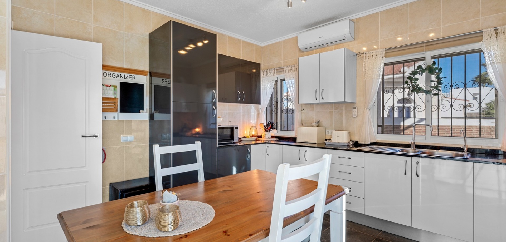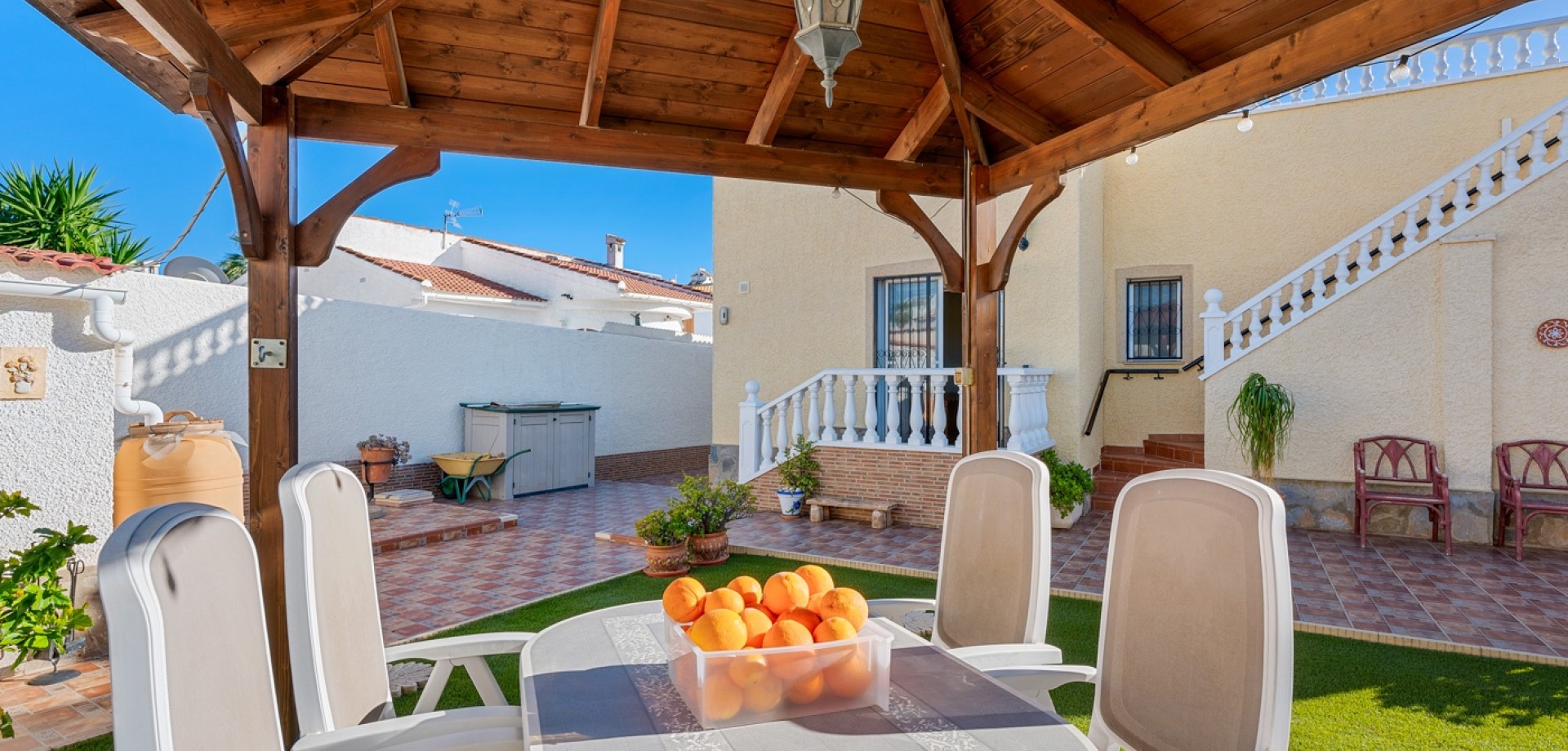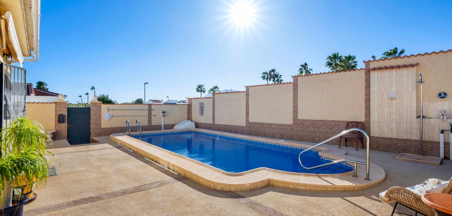 Set in one of the most prestigious areas of Ciudad Quesada, this beautifully reformed villa offers the perfect blend of modern comfort, privacy and Mediterranean outdoor living. Standing on a generous 587 m² fully tiled plot with fantastic views, the property is presented in excellent condition and ready to move into. The villa provides approx. 150 m² of bright living space distributed over two levels. Inside you will find four spacious bedrooms with built-in wardrobes and three stylish bathrooms, ideal for family living or hosting guests. The property features a luxury fully fitted kitchen as well as a second summer kitchen — perfect for entertaining — and a comfortable living area with fireplace and air conditioning throughout. Outside, the home truly shines. Enjoy the private swimming pool, outdoor shower, barbecue area and multiple terraces designed for year-round enjoyment. A large solarium offers sun all day, while awnings provide welcome shade during warmer months. The landscaped private garden and off-street parking area add both convenience and privacy. Located within walking distance to amenities, restaurants and services, this villa combines tranquility with accessibility — ideal as a permanent residence, holiday home or investment property. * 4 bedrooms | 3 bathrooms * Plot 587 m² | Built 150 m² * Private pool & outdoor shower * Solarium & fantastic views * Barbecue & summer kitchen * Fireplace & air conditioning * Fully furnished & luxury kitchen * Private parking & storage room * Prestigious location close to amenities * Move-in ready * Underfloor heating in the living room A stylish Mediterranean home where comfort meets lifestyle — viewing highly recommended.