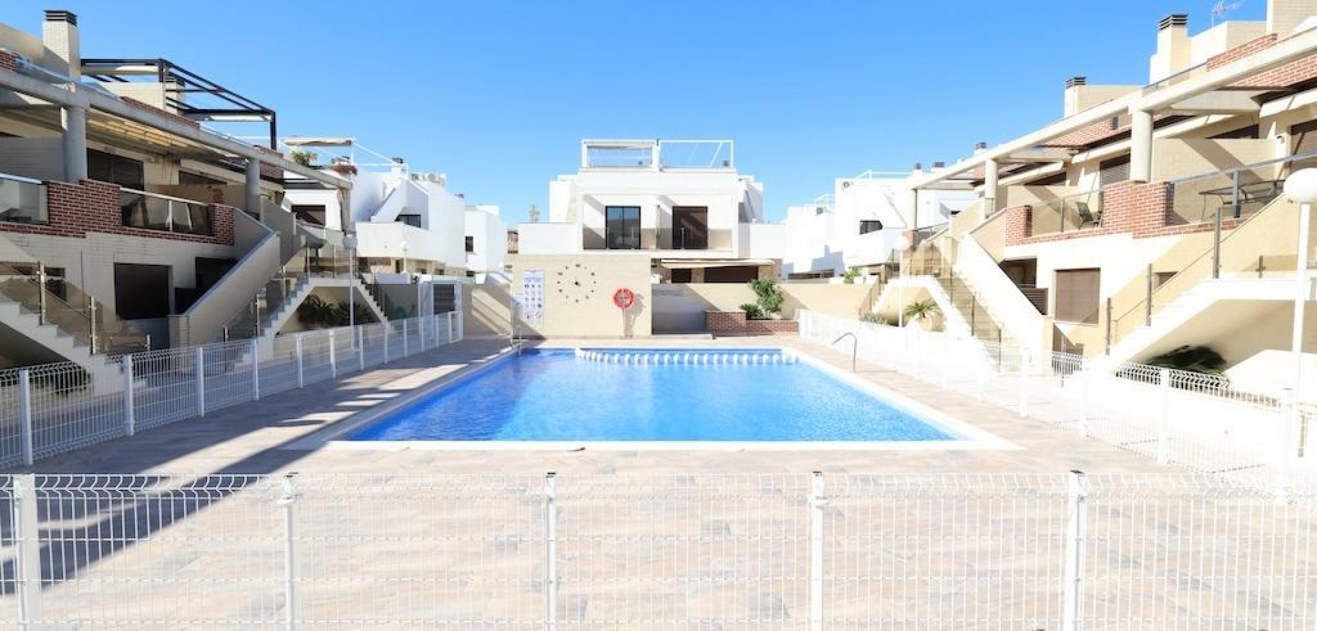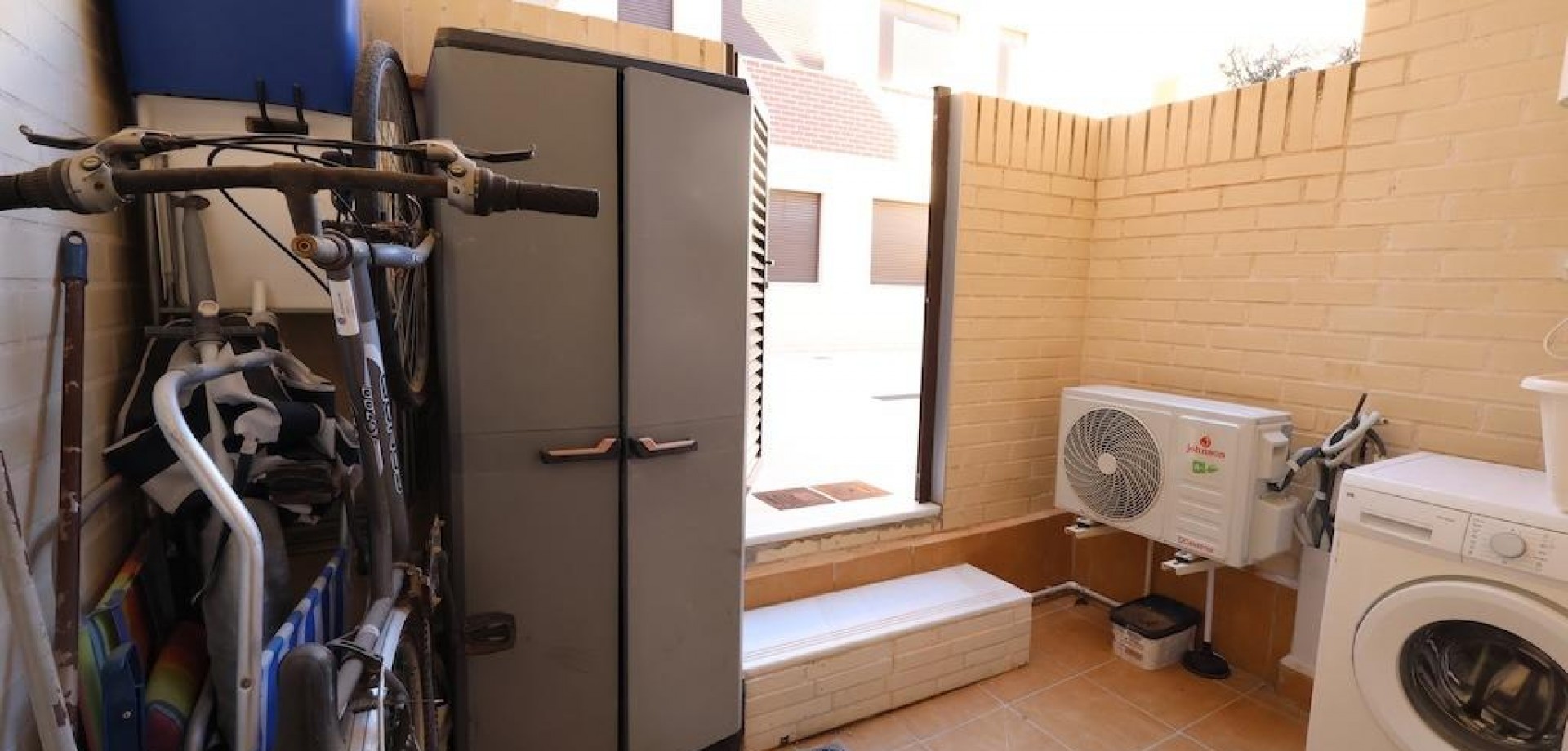 Lomas de Cabo Roig, Ground floor bungalow with a large tiled garden of about 30 m2, 64 m2 house with 2 bedrooms, 2 bathrooms, open kitchen to living room, back patio from which you can access the communal pool, the house is sold furnished and with air conditioning.