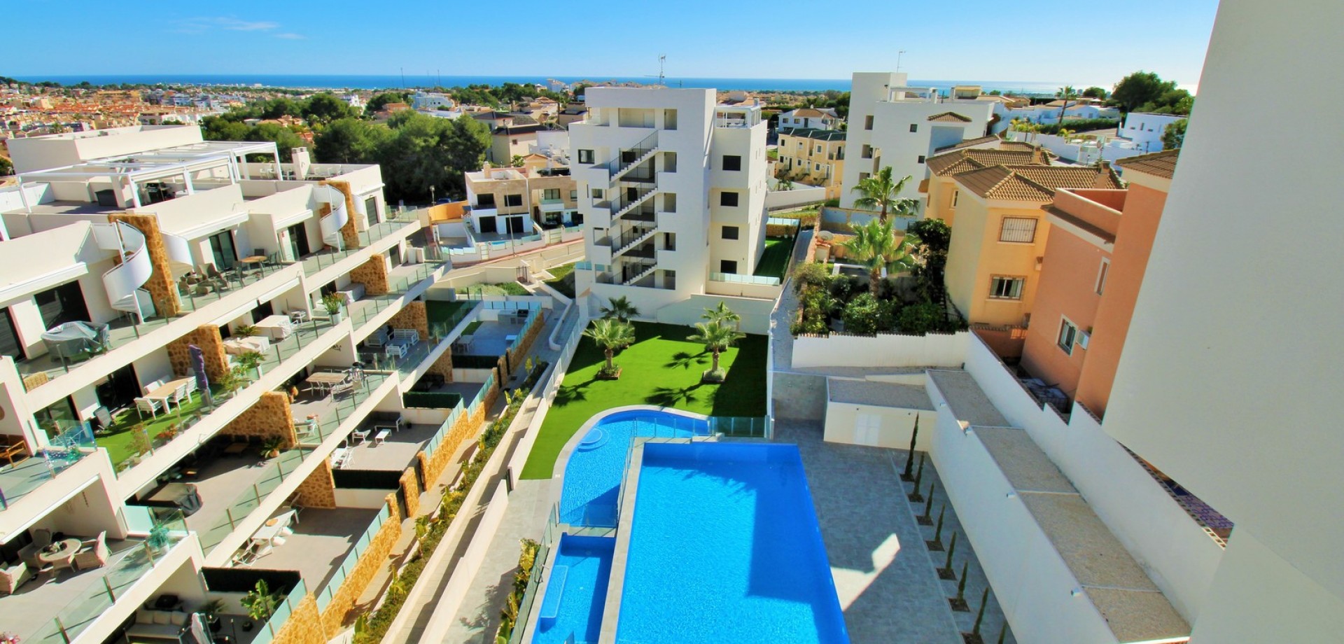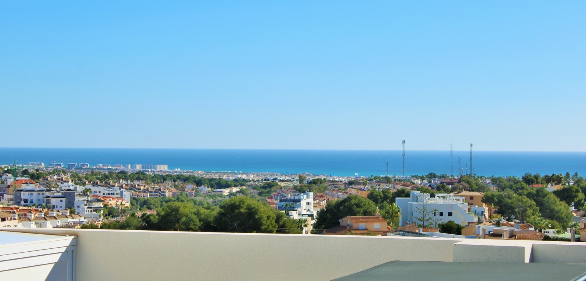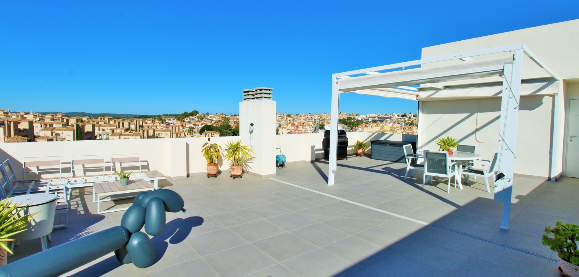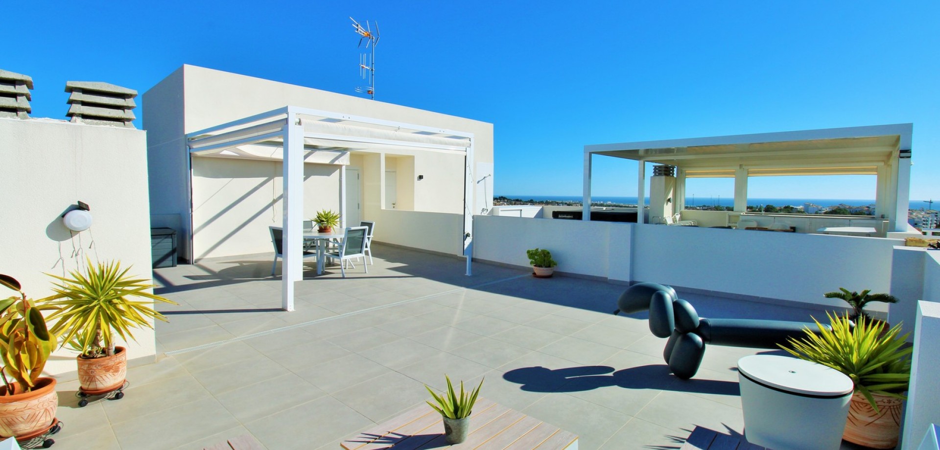 A stunning South-facing penthouse apartment located in the newly constructed Villacosta Club 3 in Villamartin, positioned in arguably the best block and elevated location within the entire development, offering breathtaking panoramic views across the area and towards the sea. This exceptional property features a bright and modern lounge-dining area with open-plan kitchen, designed for comfortable contemporary living. There are 2 double bedrooms with fitted wardrobes, including a master bedroom with en-suite bathroom, along with a stylish family bathroom, both benefiting from underfloor heating for year-round comfort. From the living area and kitchen, you access a generous South-facing front balcony fitted with an electric awning, ideal for outdoor dining and relaxing in the sun. One of the standout features of this penthouse is the incredible 78m² private roof solarium, accessible either directly from the terrace or via lift access through a private entrance door. From here, you can enjoy spectacular open views and beautiful sea vistas — a rare feature in the Villamartin area. The property is sold partially furnished and includes air-conditioning and white goods, making it ready to enjoy immediately. Included in the price is an underground parking space and a large private storage room, adding valuable practicality. Set within a secure gated community, residents benefit from a beautifully maintained communal pool and jacuzzi area. The location is ideal, within a short walk to local bars, restaurants, and shops, while the beaches of Orihuela Costa, several championship golf courses, and Zenia Boulevard shopping centre are just a short drive away. Situated at one of the highest points in Villamartin, this penthouse truly offers views and lifestyle that must be experienced in person — a rare opportunity to own a standout property in a highly sought-after modern development.