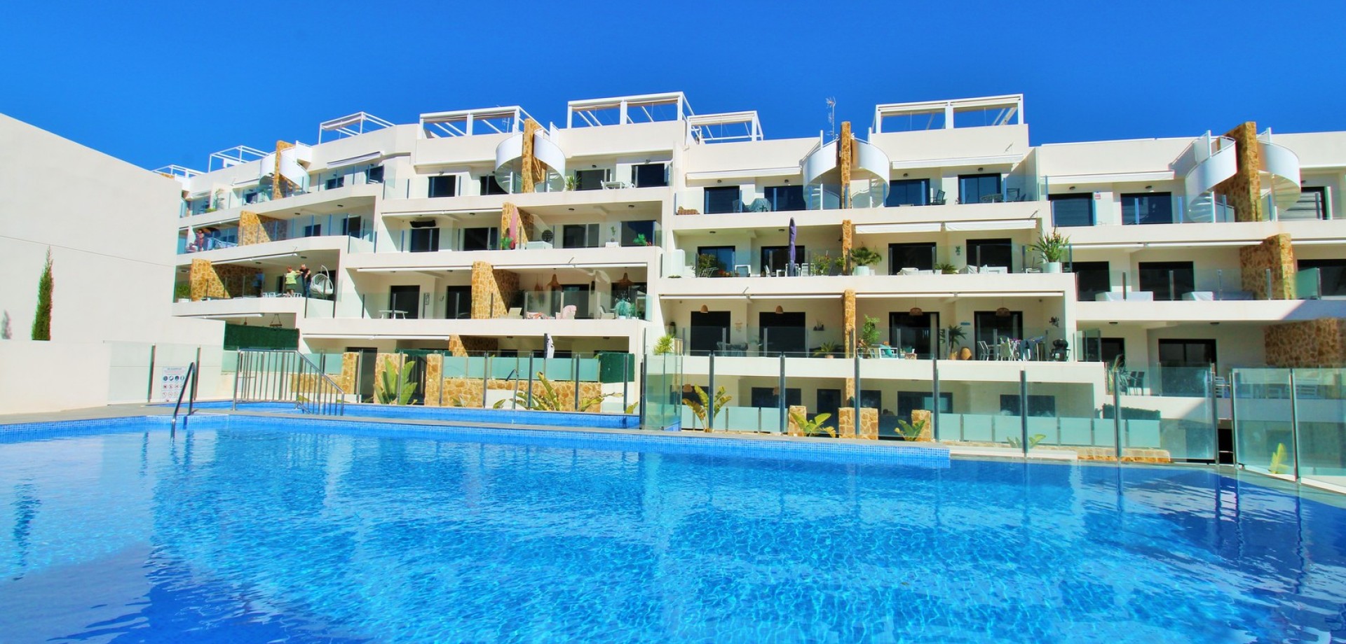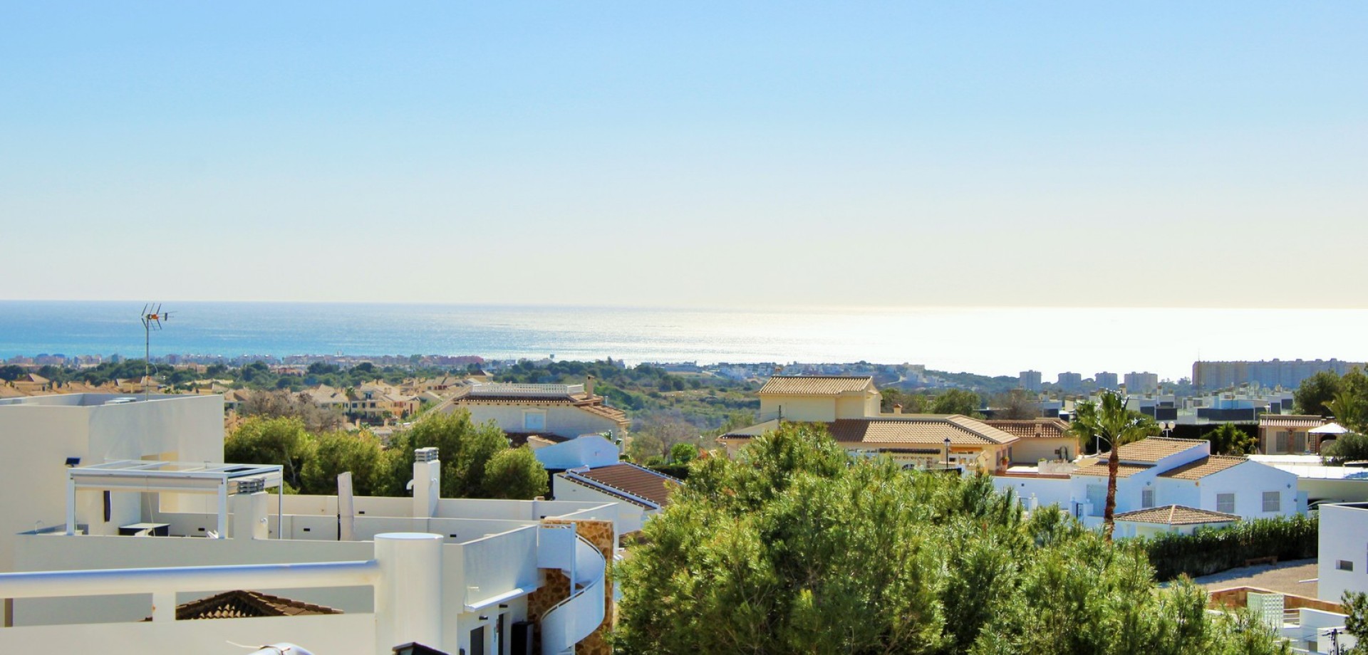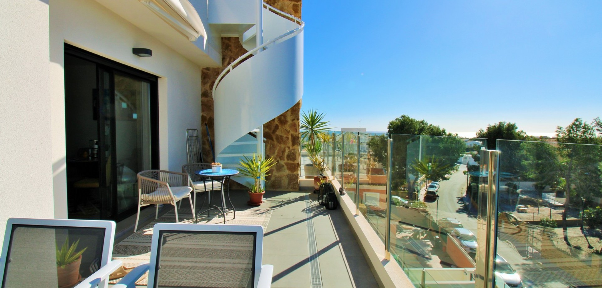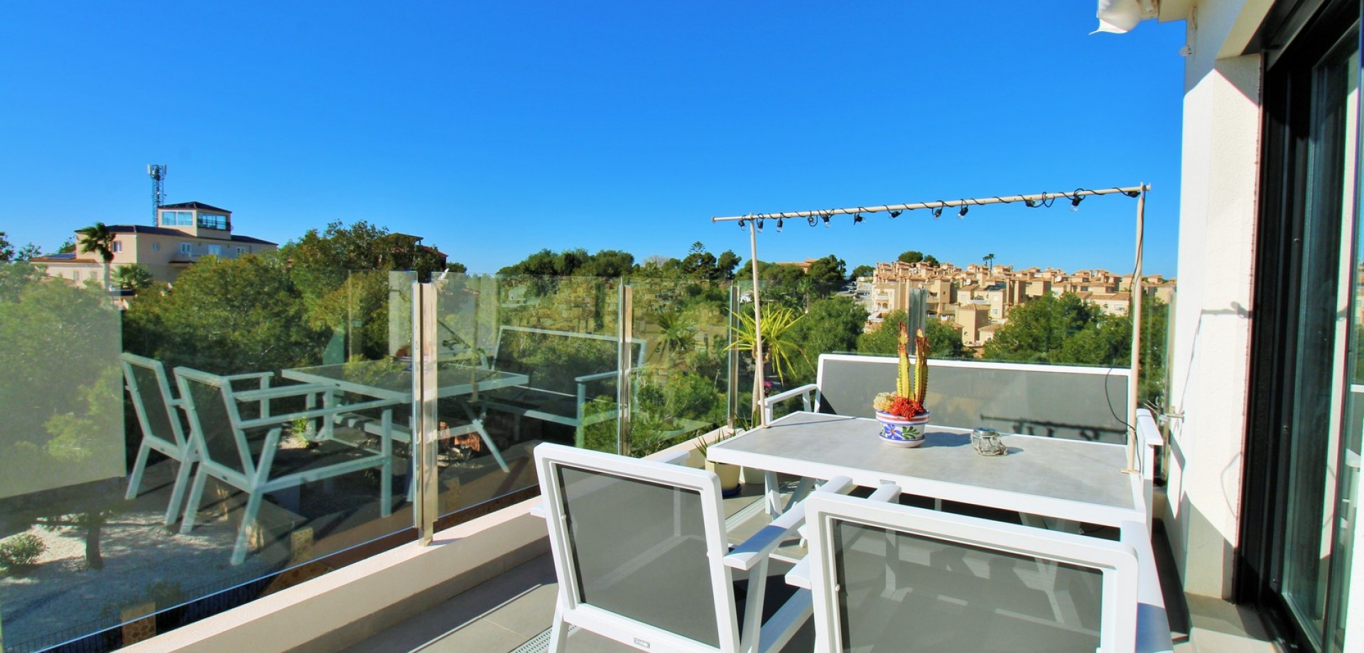 A stunning South-facing penthouse apartment located in the newly constructed Villacosta Club 3 in Villamartin, positioned in arguably the best block and elevated location within the entire development, offering breathtaking panoramic views across the area and towards the sea. This exceptional property features a bright and modern lounge-dining area with open-plan kitchen, designed for comfortable contemporary living. There are 2 double bedrooms with fitted wardrobes, including a master bedroom with en-suite bathroom, along with a stylish family bathroom, both benefiting from underfloor heating for year-round comfort. From the living area and kitchen, you access a generous South-facing front balcony fitted with an electric awning, ideal for outdoor dining and relaxing in the sun. One of the standout features of this penthouse is the incredible 78m² private roof solarium, accessible either directly from the terrace or via lift access through a private entrance door. From here, you can enjoy spectacular open views and beautiful sea vistas — a rare feature in the Villamartin area. The property is sold partially furnished and includes air-conditioning and white goods, making it ready to enjoy immediately. Included in the price is an underground parking space and a large private storage room, adding valuable practicality. Set within a secure gated community, residents benefit from a beautifully maintained communal pool and jacuzzi area. The location is ideal, within a short walk to local bars, restaurants, and shops, while the beaches of Orihuela Costa, several championship golf courses, and Zenia Boulevard shopping centre are just a short drive away. Situated at one of the highest points in Villamartin, this penthouse truly offers views and lifestyle that must be experienced in person — a rare opportunity to own a standout property in a highly sought-after modern development.