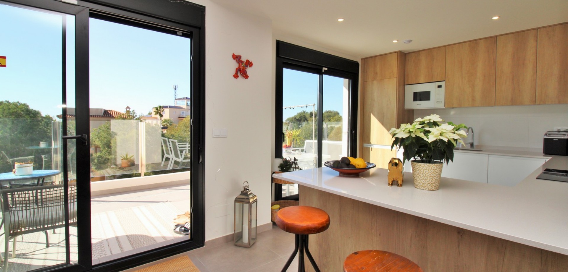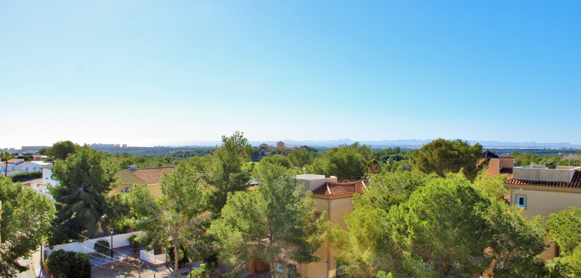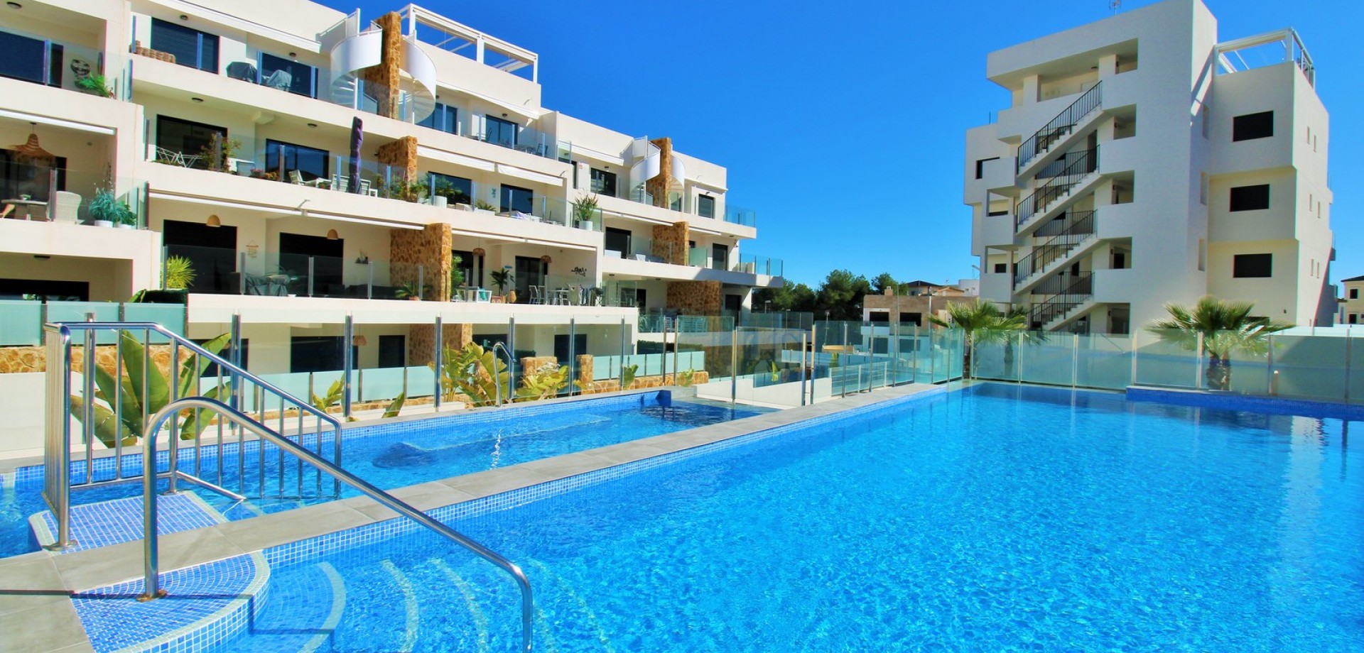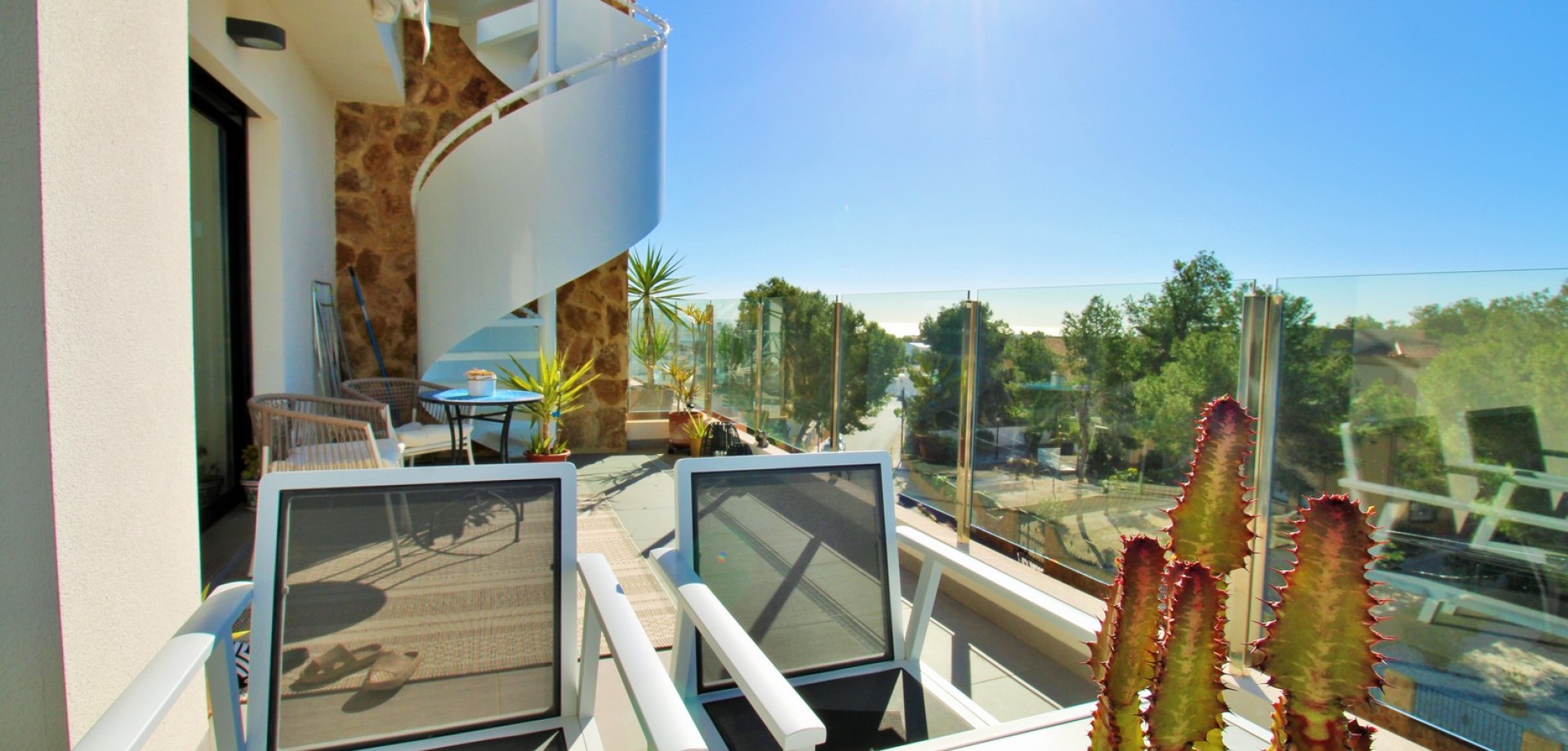 A stunning South-facing penthouse apartment located in the newly constructed Villacosta Club 3 in Villamartin, positioned in arguably the best block and elevated location within the entire development, offering breathtaking panoramic views across the area and towards the sea. This exceptional property features a bright and modern lounge-dining area with open-plan kitchen, designed for comfortable contemporary living. There are 2 double bedrooms with fitted wardrobes, including a master bedroom with en-suite bathroom, along with a stylish family bathroom, both benefiting from underfloor heating for year-round comfort. From the living area and kitchen, you access a generous South-facing front balcony fitted with an electric awning, ideal for outdoor dining and relaxing in the sun. One of the standout features of this penthouse is the incredible 78m² private roof solarium, accessible either directly from the terrace or via lift access through a private entrance door. From here, you can enjoy spectacular open views and beautiful sea vistas — a rare feature in the Villamartin area. The property is sold partially furnished and includes air-conditioning and white goods, making it ready to enjoy immediately. Included in the price is an underground parking space and a large private storage room, adding valuable practicality. Set within a secure gated community, residents benefit from a beautifully maintained communal pool and jacuzzi area. The location is ideal, within a short walk to local bars, restaurants, and shops, while the beaches of Orihuela Costa, several championship golf courses, and Zenia Boulevard shopping centre are just a short drive away. Situated at one of the highest points in Villamartin, this penthouse truly offers views and lifestyle that must be experienced in person — a rare opportunity to own a standout property in a highly sought-after modern development.