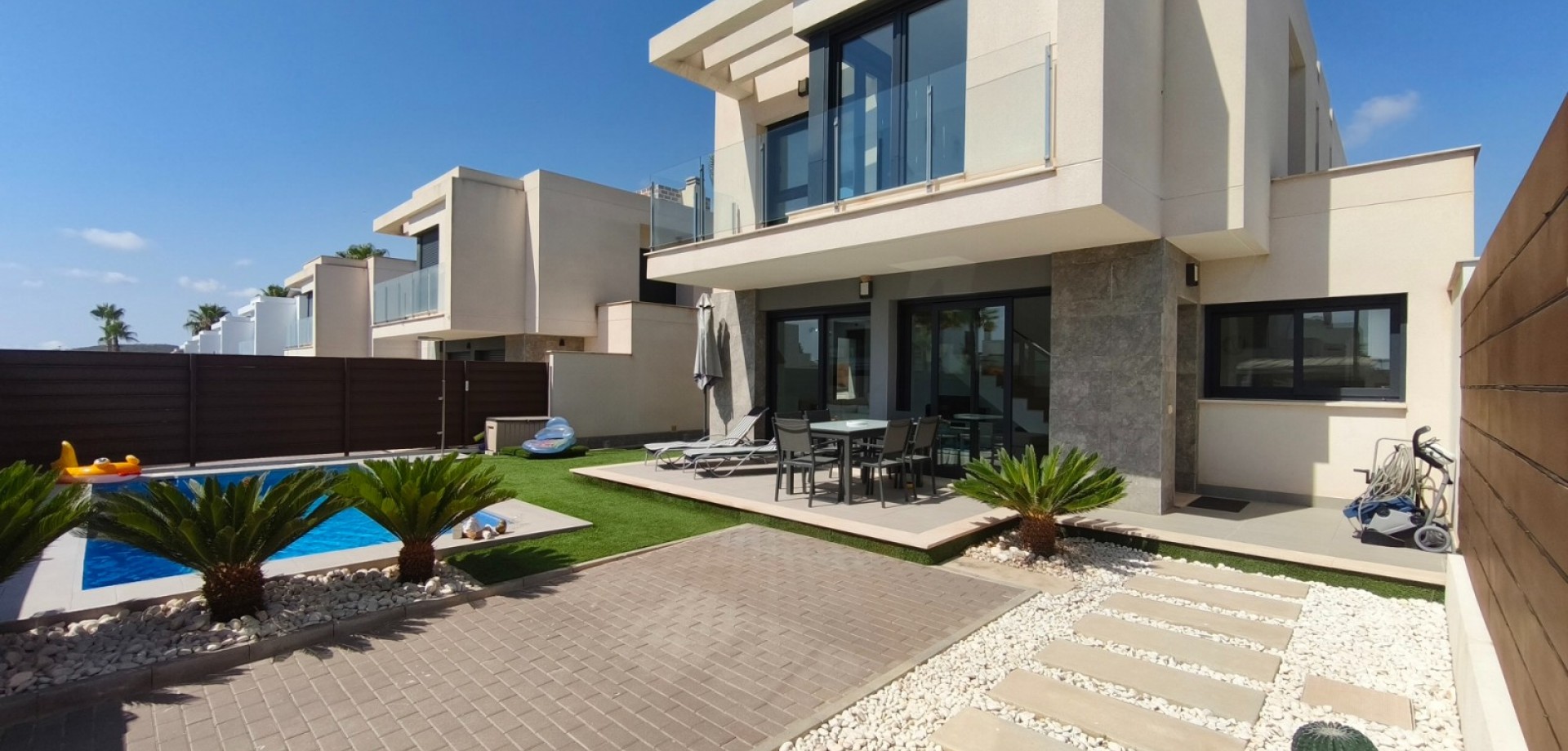 Discover this fantastic modern townhouse, a home designed for those seeking comfort, elegance, and a superior quality of life on the Costa Blanca . With 3 bedrooms and 2 bathrooms , this property stands out for its impressive mezzanine level , which floods the open-plan living room with natural light, creating a spacious, sophisticated, and inviting atmosphere. The modern and functional open-plan kitchen makes every meal a pleasure, while the ground-floor bedroom offers ideal accessibility for seniors or those with reduced mobility . Set on its private 217 m² plot, the villa boasts a 3 x 6 m swimming pool and a southeast-facing terrace , perfect for enjoying spectacular sunrises . The location is unbeatable: close to supermarkets, bars, and restaurants; just 1.5 km from the prestigious Vistabella golf course ; and very near tennis and paddle tennis courts, mountain biking trails, and scenic walking paths. Furthermore, it is strategically located 35 minutes from Alicante Airport , 20 minutes from the beaches of Orihuela Costa , and 15 minutes from the La Zenia Boulevard shopping center, making it the perfect balance of tranquility, comfort, and Mediterranean lifestyle . A unique opportunity in an international community, ideal for families and lovers of sports, gastronomy, and wellness. Climate: The climate on the Costa Blanca, often considered the best in Europe, fosters a very sociable and healthy lifestyle, characterized by its open-air atmosphere, comprehensive sports and leisure facilities, and exciting, cosmopolitan tourist towns that stand out for their top-tier services, some of them exclusive and considered truly luxurious. All of these cater to a discerning clientele seeking quality and personalized service. The Costa Blanca boasts over 300 days of sunshine a year. A paradise with excellent connections to all of Europe. Alicante-Elche Airport offers modern facilities and easy, convenient access from anywhere in the province. Around: The Costa Blanca continues to attract people from all over Europe, and other parts of the world, because it offers a unique quality of life in a beautiful setting on the shores of the Mediterranean Sea, surrounded by mountains and lush vegetation. In addition to the golf courses and marinas that you can enjoy all along the coast, the area also offers the opportunity to ski in the nearby Sierra Nevada, Javalambre, or Valdelinares, paradises for winter sports enthusiasts with stunning natural landscapes. The Costa Blanca offers a uniquely rich lifestyle, where the best beaches and coves in the Mediterranean combine with an interior full of mountains and villages that hold culture and historical monuments unlike any other in the world. We have a gift for you: At our real estate agency, we'll help you transform your new property into your dream home by offering a free technical visit from our design department. Our team will advise you on potential improvements and decorating options for your property. Completely free! IMPORTANT!! Remember that our services NEVER increase the final price of the property for our clients. Our experience in the sector will make us your ally, a trusted advisor who will help you choose your dream home in the best area, inform you about the market price of the properties you are interested in, the quality of materials used, and provide all the essential and objective information to ensure your experience is completely satisfactory. Our agency belongs to a group of established companies, all specializing in the home sector: architecture, interior design, furniture, real estate sales and purchase advice, etc. These resources allow us to offer unique and exclusive services to our clients. Modern and attuned to new technologies and market opportunities , we are also pioneers in offering the possibility of conducting secure and transparent real estate transactions using cryptocurrencies .