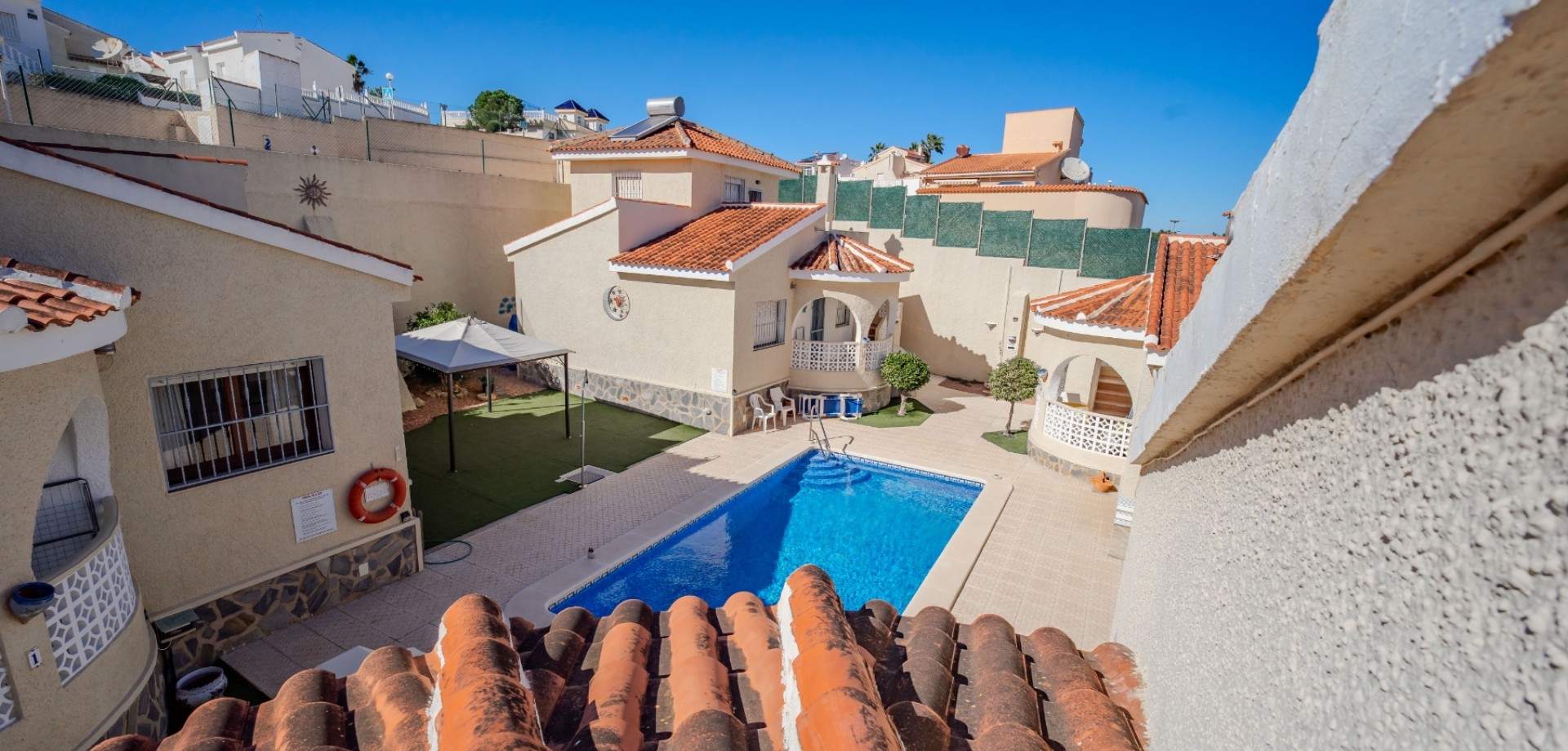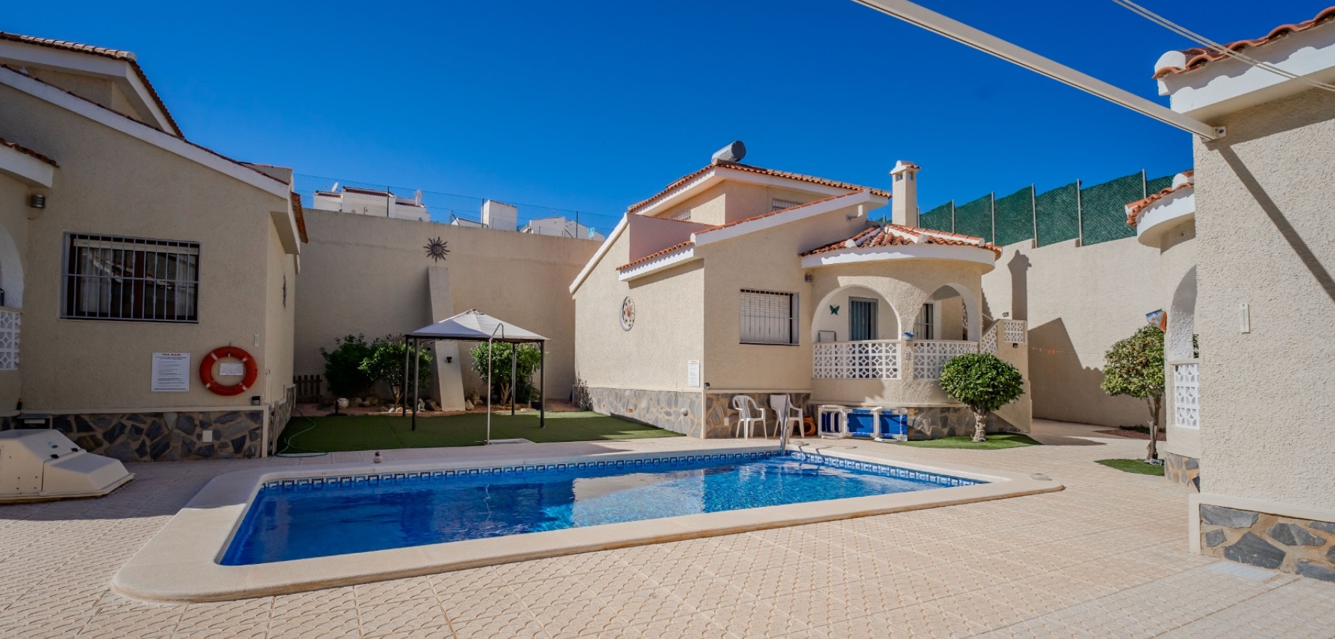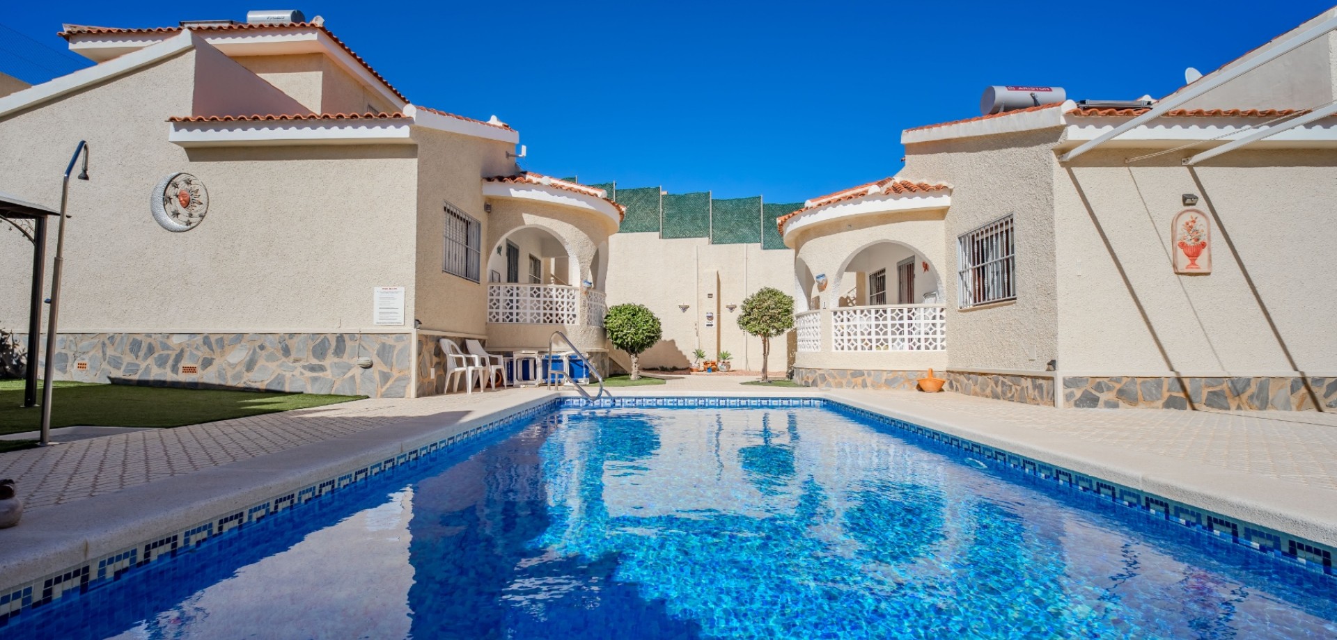 An exceptional opportunity to acquire a private complex of four detached villas set on a generous 846m² plot, arranged beautifully around a central private swimming pool. This unique property offers incredible flexibility — ideal for a boutique holiday rental business, wellness retreat, family compound, or long-term investment project. Property Breakdown: 2 x Villas – 2 Bedrooms / 2 Bathrooms2 x Villas – 3 Bedrooms / 3 BathroomsAll properties are independent with their own entrances and terracesSpacious central private swimming poolAttractive Mediterranean design with traditional tiled roofsSecure and private setting The layout creates a charming, community-style environment while maintaining privacy for each villa — perfect for holiday guests or extended families sharing space together. Investment & Lifestyle Potential: ✔ Strong potential for holiday rentals✔ Suitable for long-term lets✔ Ideal for a retreat business, B&B concept, or co-living project✔ Excellent option for investors looking for multiple income streams✔ Could be perfect for “restarts” or lifestyle relocation projects Location: Situated in a great location, close to local amenities, restaurants, golf courses and just a short drive to the beaches of the Costa Blanca. Properties of this nature — offering four independent villas within one private gated setting — are extremely rare to find. For further information or to arrange a viewing, please contact us. A truly versatile opportunity with exceptional income potential.