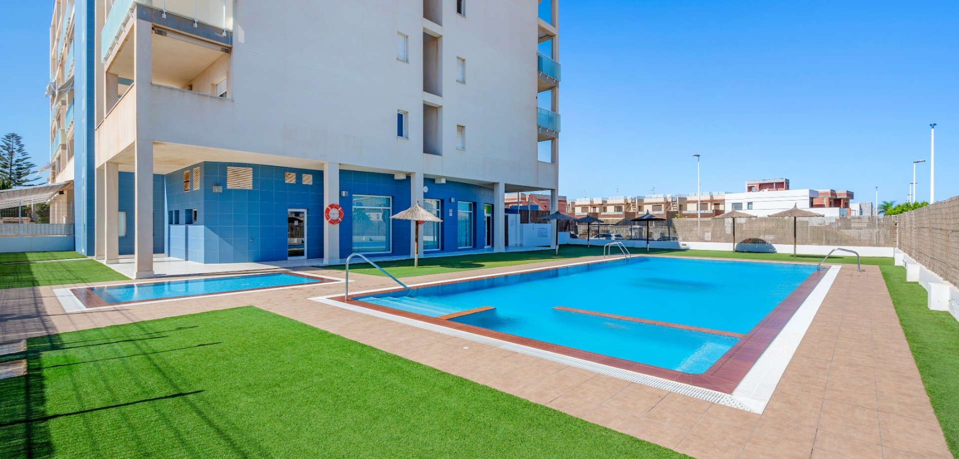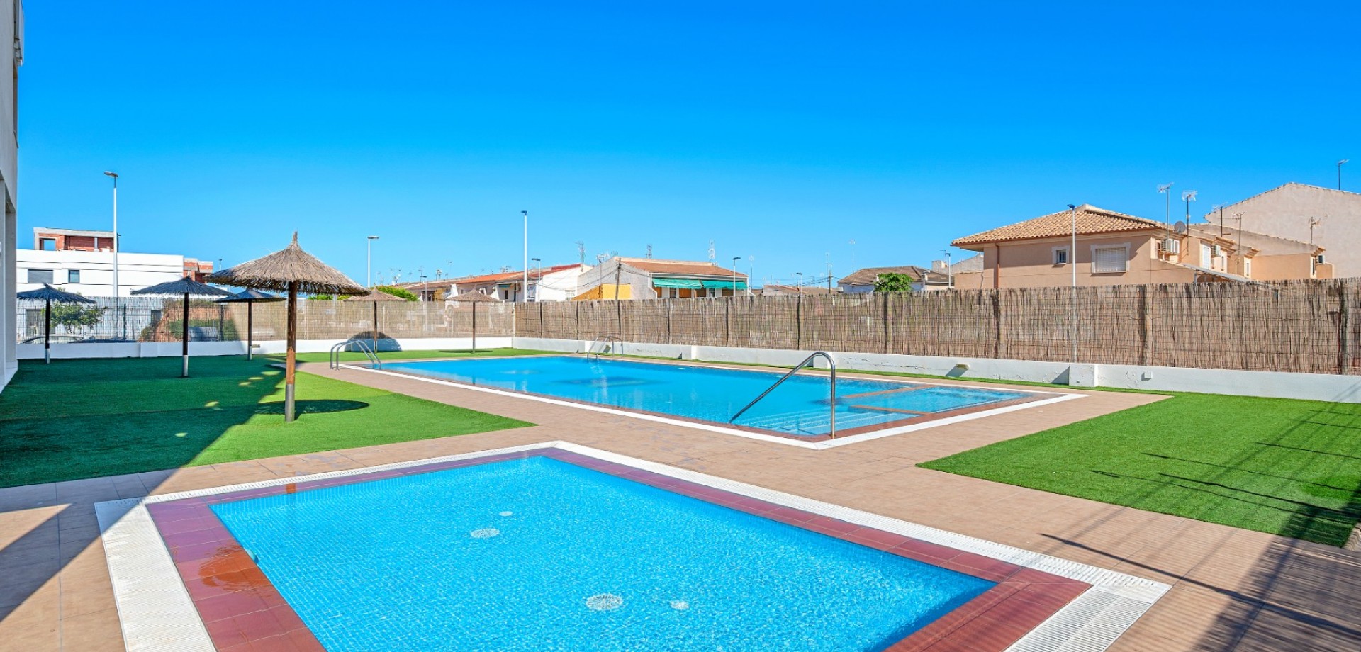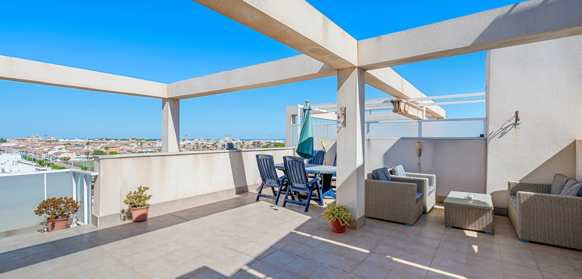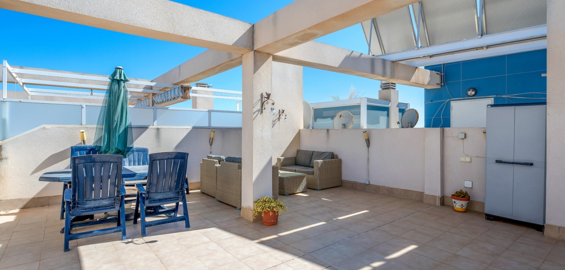 Spain1 proudly presents this spectacular penthouse apartment with wonderful mountain and seaviews, just 250 meters from the sea! This bright apartment has a modern open-plan kitchen, a spacious living-dining room, two spacious bedrooms with fitted wardrobes and two bathrooms. The apartment has a big roof terrace of 65 m2 where you can during the day enjoy the spanish sunshine, and also spend nice evenings with family and friends. In the apartment there is a ducted air conditioning system offering heating and cooling throughout the whole apartment. The apartment is sold fully furnished. There is a community pool for adults and also a childrens pool within the complex. A short walk from the apartment you find the beaches of Mar Menor and Lo Pagan. Here you also find a long promenade along the sea. Along this promenade you also find a lot of restaurants and bars. With excellent access to the AP-7 motorway and only 35 minutes to Murcia Airport and 50 minutes to Alicante Airport, this home is ideal for both year-round living and relaxing holidays. Don't miss the opportunity to live in a privileged area. Contact us today to book your viewing!