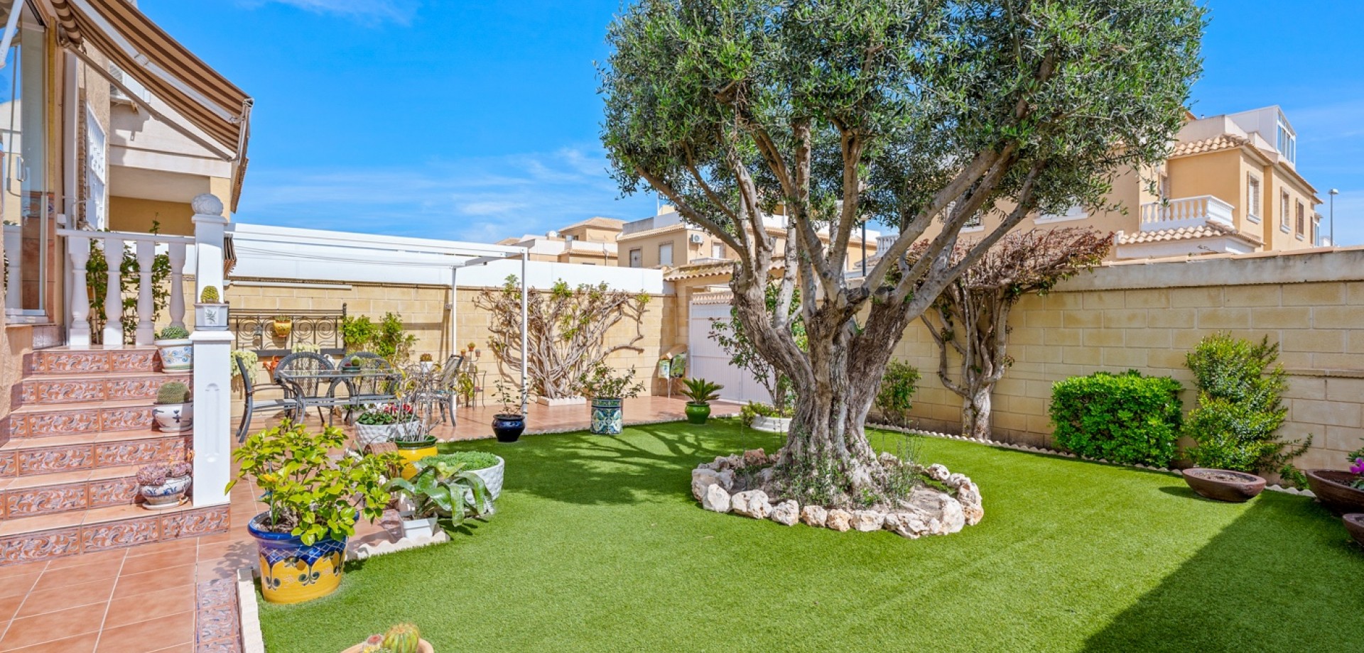 Discover this magnificent corner townhouse, a unique opportunity for those seeking spaciousness, comfort, and an unbeatable location. From the moment you step inside, the property captivates with its meticulously maintained private garden, perfect for enjoying the Mediterranean climate year-round. It also includes a parking space within the property for your convenience. Upon entering the house, you are greeted by a fully glazed terrace, a versatile space ideal as a relaxation area, winter dining room, or reading nook. Next, you'll find a bright living-dining room that seamlessly integrates with a separate, functional, and well-distributed kitchen. On this same floor, there is also a convenient guest toilet. Upstairs, you'll find the sleeping area, comprising three bedrooms and a separate full bathroom. One of the bedrooms boasts a private balcony, an intimate corner where you can enjoy the fresh air and tranquility. Going up one level, we access the private solarium, where you can enjoy pleasant, unobstructed views of the park—the perfect place to unwind, sunbathe, or enjoy evenings outdoors. The property also offers a large, habitable basement, a space with multiple possibilities: a recreation room, library, gym, office, or even a guest area. As an added bonus, the complex features a large, recently renovated communal swimming pool, complete with restrooms for added convenience, creating an ideal environment for relaxation and family life. The location is simply exceptional: just 50 meters away you'll find supermarkets, shops, restaurants, and a pharmacy, as well as excellent access to the road to Torrevieja and quick access to the AP-7 motorway towards Alicante Airport. A home that has it all: space, light, privacy, and a strategic location. Ideal as a primary residence, a second home, or a high-yield investment.