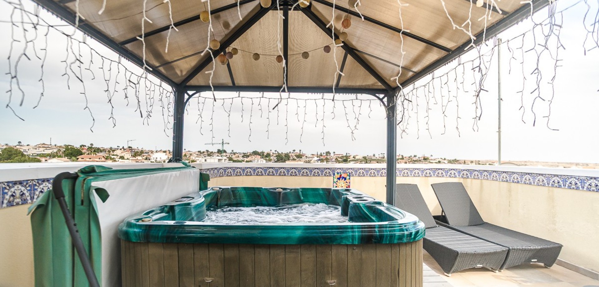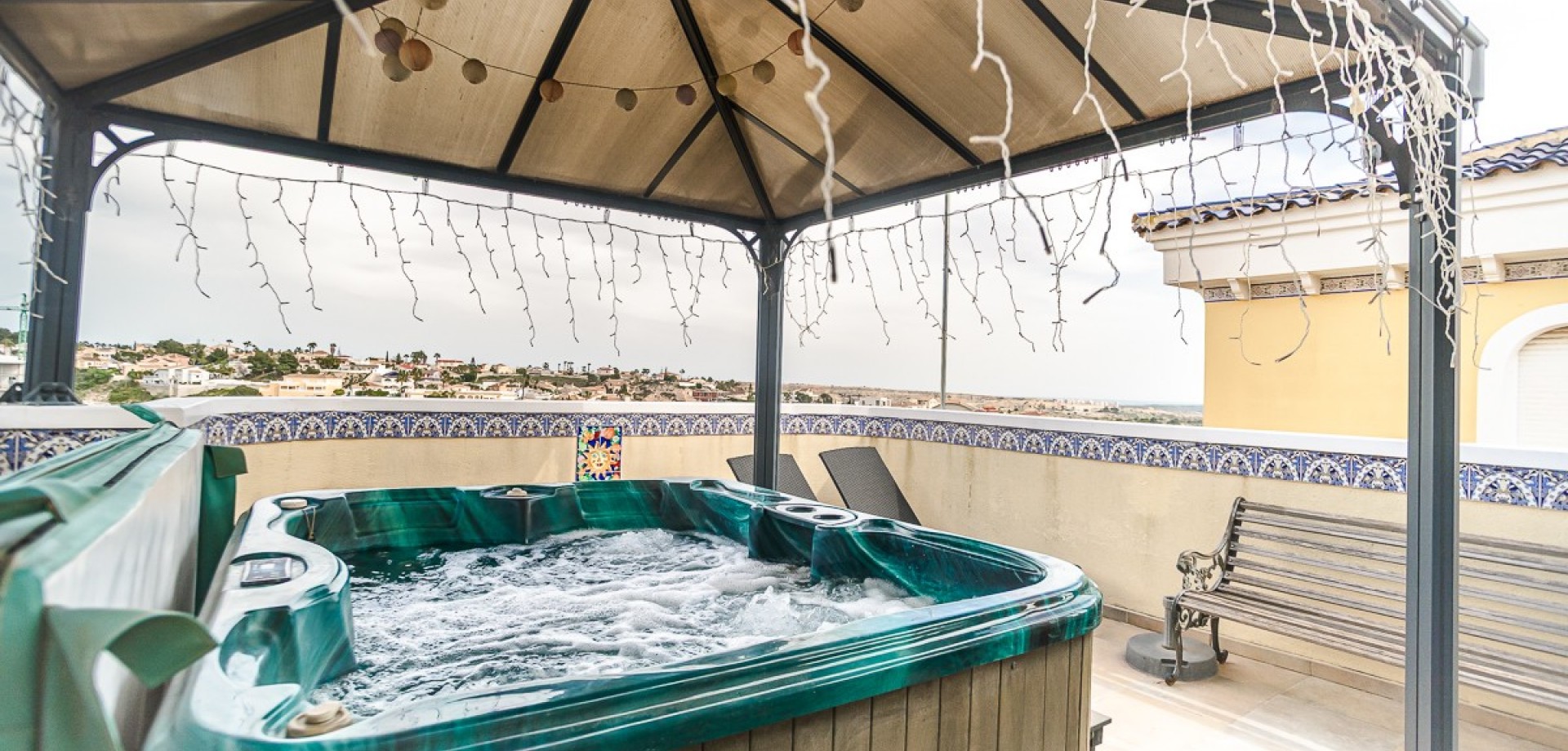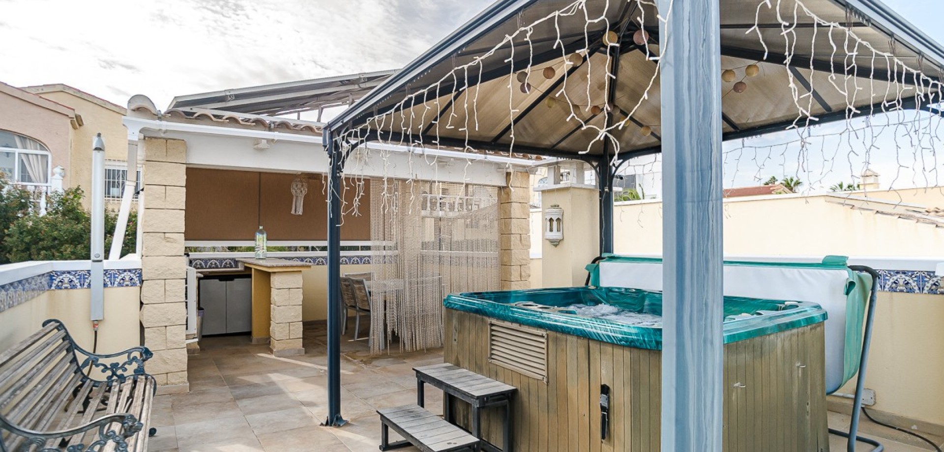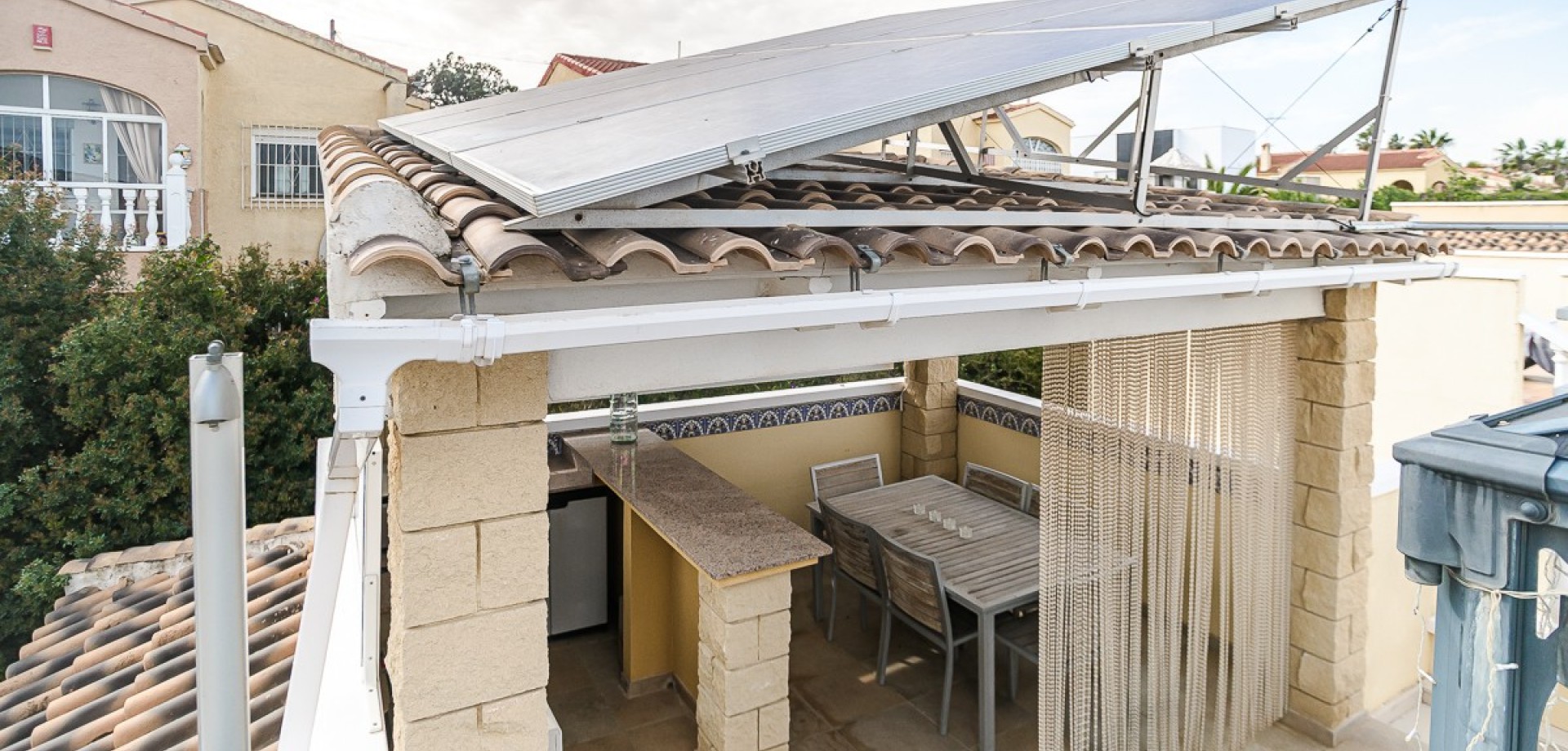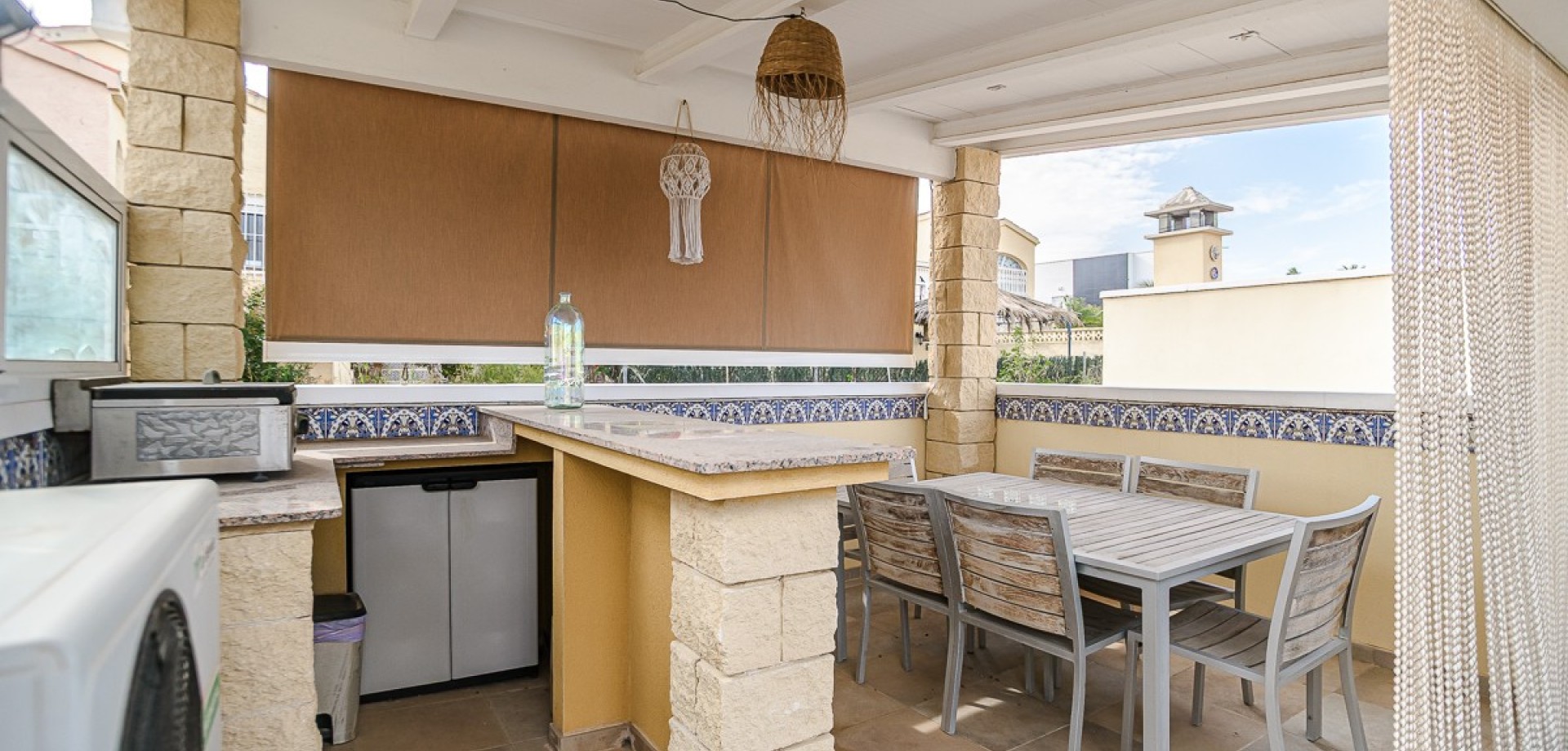 In a prime location in La Marina, we find this beautiful detached villa with a guesthouse and views towards the sea in Guardamar del Segura. Quietly situated, yet within walking distance of shops, restaurants, and all amenities, the perfect balance between comfort and vibrancy. The house is spread over two levels and offers a surprisingly flexible layout. On the ground floor, there is a fully furnished guest house, ideal for family, friends, or rental. The main residence on the first floor exudes light and space, with a cozy living and dining room, open kitchen, and direct access to a spacious terrace with a beautiful view. A unique extra is the private elevator between the floors, which ensures extra comfort and accessibility. As the icing on the cake, the villa features a spacious roof terrace with a pergola, summer kitchen, and jacuzzi—the perfect place to enjoy the Mediterranean lifestyle and the sea view. In addition, the home is equipped with solar panels, ensuring an energy-efficient and sustainable lifestyle, ideal for those who want to live permanently in Spain. For extra comfort, air conditioning (hot/cold) is available, as well as a cozy pellet stove, perfect for cooler winter evenings. Outside, you will find a low-maintenance garden, private parking, and access to a communal swimming pool. A versatile home that is perfect as a permanent residence, holiday home, or investment. Interested? Feel free to contact us; we would be happy to let you experience this home for yourself.