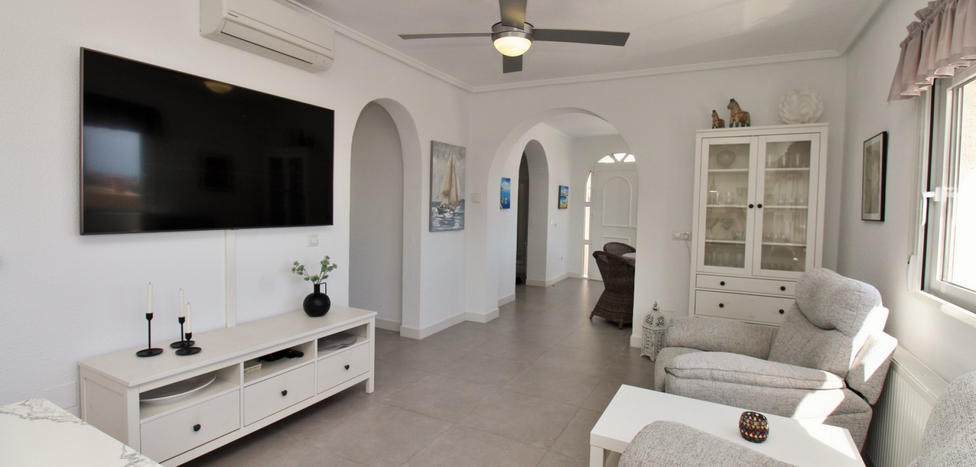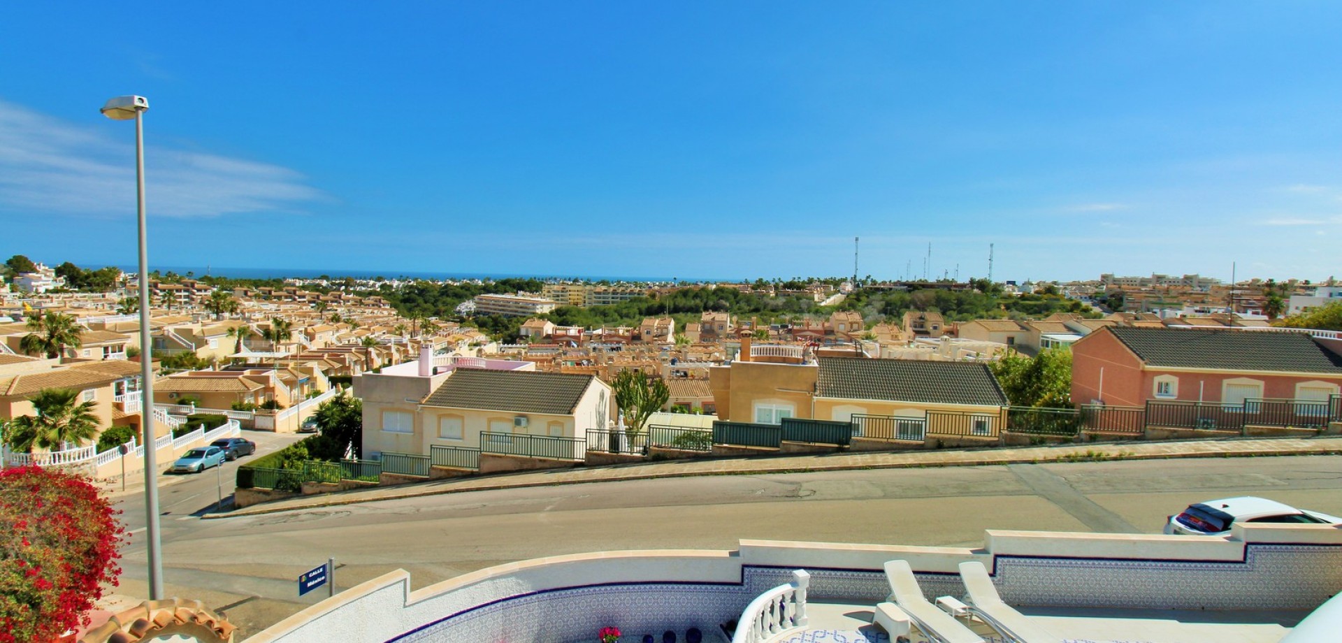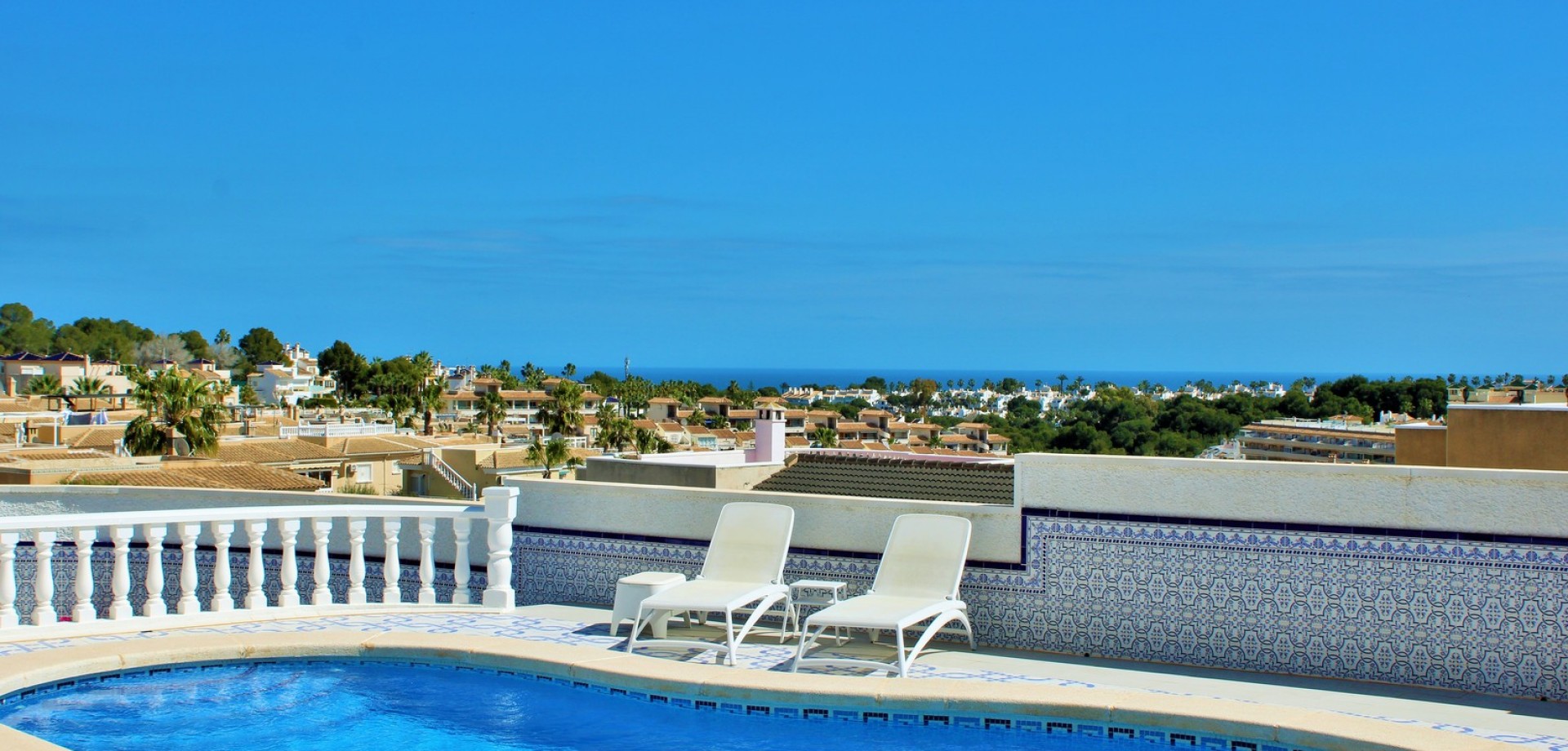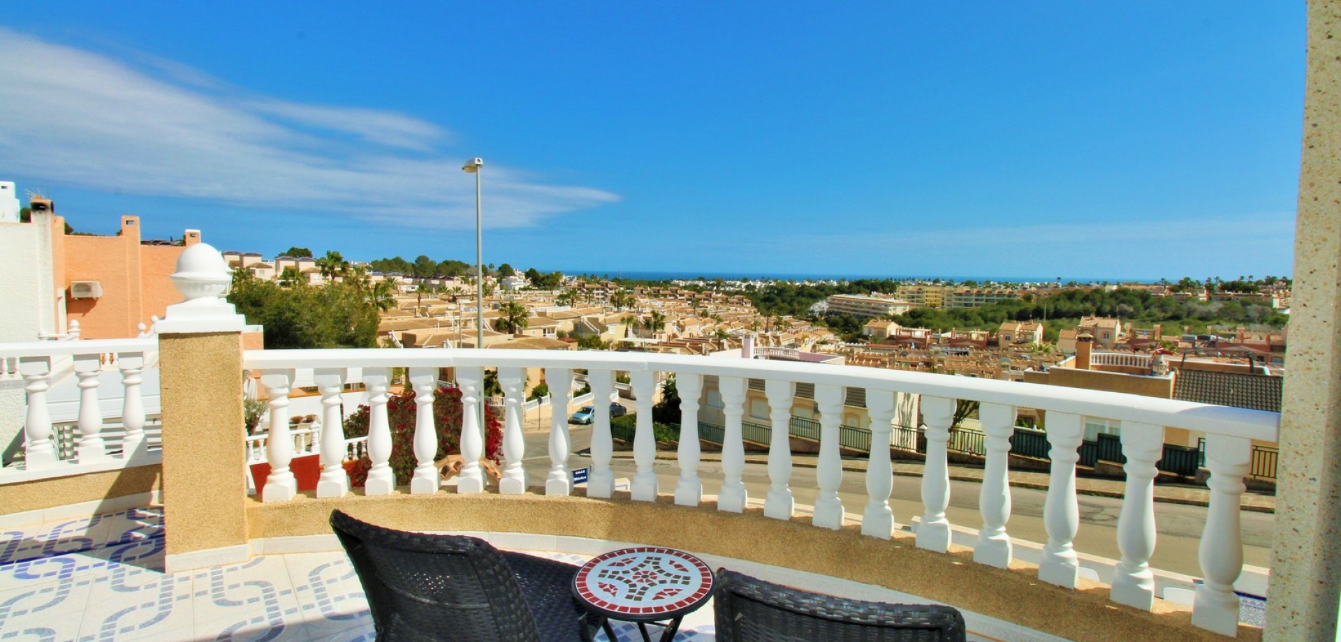 This exceptional detached villa is set on a generous private plot within El Presidente, Orihuela Costa, and stands out for its stunning, unobstructed sea views from all aspects of the property, including the main living areas, terraces, and pool area. Designed for both comfort and flexibility, the property offers multiple independent living spaces, making it ideal for permanent living, visiting guests, or extended family use. The main house has been tastefully renovated and comprises a bright lounge and dining area with an open-plan modern kitchen, one double bedroom with fitted wardrobes, and a stylish bathroom with walk-in shower. There is also an additional sitting room with WC, which can easily be converted into a second bedroom if required. This level benefits from new flooring throughout, as well as central heating and air-conditioning. Upstairs, the first annex provides a completely independent living space, featuring a lounge area, double bedroom, bathroom, and a private balcony with beautiful sea views. This level also benefits from central heating. The underbuild offers a further self-contained guest apartment, including a lounge-dining area, open kitchen, double bedroom, and a bathroom with walk-in shower — ideal for visitors or rental potential. Externally, the property is perfectly set up for enjoying the Mediterranean lifestyle, with a heated private swimming pool, jacuzzi, and a large summer house complete with a fully equipped kitchen inside, creating the perfect space for entertaining. There is also a separate outdoor shower cabin, along with a private garage with electric door and gated entrance. Ideally located within walking distance to Villamartin Plaza and golf course, as well as La Fuente commercial centre, the property is also just a short drive to the beaches of the Orihuela Costa and Zenia Boulevard shopping centre.