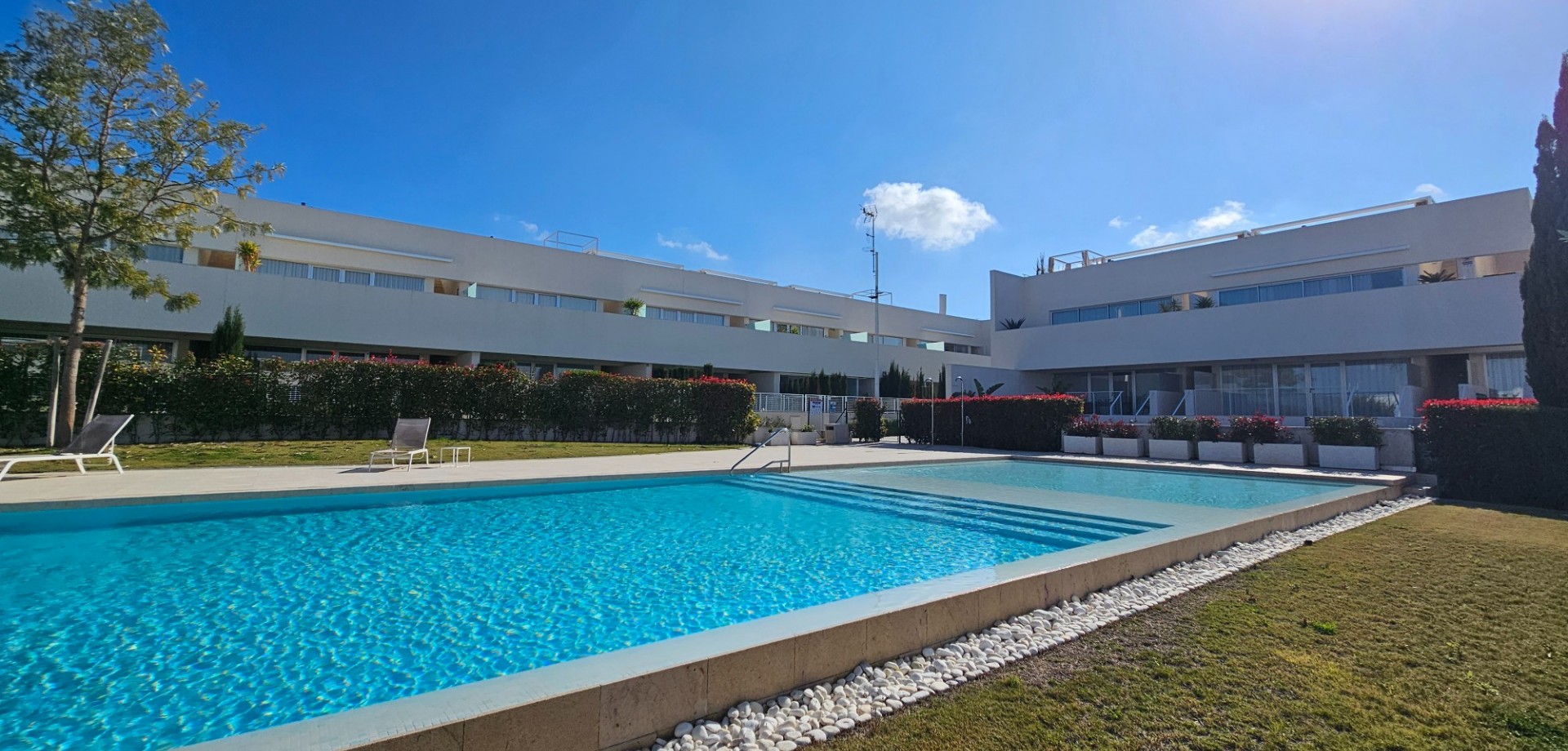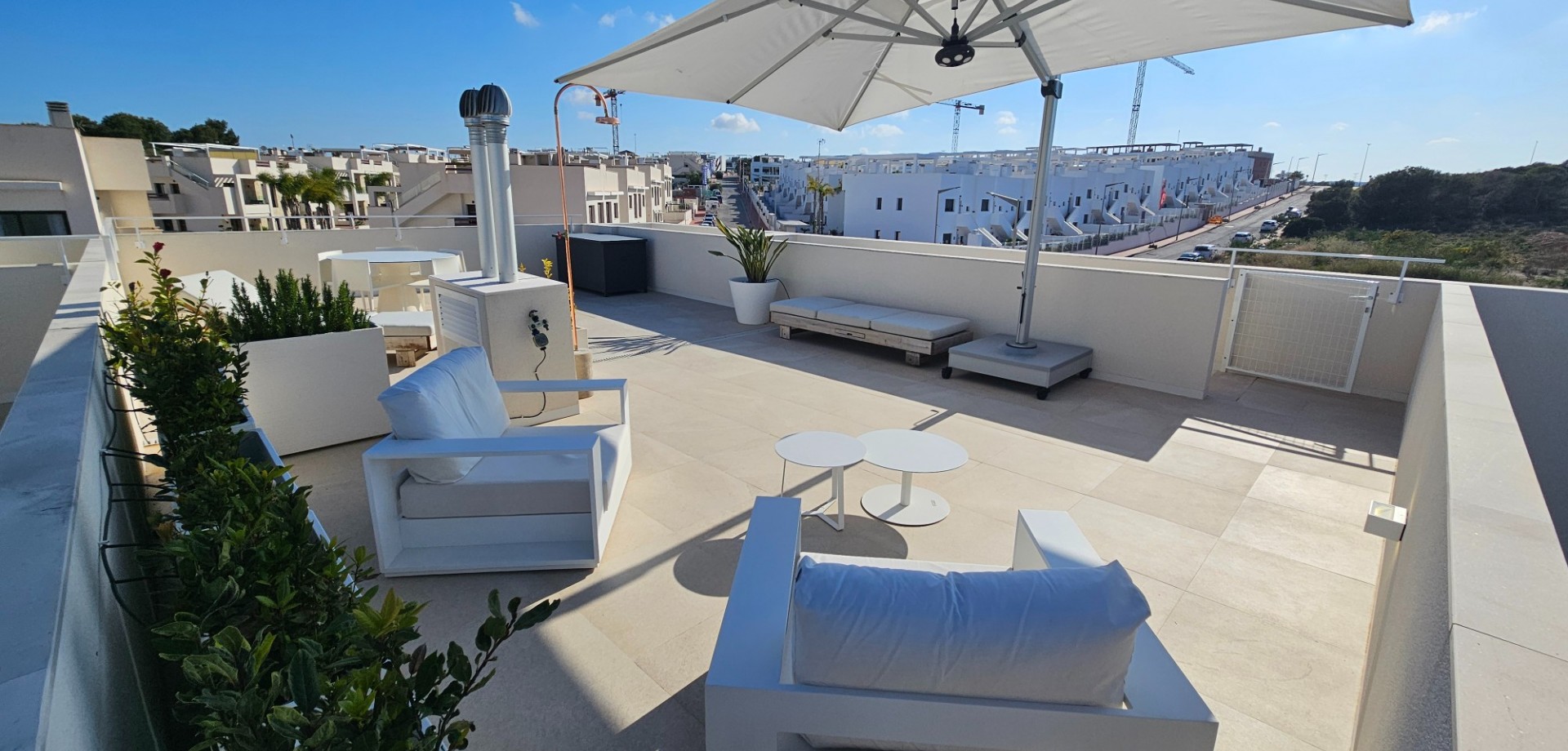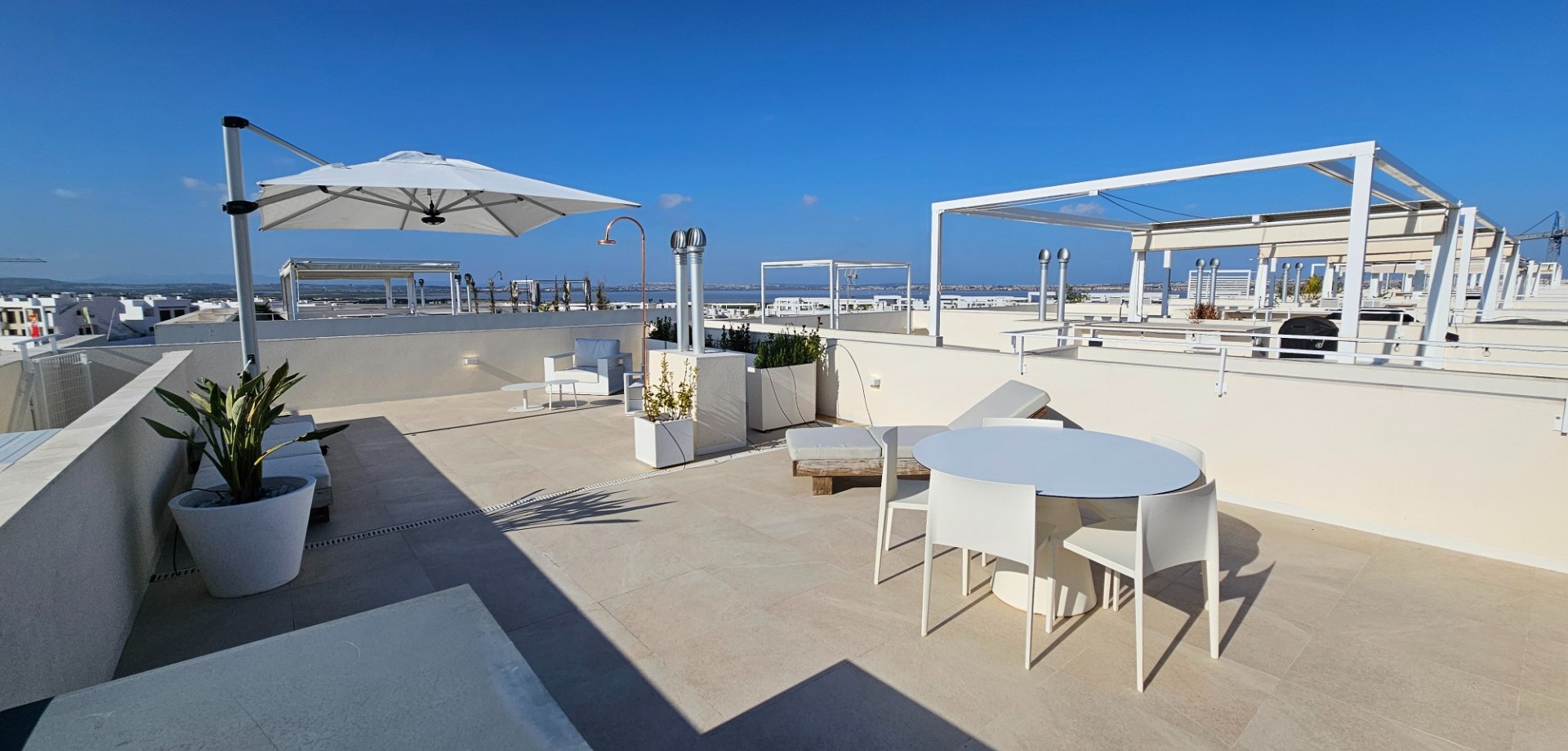 Located less than 4 kilometers from the Mediterranean Sea, we find this beautiful apartment. Built in 2023, it features 2 bedrooms, 2 bathrooms, a spacious roof terrace, a parking space, and a storage unit. The front balcony faces northeast, overlooking the communal garden, swimming pool, and the salt lake of Torrevieja beyond. Additionally, there is a spacious roof terrace perfect for soaking up the Spanish sun. A unique feature of this property is that it is the last home in the row, meaning you have neighbors on one side rather than both. The home has been used very little and is in virtually new condition. The property is being sold fully furnished as long as the asking price is met. Contact us for more information!