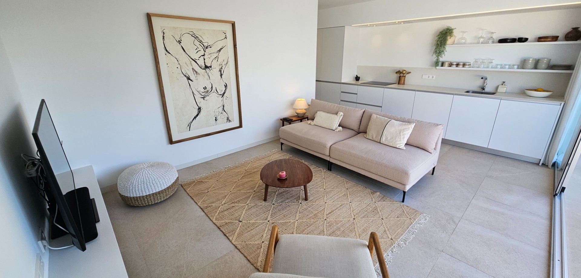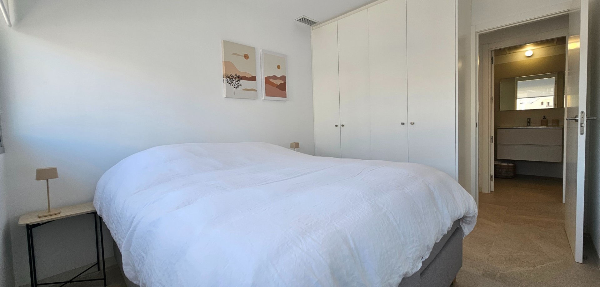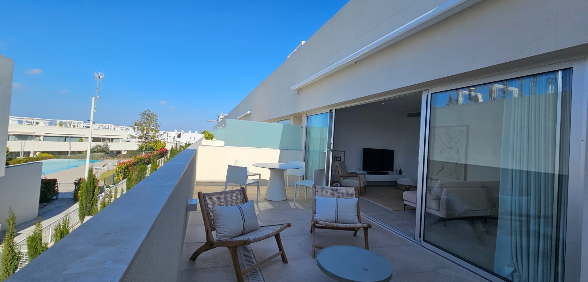 Located less than 4 kilometers from the Mediterranean Sea, we find this beautiful apartment. Built in 2023, it features 2 bedrooms, 2 bathrooms, a spacious roof terrace, a parking space, and a storage unit. The front balcony faces northeast, overlooking the communal garden, swimming pool, and the salt lake of Torrevieja beyond. Additionally, there is a spacious roof terrace perfect for soaking up the Spanish sun. A unique feature of this property is that it is the last home in the row, meaning you have neighbors on one side rather than both. The home has been used very little and is in virtually new condition. The property is being sold fully furnished as long as the asking price is met. Contact us for more information!