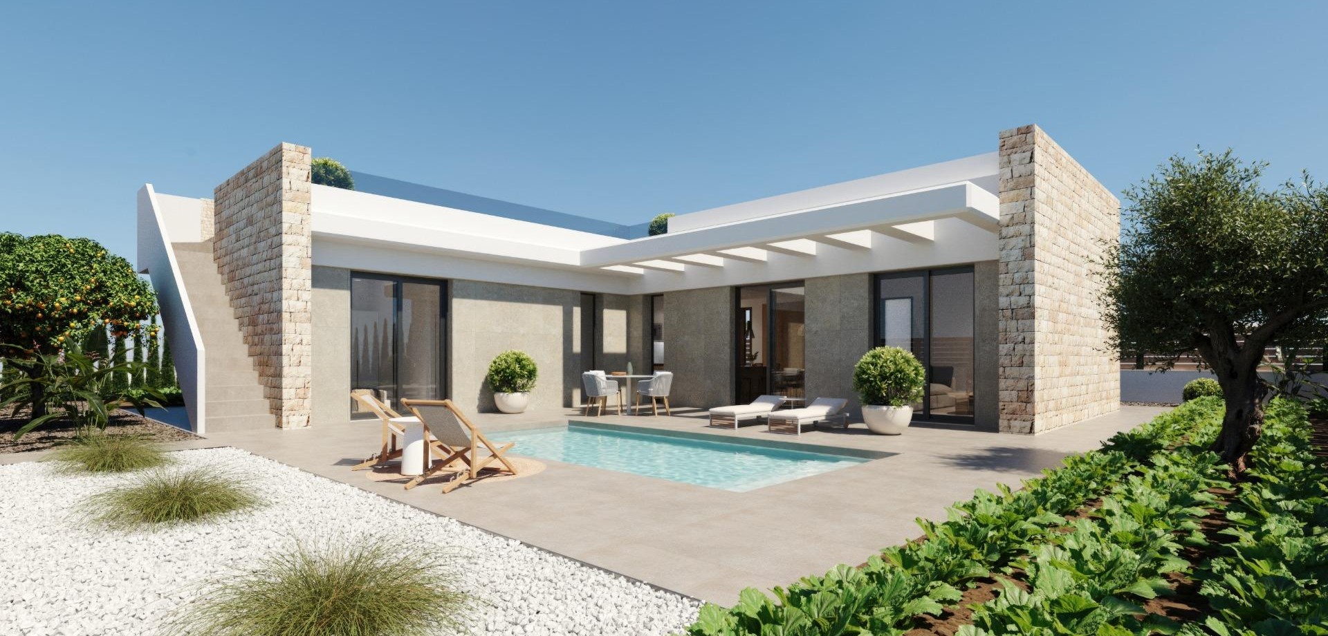 Новые виллы в гольф-курорте Hacienda del Álamo, Мурсия Современные дома в природной и эксклюзивной обстановке Откройте для себя эти фантастические новые виллы в престижном гольф-курорте Hacienda del Álamo — закрытом жилом комплексе в регионе Мурсия, который сочетает в себе спокойствие, безопасность и полный набор удобств. Окруженный природой и обладающий прекрасным климатом, этот комплекс идеально подходит для тех, кто ищет спокойный образ жизни без ущерба для комфорта. Одноуровневые виллы с 3 спальнями и солнечной террасой Комплекс состоит из 39 вилл на участках площадью от 380 м². Все дома располагают 3 спальнями и 2 полностью оборудованными ванными комнатами на одном уровне, а также террасой с частным бассейном и частным солярием на крыше с видом на поле для гольфа. Высококачественная отделка и гарантированный комфорт Дома спроектированы с использованием высококачественных материалов и созданы для обеспечения энергоэффективности и благополучия: Наружные столярные изделия с терморазрывом Горячая вода через аэротермальную систему Предварительная установка для канальной системы кондиционирования Ванные комнаты с туалетным столиком, зеркалом и душевой перегородкой Частный бассейн Курорт с полным набором удобств и полем для гольфа Hacienda del Álamo — один из самых многофункциональных комплексов на побережье Коста-Калида. Он включает: Профессиональное 18-луночное поле для гольфа Отель со спа-центром Супермаркет Рестораны и бары Спортивные площадки и зеленые зоны Круглосуточная охрана Комплекс воссоздает атмосферу традиционной средиземноморской деревни с тихими улочками и тщательно продуманной планировкой. Выгодное расположение рядом со всем необходимым Международный аэропорт Мурсии (Корвера): 20 км Дополнительные поля для гольфа: менее 10 км Картахена: 35 км Пляжи Мар-Менор: 30 км Торговый центр Espacio Mediterráneo: 28 км Порт Масаррон: 40 км Живите со стилем на побережье Коста-Калида Эти виллы представляют собой отличную возможность для проживания или инвестиций в одном из самых перспективных районов Мурсии. Свяжитесь с нами прямо сейчас и откройте для себя свой будущий дом в Hacienda del Álamo Golf Resort.