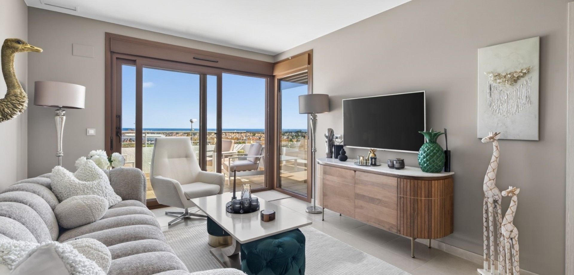 Ljus och modern designlägenhet med takvåningskänsla i Terrassa de Campamor Välkommen till denna unika takvåning i hjärtat av Terrassa de Campamor. Denna eleganta, designinredda lägenhet har en takterrass med panoramautsikt över Medelhavet. Med två ljusa sovrum, två moderna badrum med golvvärme och ett öppet, minimalistiskt kök som flyter in i ett ljust, inbjudande vardagsrum med tillgång till en privat terrass, är detta ett hem för dig som vill ha det där lilla extra. De gemensamma utrymmena är exceptionella - här hittar du två vackra pooler, en inbjudande park för barn och ett välutrustat gym. Restauranger och kaféer finns precis runt hörnet, och tillsammans ger detta en bekväm, lyxig livsstil i hjärtat av Costa Blanca. Läget är oslagbart. Bara 10 minuter med bil till den vackra stranden Playa de Glea och det populära köpcentret La Zenia, känt på Costa Blanca. Dessutom finns det flera kända golfbanor i omedelbar närhet, såsom Villa Martin, Campoamor, Las Ramblas och Las Colinas som har blivit utsedd till Spaniens bästa resort 5 år i rad. Kontakta oss idag för att boka en visning av denna vackra fastighet.